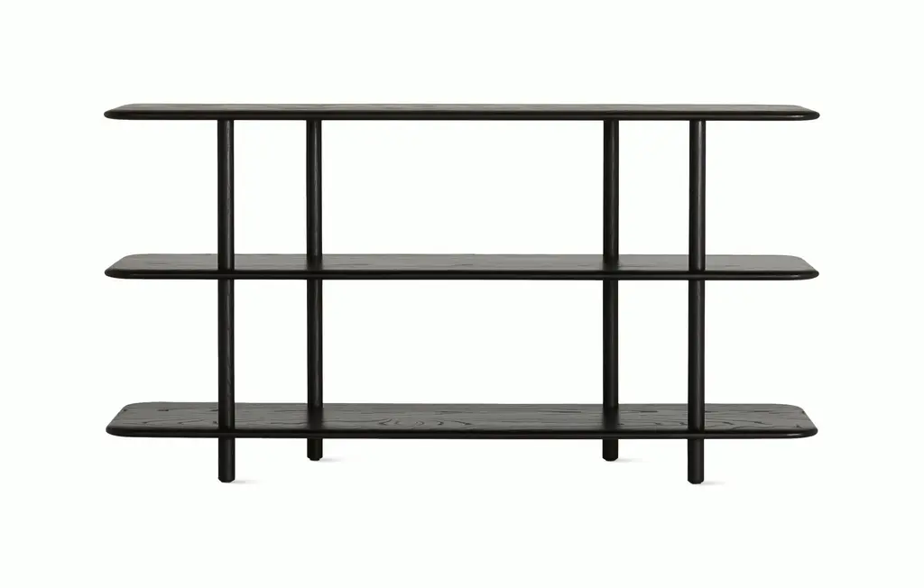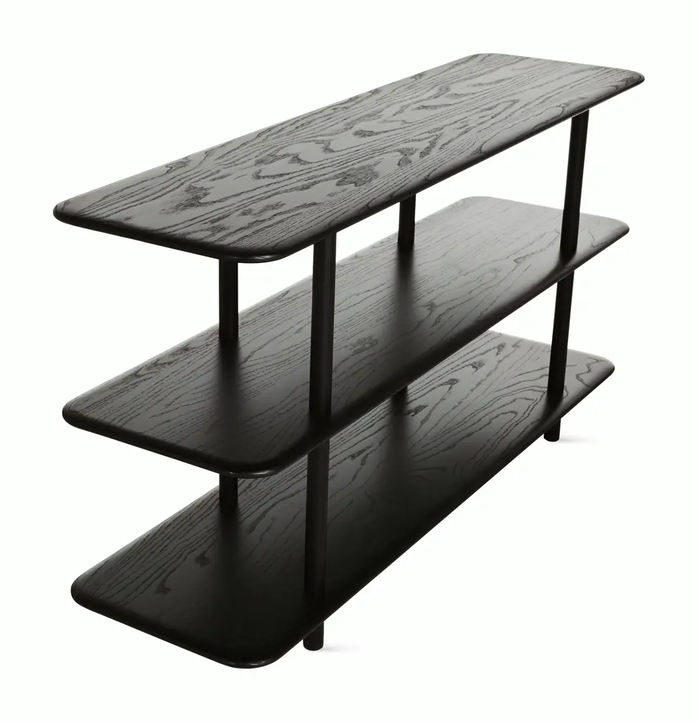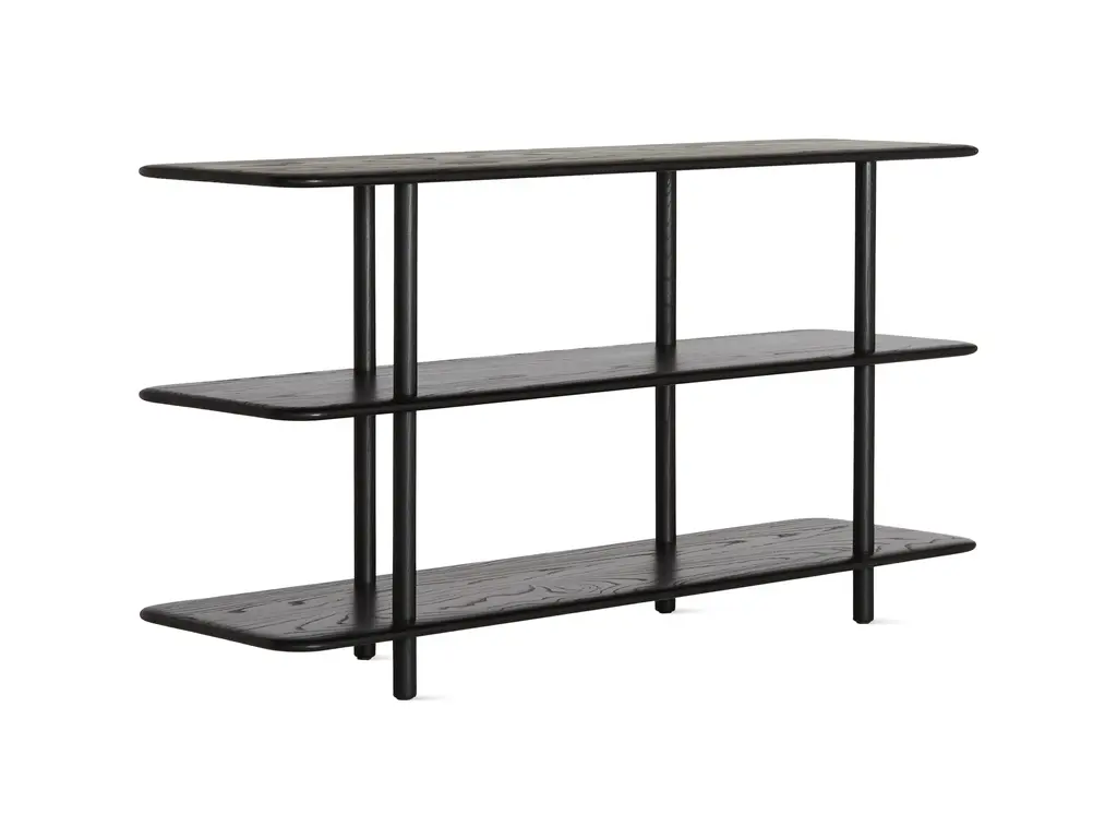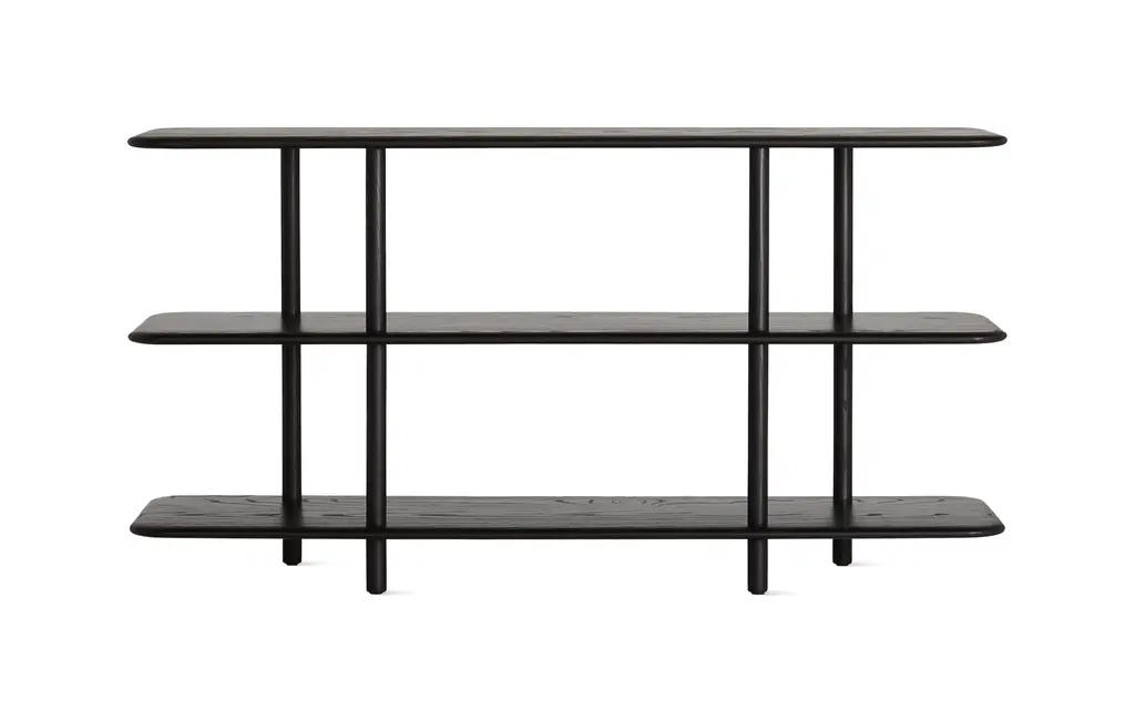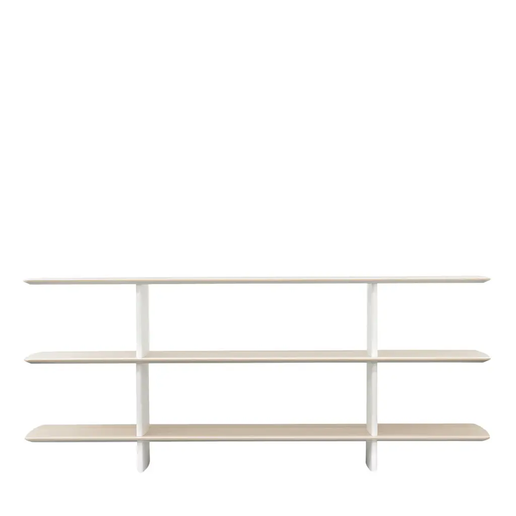 Inspired by early multiwing airplanes, gently curved edges give the shelves of Aero Shelving (2017) a soft sculptural quality, much like the wing of a plane. Aero is finished in a hand-applied pigment that keeps the wood grain visible. On the High Shelving, the bottom shelves are heavily weighted for stability. Made in Malaysia.