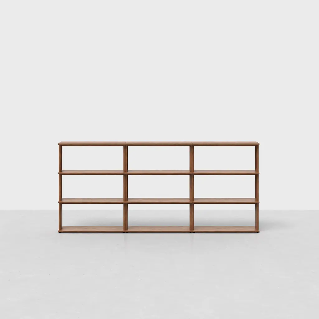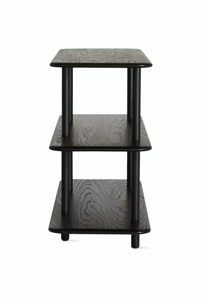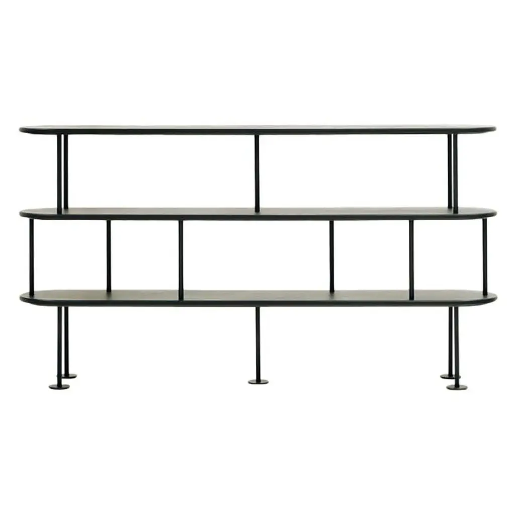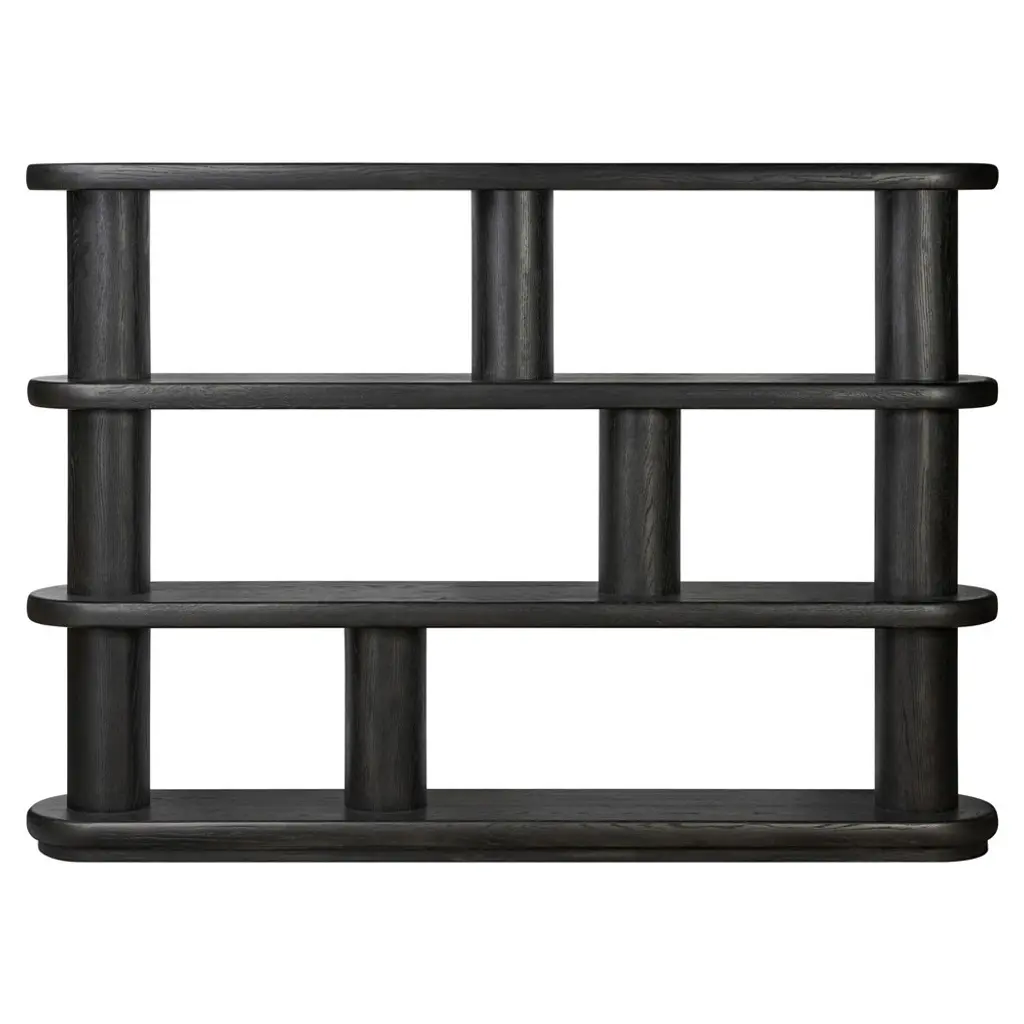 Inspired by early multiwing airplanes, gently curved edges give the shelves of Aero Shelving (2017) a soft sculptural quality, much like the wing of a plane. Aero is finished in a hand-applied pigment that keeps the wood grain visible. On the High Shelving, the bottom shelves are heavily weighted for stability. Made in Malaysia.