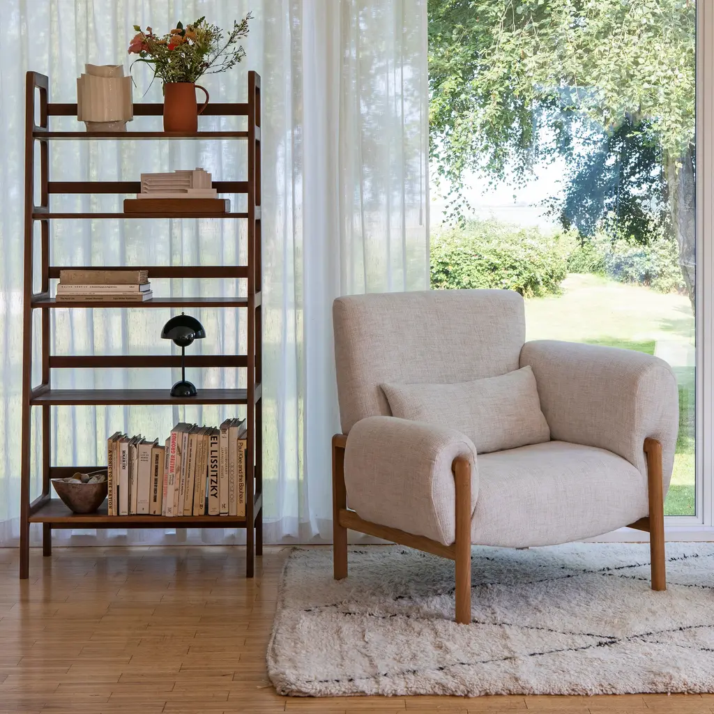A tall freestanding unit with 5 shelves makes for an impressively versatile addition to Kay + Stemmer’s mainstay Agnes collection for British maker SCP. Exhibiting a soft take on modernist style that emphasizes the appeal of its natural oak or walnut construction, the result is a visually pleasing and highly functional addition to any interior. Inspired by classical Scandinavian design, it’s also an enduring expression of expert craftsmanship, featuring radius edges and a gracefully tapered profile.