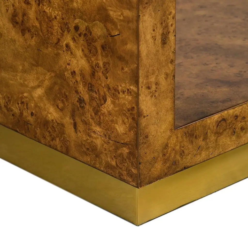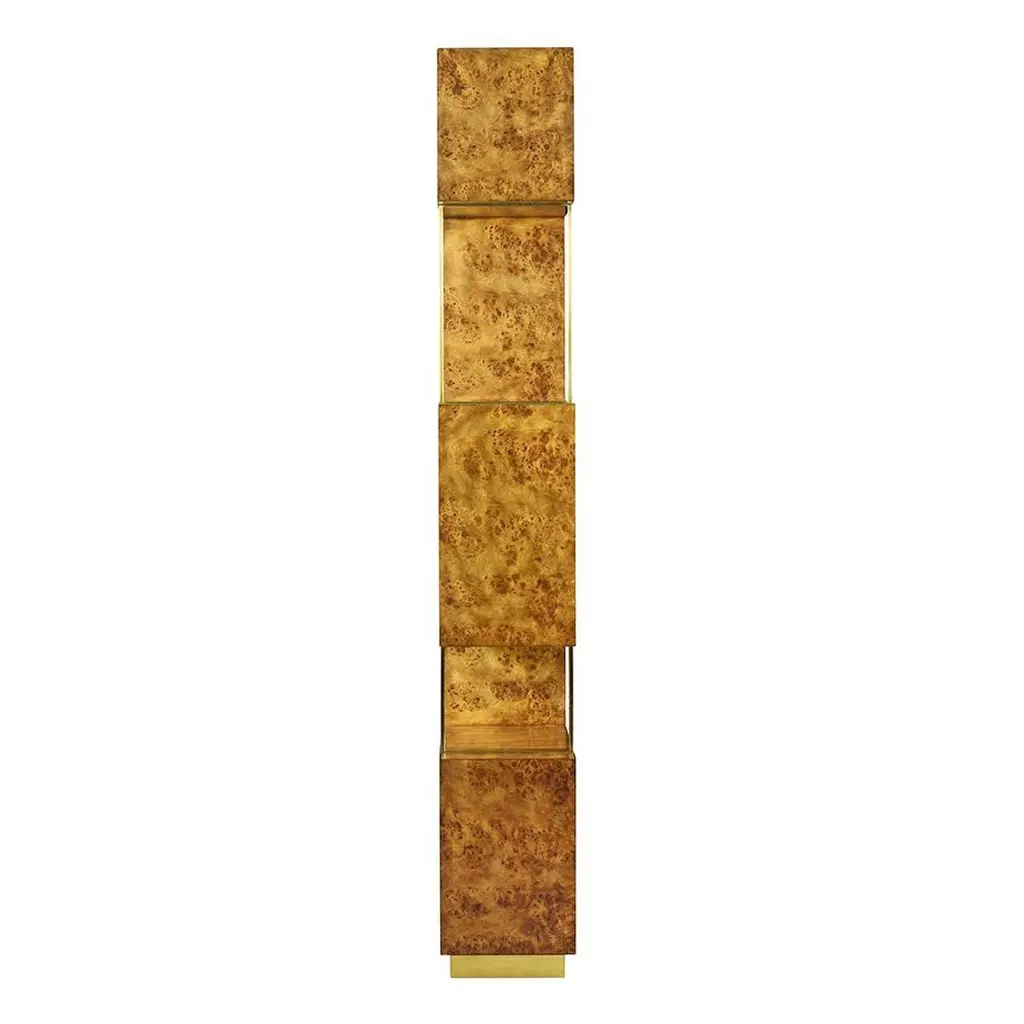 Showcasing a bold geometric design, this open shelving unit is crafted with luxurious golden mappa burl wood veneer and gleaming brass accents. Its asymmetrical tiers provide an elegant platform for displaying books, decor, and treasured collectibles, while the striking combination of materials exudes timeless Art Deco sophistication.Whether placed in a living room, office, or library, this étagère transforms any space into a gallery of refined style. A true statement piece for modern and classic interiors alike.Dimensions: 36" W x 13.25" D x 88.25" H
