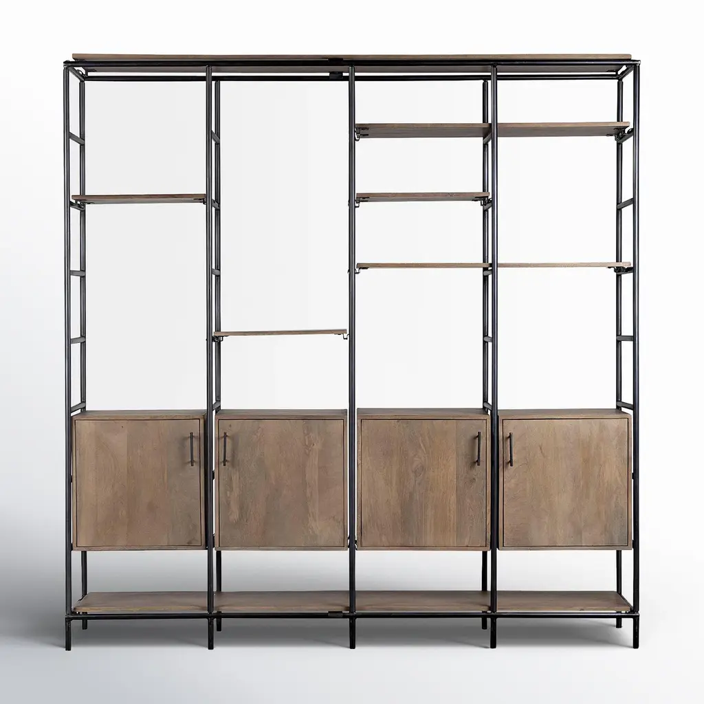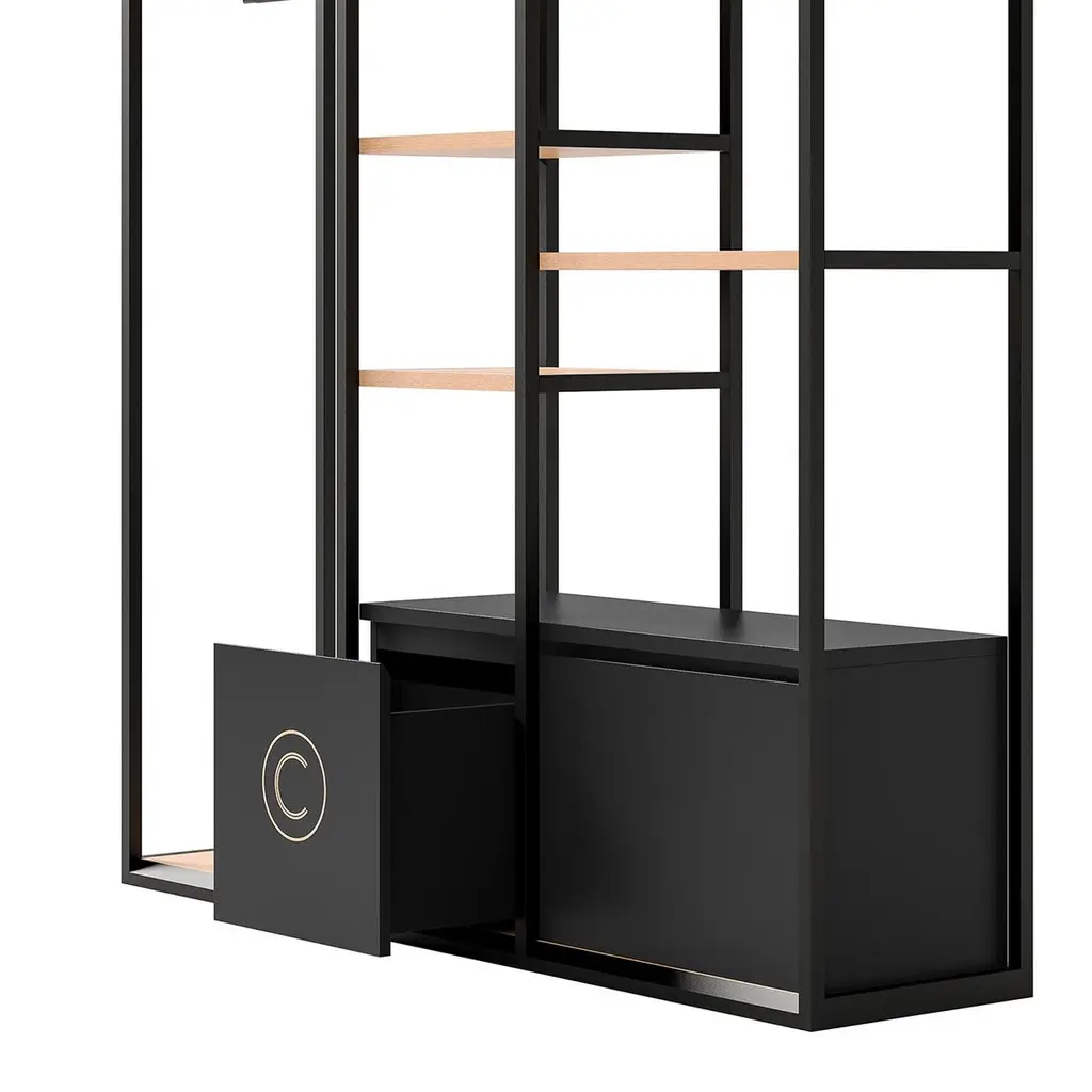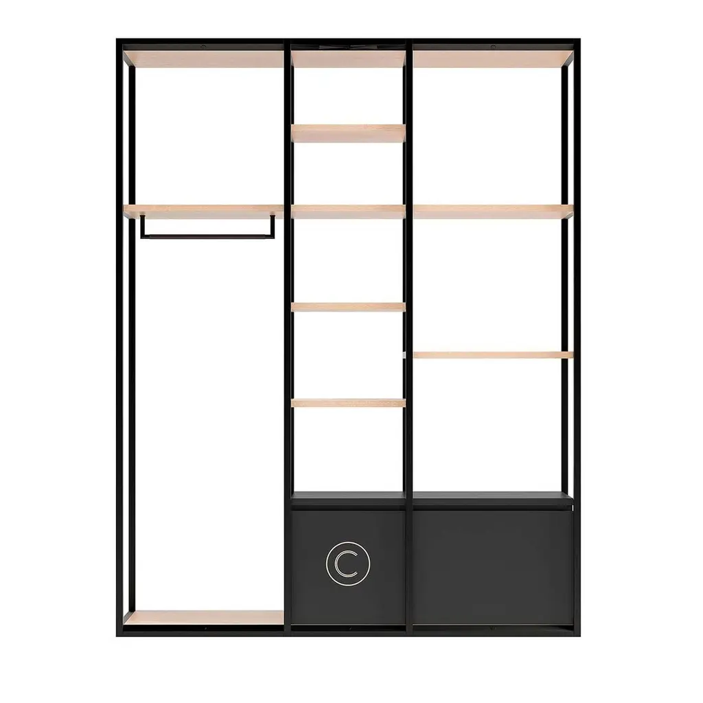 The Minimalist flair and floating appearance of this sophisticated shelving unit will add style to a modern and Minimalist bedroom. This eclectic piece is framed in black-finished metal with light veneered shelves and comprises three sections, each with different accessories, to provide a wide array of functional storage in an open Silhouette. The central column has four shelves and a bottom drawer, while the lateral sections include a hanging rod and two shelves with a bottom drawer. This versatile piece is the perfect solution for small residential spaces.