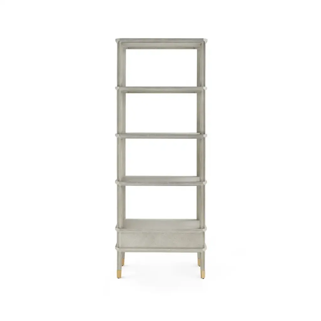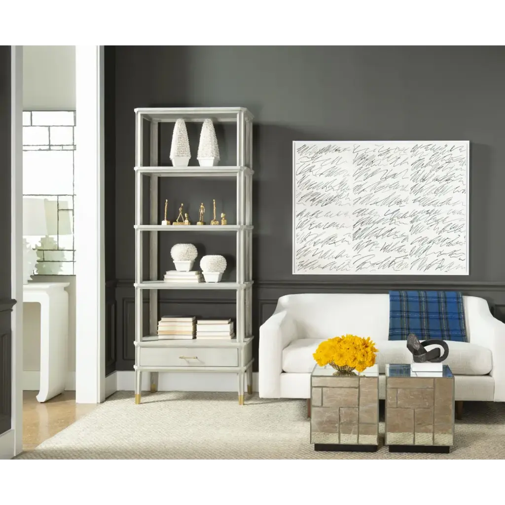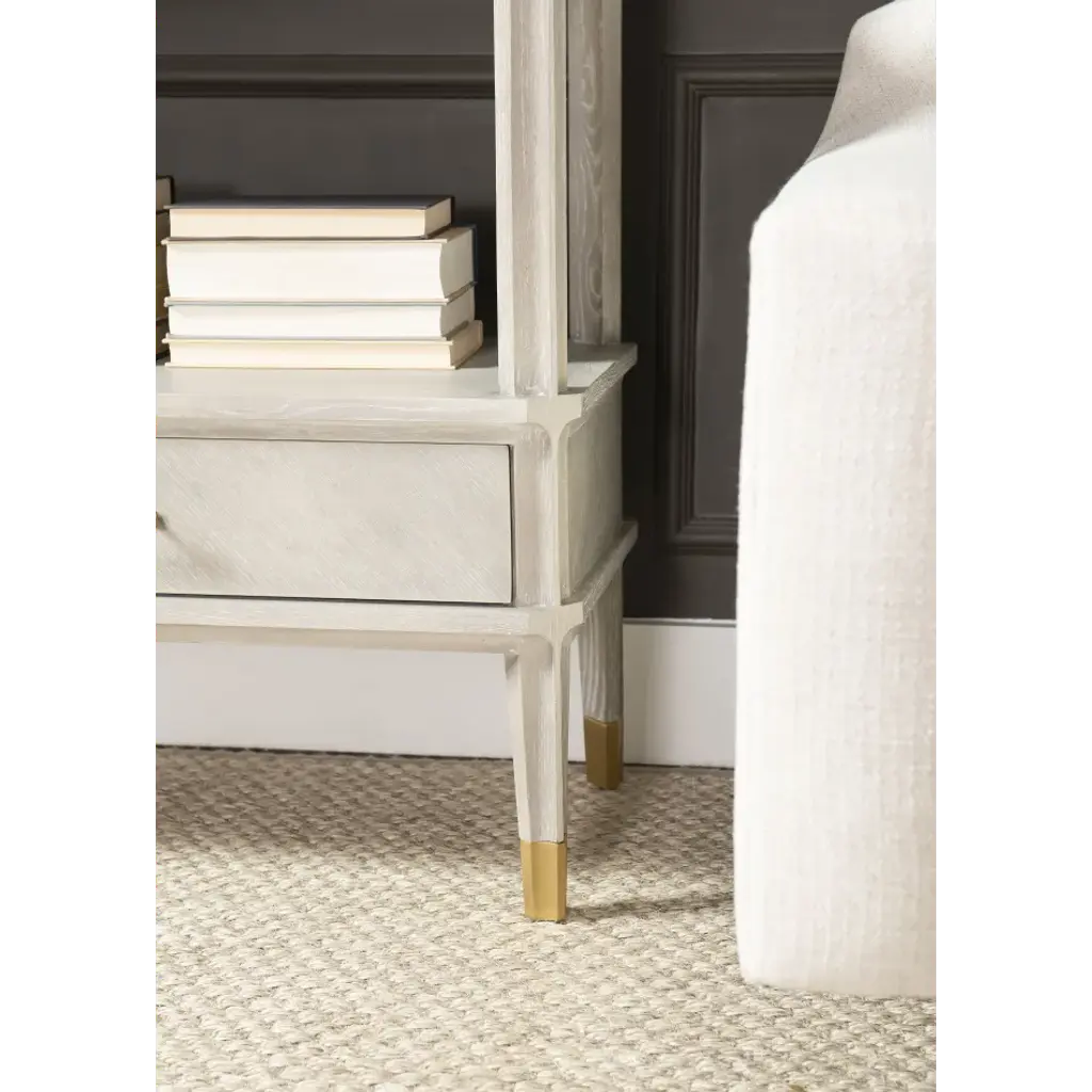 An ultimately elegant piece, the Bertram Etagere, comes in a light gray straight grain cerused oak or a natural bleached cerused oak with one hand-cast bronze drawer pull and sabot details. The shelving unit has one drawer for hidden storage and four open shelves for displaying decorative objects or books. Each shelf’s veneer top is chevron-patterned: carefully selected and laid by hand to highlight the oak grain’s intricate markings. The posts are hand-carved, made of quarter-sawn solid oak, and expertly sanded to taper with double-sided coving. Notice the coving detail carried to the bottom of each shelf. The oak Bertram Etagere is ultimately elegant, measuring around 68 inches in height. Float it in a room—as all sides of Villa & House furniture are finished—or nestle it up against a wall with decorative bookends to act as a library. The delicate craftsmanship in the Bertram Collection—like the chevron-pattern oak grain or the coved details—give each piece a light, elegant presence.