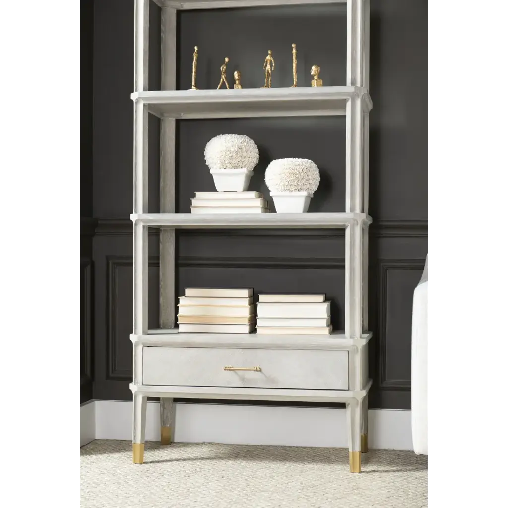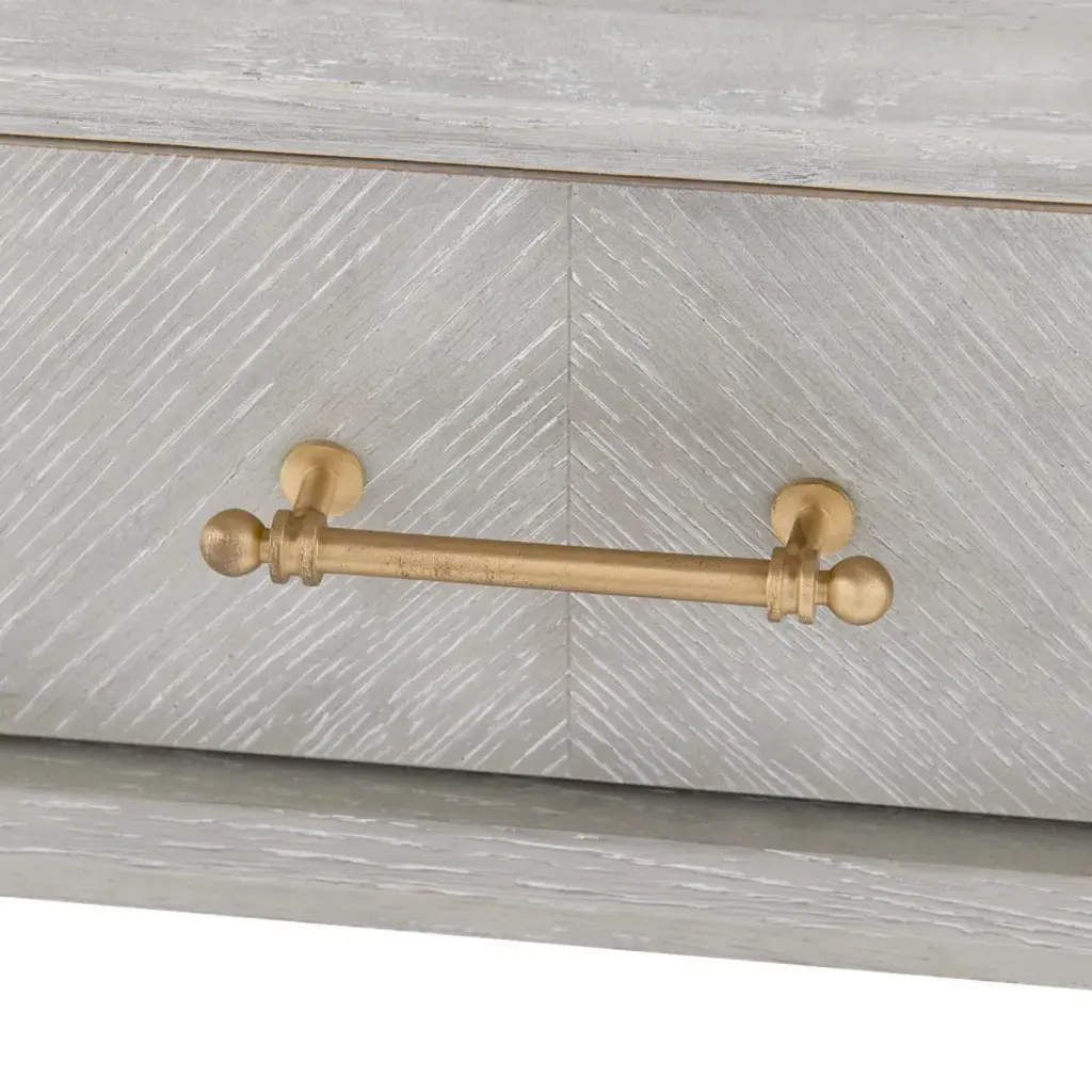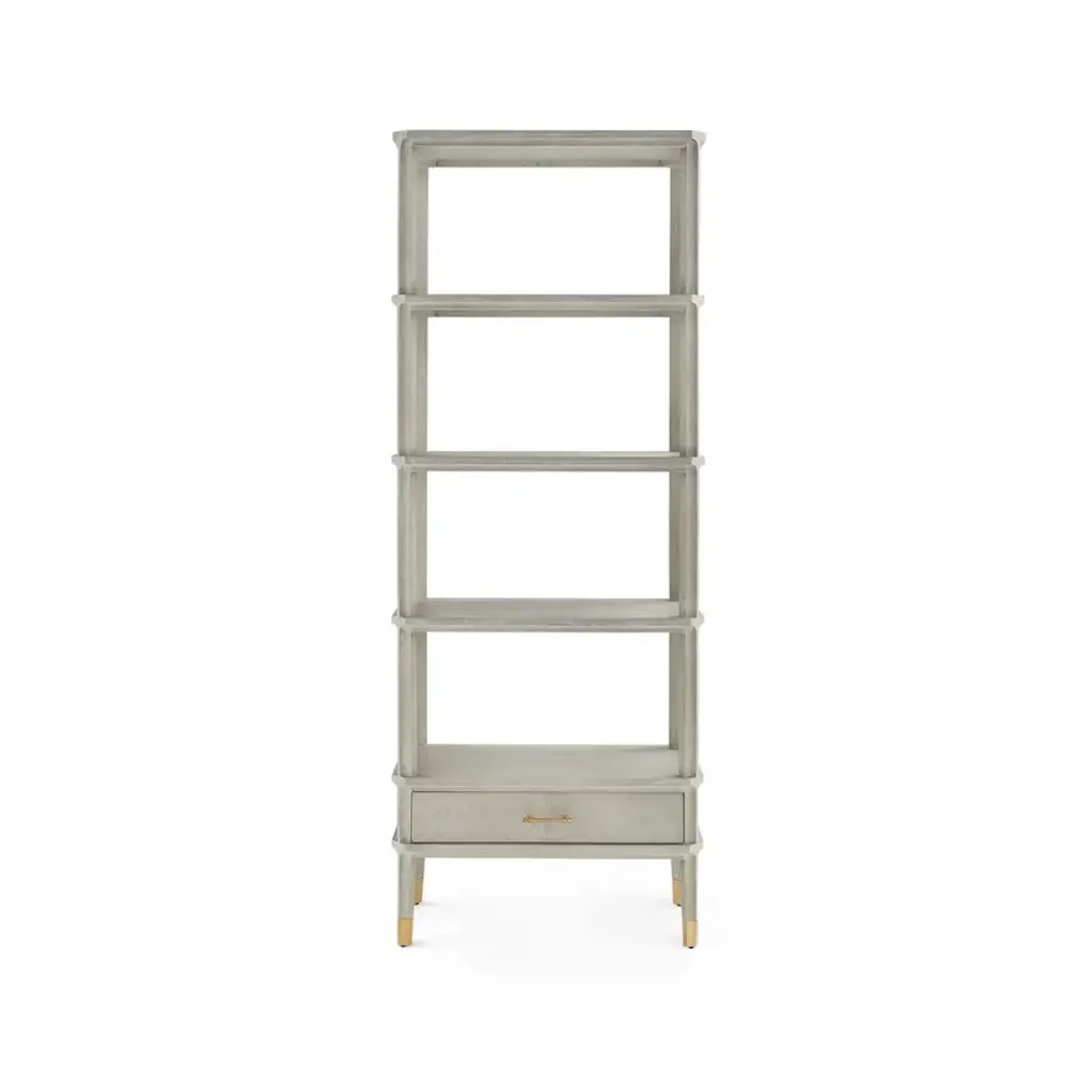 An ultimately elegant piece, the Bertram Etagere, comes in a light gray straight grain cerused oak or a natural bleached cerused oak with one hand-cast bronze drawer pull and sabot details. The shelving unit has one drawer for hidden storage and four open shelves for displaying decorative objects or books. Each shelf’s veneer top is chevron-patterned: carefully selected and laid by hand to highlight the oak grain’s intricate markings. The posts are hand-carved, made of quarter-sawn solid oak, and expertly sanded to taper with double-sided coving. Notice the coving detail carried to the bottom of each shelf. The oak Bertram Etagere is ultimately elegant, measuring around 68 inches in height. Float it in a room—as all sides of Villa & House furniture are finished—or nestle it up against a wall with decorative bookends to act as a library. The delicate craftsmanship in the Bertram Collection—like the chevron-pattern oak grain or the coved details—give each piece a light, elegant presence.
