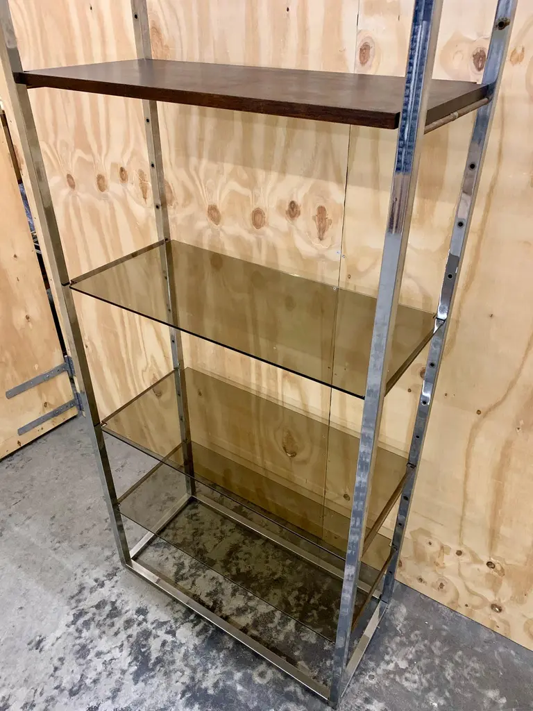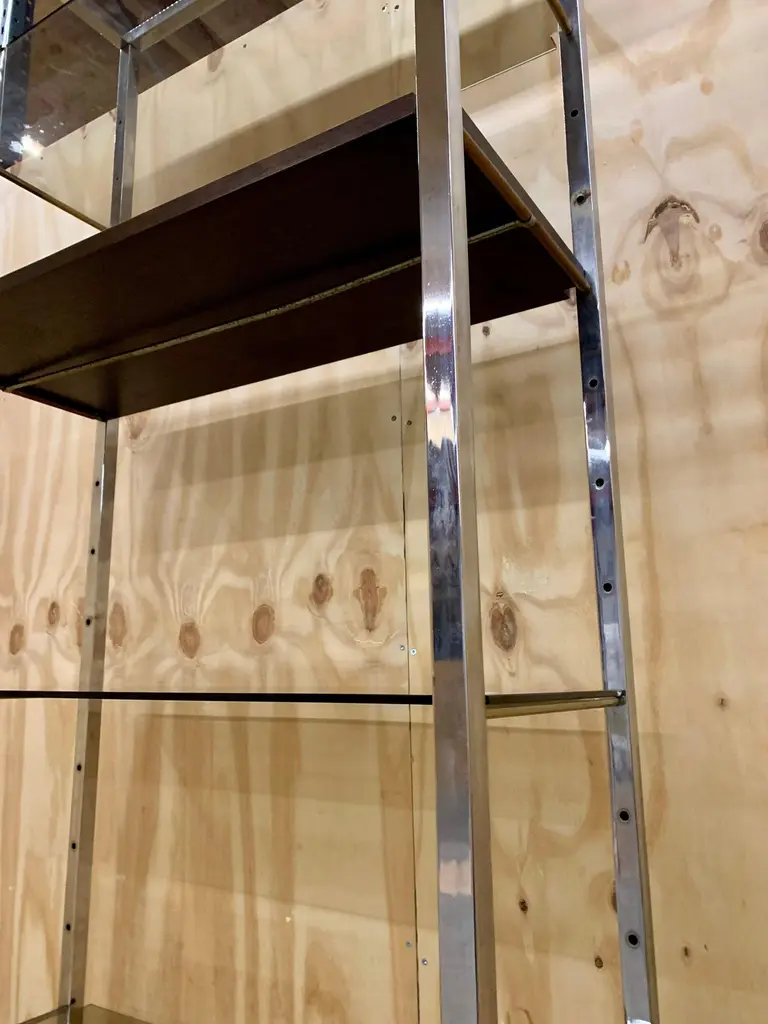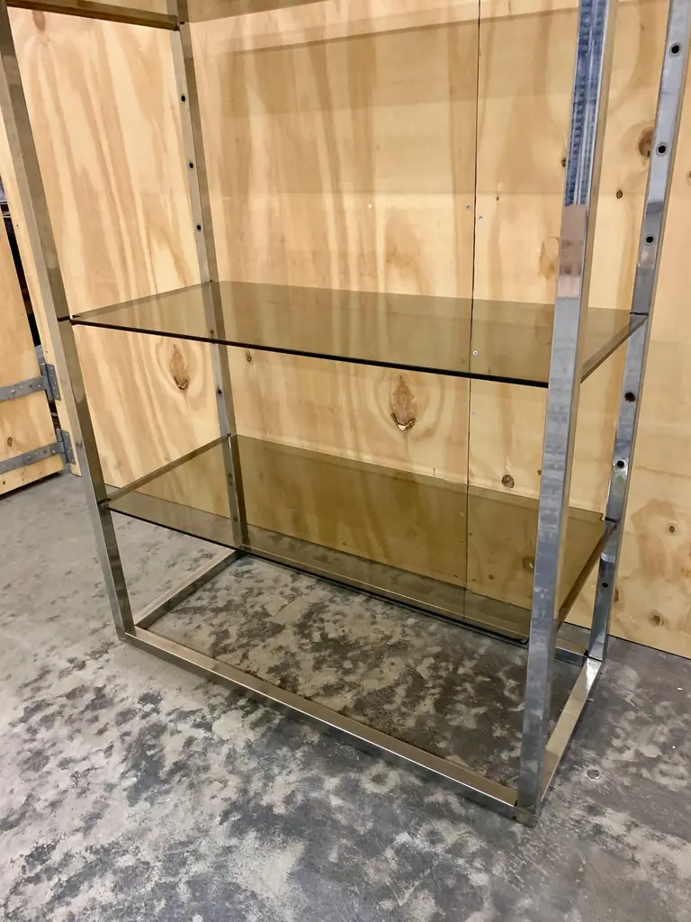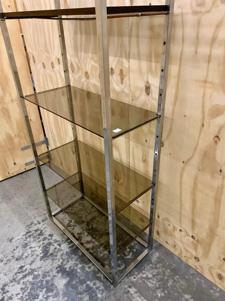 Cool vintage tall chrome book case from 1960-1970s. There are 4 smoke colored glass shelves and 1 wooden shelf, all movable, in each book case. At the moment we have 4 pieces on stock at our remote warehouse.Price is pr. book case