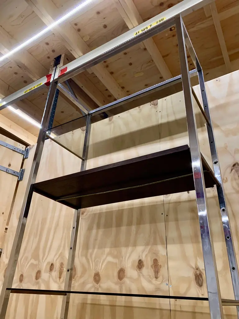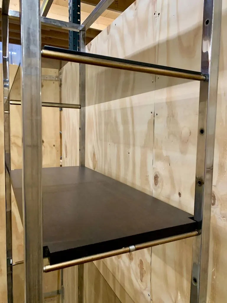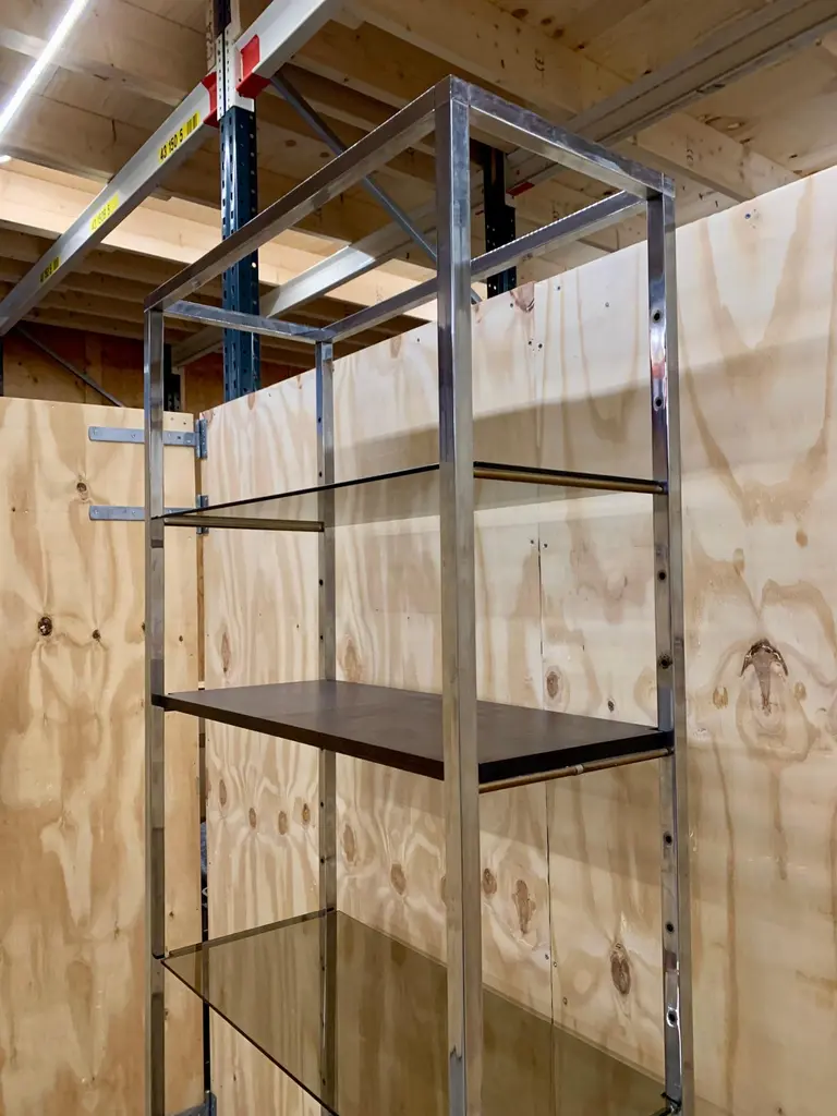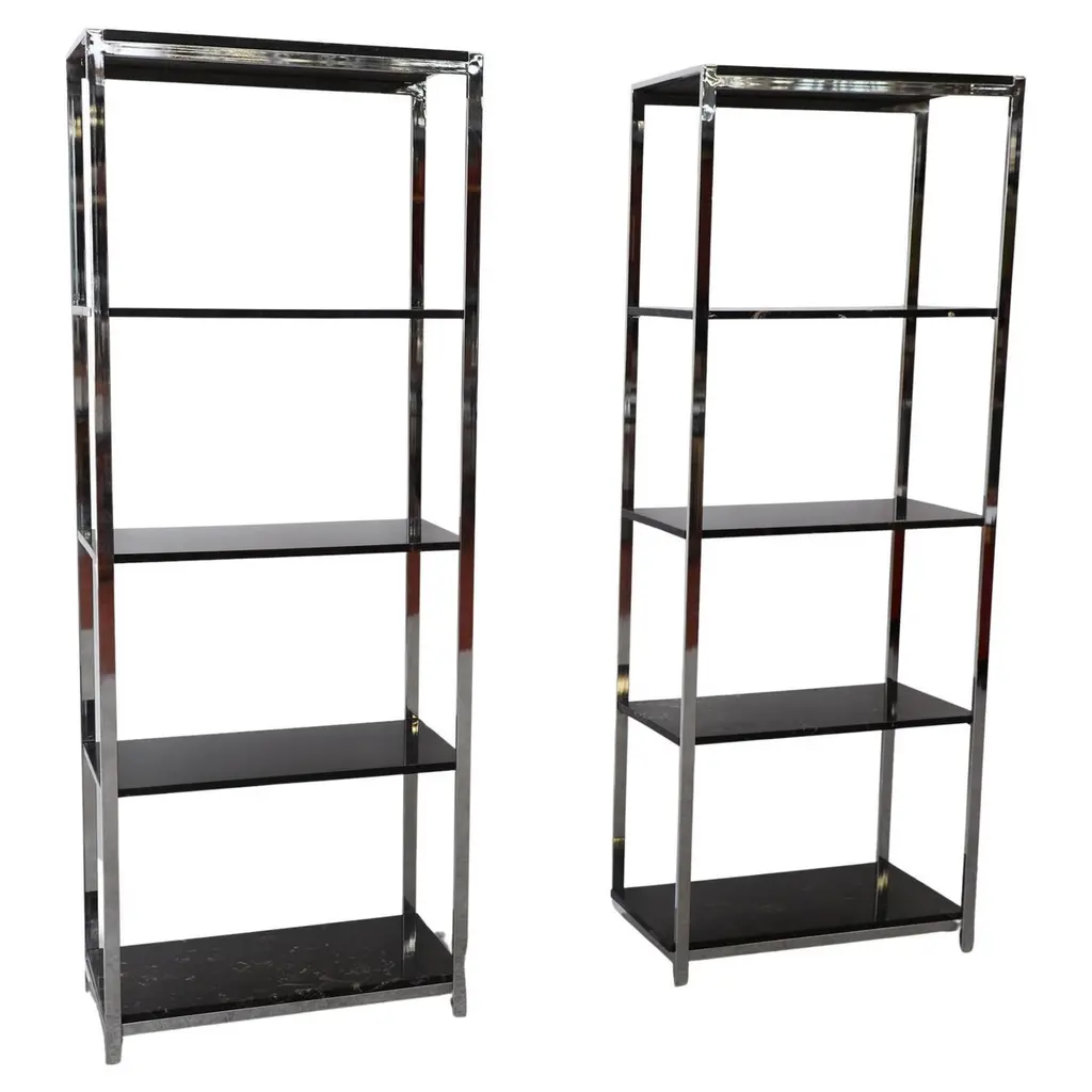 Cool vintage tall chrome book case from 1960-1970s. There are 4 smoke colored glass shelves and 1 wooden shelf, all movable, in each book case. At the moment we have 4 pieces on stock at our remote warehouse.Price is pr. book case