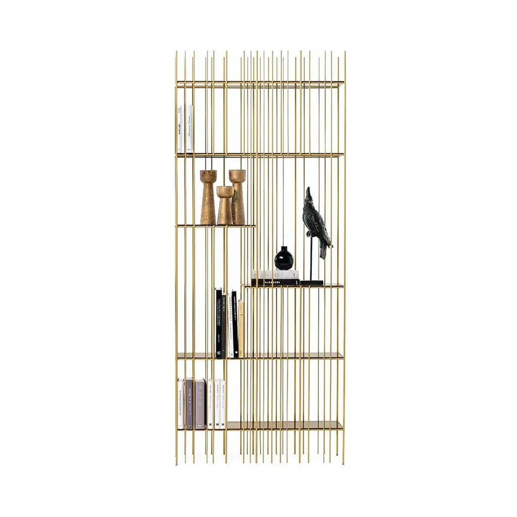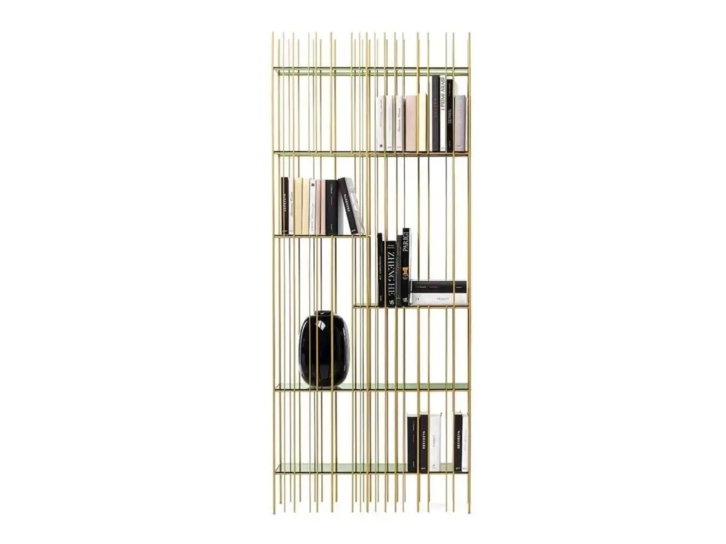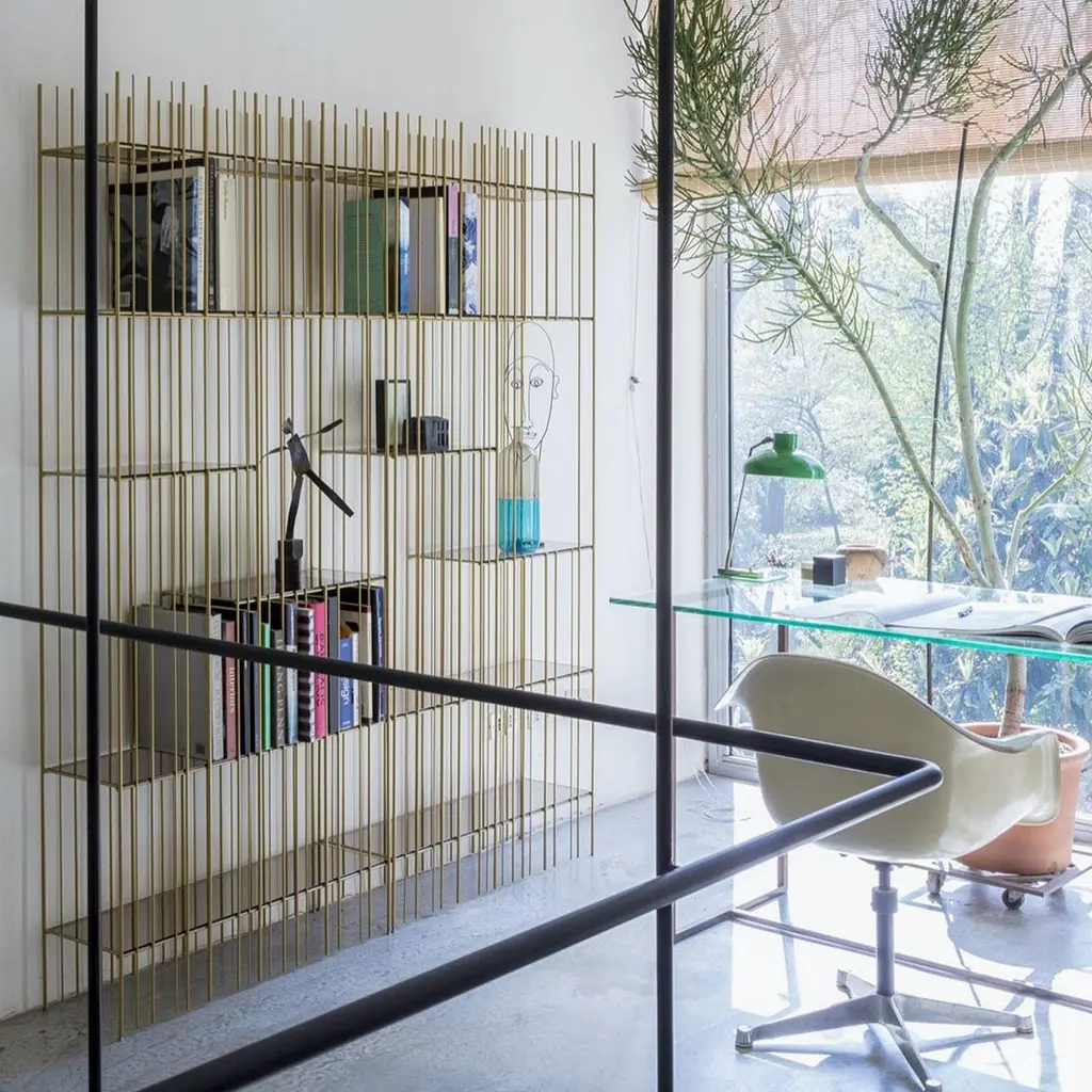 Brand: MoggDesign: Studio CTRLZAKModel: Metrica A - BookshelfMetrica A by Mogg, designed by Studio CTRLZAK, is part of the Metrica collection of aerial, atypical, and highly rhythmic shelving units. The structure is made of steel rods of varying sections, arranged irregularly to create a dynamic, sculptural effect. Occasionally, this grid opens up to form genuine display surfaces where books and objects are highlighted in the most effective way, adding visual interest and versatility.The bookshelf (W 78 cm x D 25 cm x H 190 cm) features a gold-finished steel rod structure supporting 6 tinted glass shelves.Variant Available:Gold frame with tinted glass shelvesShelves available in green or bronzeMaterials & Colors:Steel frame, gold finishTinted glass shelves in green or bronzeType:BookshelfDimensions:Width: 78 cm (30.7 in)Depth: 25 cm (9.8 in)Height: 190 cm (74.8 in)Features:Includes 6 tinted glass shelvesHardware kit included: 4 adjustable feet, 2 wall mounting safety hooks, and 2 connectorsMade n ItalyConcept:Metrica A transforms ordinary storage into a sculptural display. The interplay of irregular steel rods and floating glass shelves creates a dynamic and ethereal presence, perfect for highlighting books and decorative objects while bringing rhythm and movement to contemporary interiors.