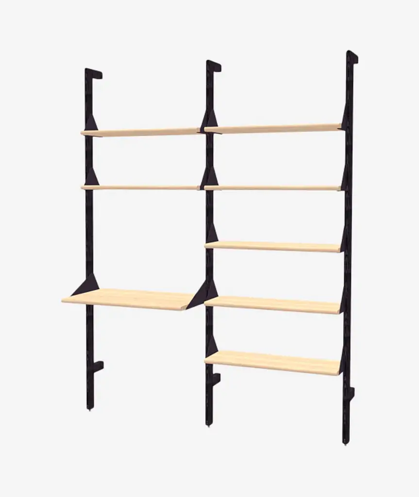 The Branch Shelving System blends mid-century style with modular components that give you an infinite number of elegant, open-storage options for home or office. The design features varying bookshelf configurations that can be transformed into a seamless workspace with the addition of a desk unit. Additional add-on units let you customize the size and layout of your shelving system to perfectly suit your space, and the shelves are height adjustable to suit any arrangement of decorative items or resources. Refined details, such as rounded edges on the shelves and uprights, soften Branch’s aesthetic and enhance its architectural style. Straightforward installation means you can spend more time perfecting your vision and display. *Includes: 3 Branch Uprights, 7 Shelves and 1 Desk Shelf. Additional Add-Ons may be purchased here to customize the configuration.
