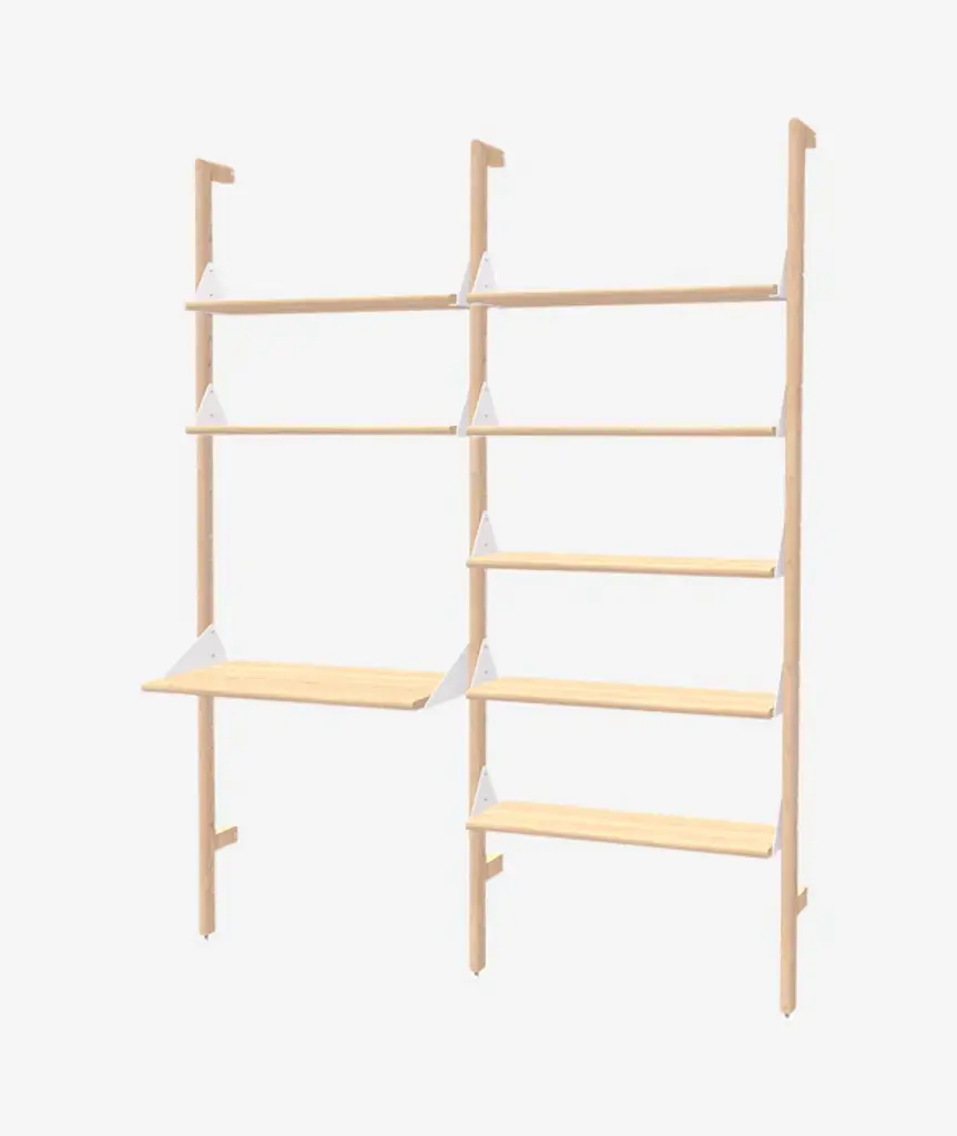 The Branch Shelving System blends mid-century style with modular components that give you an infinite number of elegant, open-storage options for home or office. The design features varying bookshelf configurations that can be transformed into a seamless workspace with the addition of a desk unit. Additional add-on units let you customize the size and layout of your shelving system to perfectly suit your space, and the shelves are height adjustable to suit any arrangement of decorative items or resources. Refined details, such as rounded edges on the shelves and uprights, soften Branch’s aesthetic and enhance its architectural style. Straightforward installation means you can spend more time perfecting your vision and display. *Includes: 3 Branch Uprights, 7 Shelves and 1 Desk Shelf. Additional Add-Ons may be purchased here to customize the configuration.