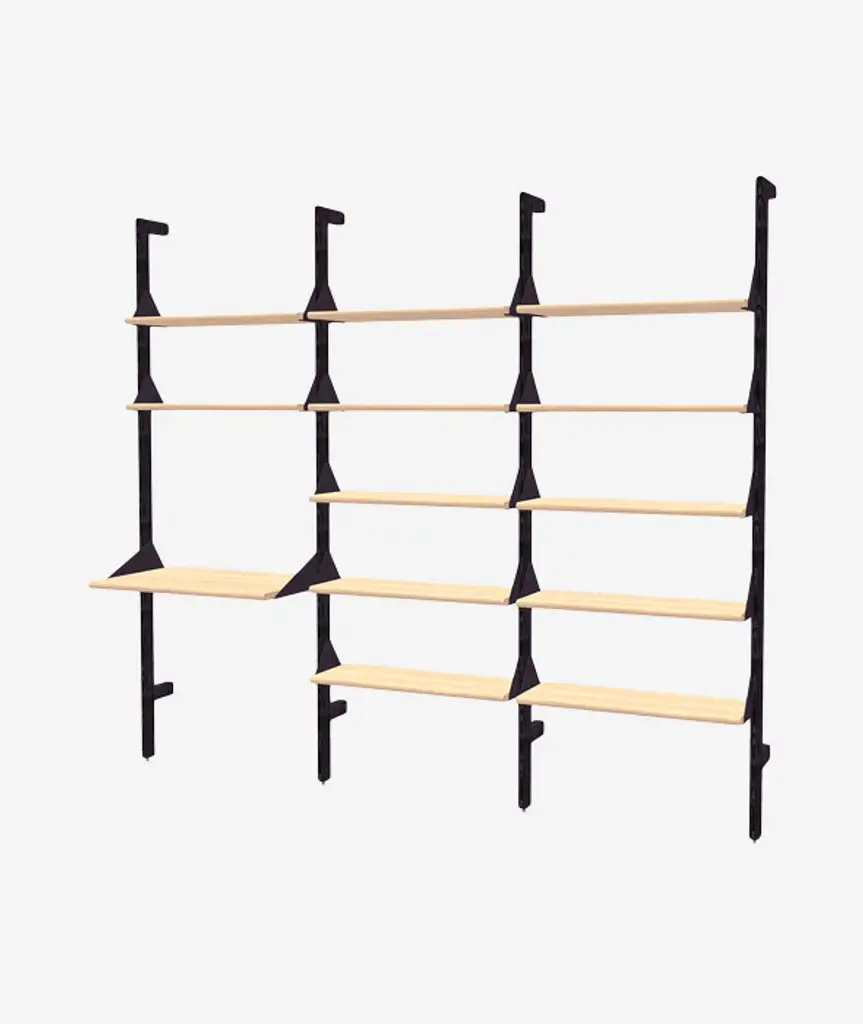 The Branch Shelving System blends mid-century style with modular components that give you an infinite number of elegant, open-storage options for home or office. The design features varying bookshelf configurations that can be transformed into a seamless workspace with the addition of a desk unit. Additional add-on units let you customize the size and layout of your shelving system to perfectly suit your space, and the shelves are height adjustable to suit any arrangement of decorative items or resources. Refined details, such as rounded edges on the shelves and uprights, soften Branch’s aesthetic and enhance its architectural style. Straightforward installation means you can spend more time perfecting your vision and display. *Includes: 4 Branch Uprights, 1 Desk Shelf and 12 Shelves. Additional Add-Ons may be purchased here to customize the configuration.