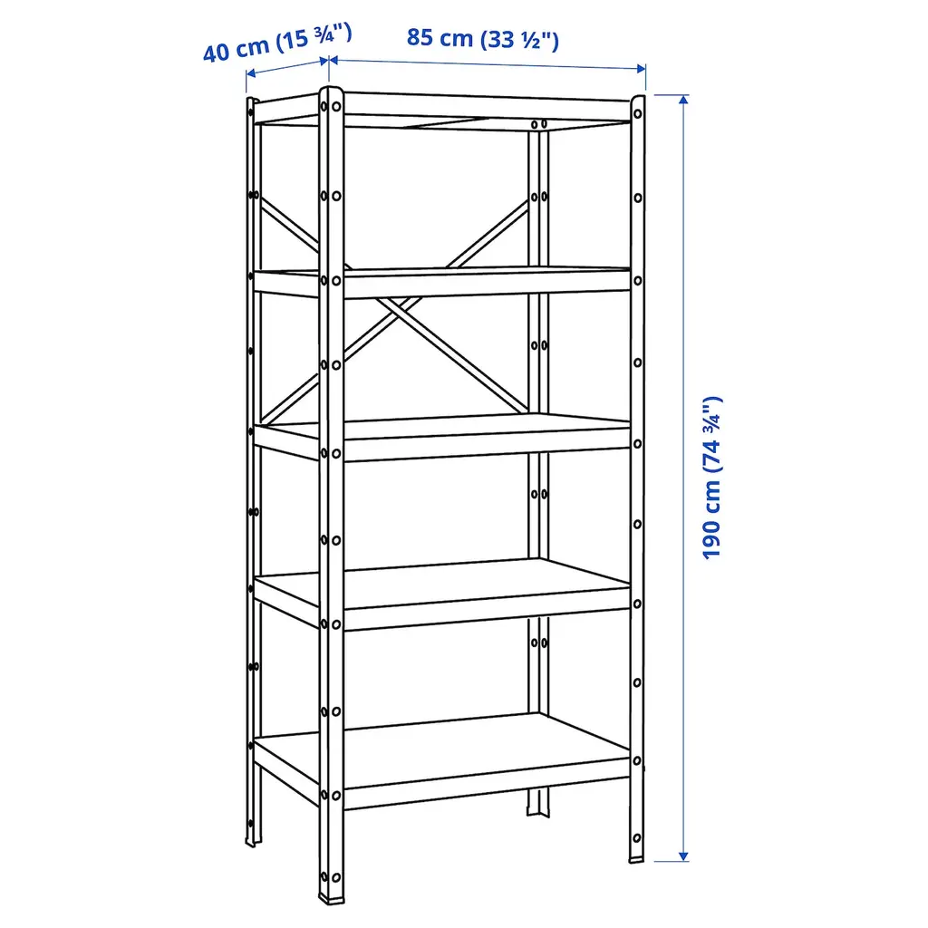 BROR Shelving unit - black 33 1/2x15 3/4x74 3/4 ". The shelf is perfect for heavy things since it can hold 95 kilos, which is twice as much load as a standard shelf. 10-year limited warranty. Read about the terms in the warranty brochure. Perfect for big heavy items like tools and books.