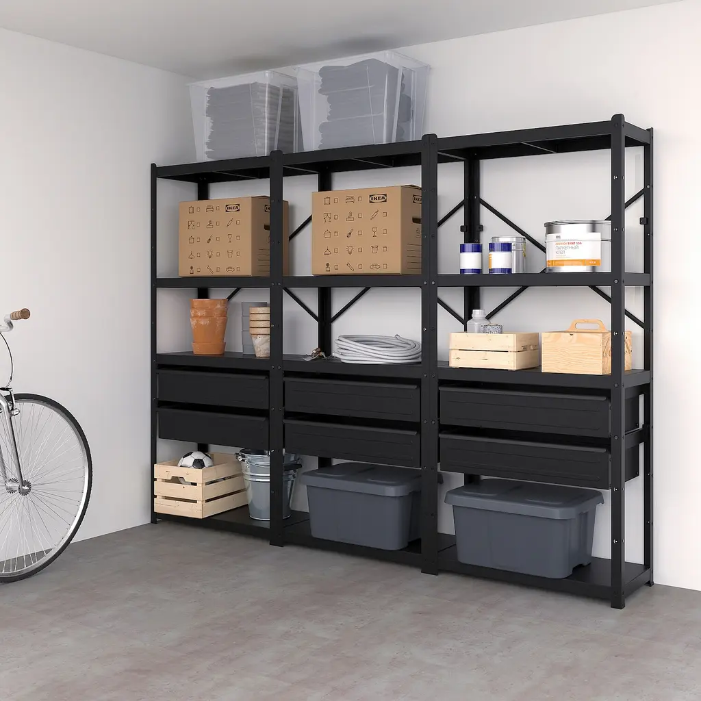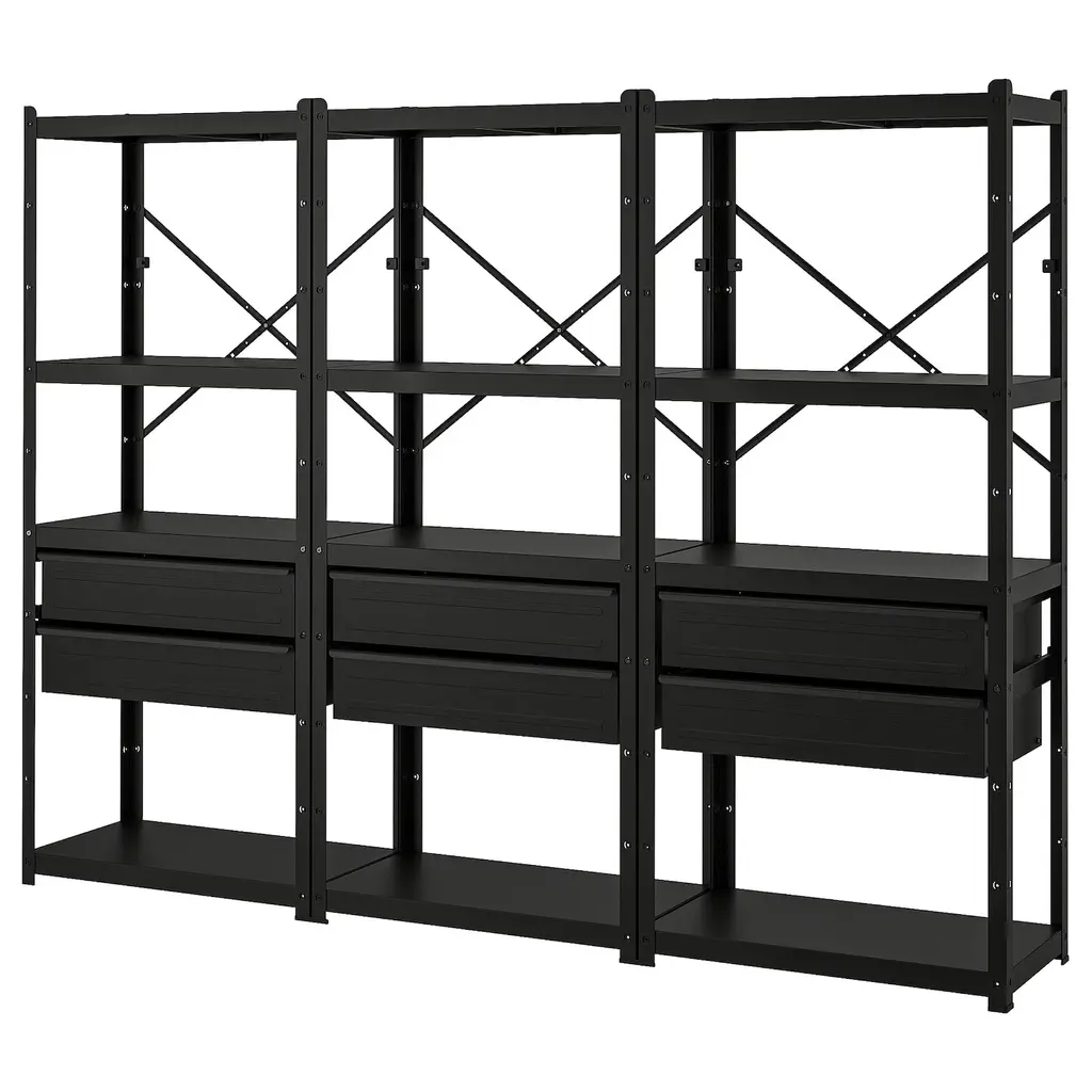 BROR Shelving unit with drawers/shelves - black 100x15 3/4x74 3/4 ". The shelf is perfect for heavy things since it can hold twice as much load (.43 lbs/sq inch) as a standard shelf. Perfect for big heavy items like tools and books. You can move the shelf and adapt spacing to suit your needs.