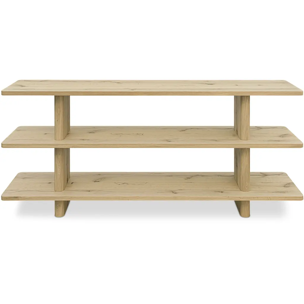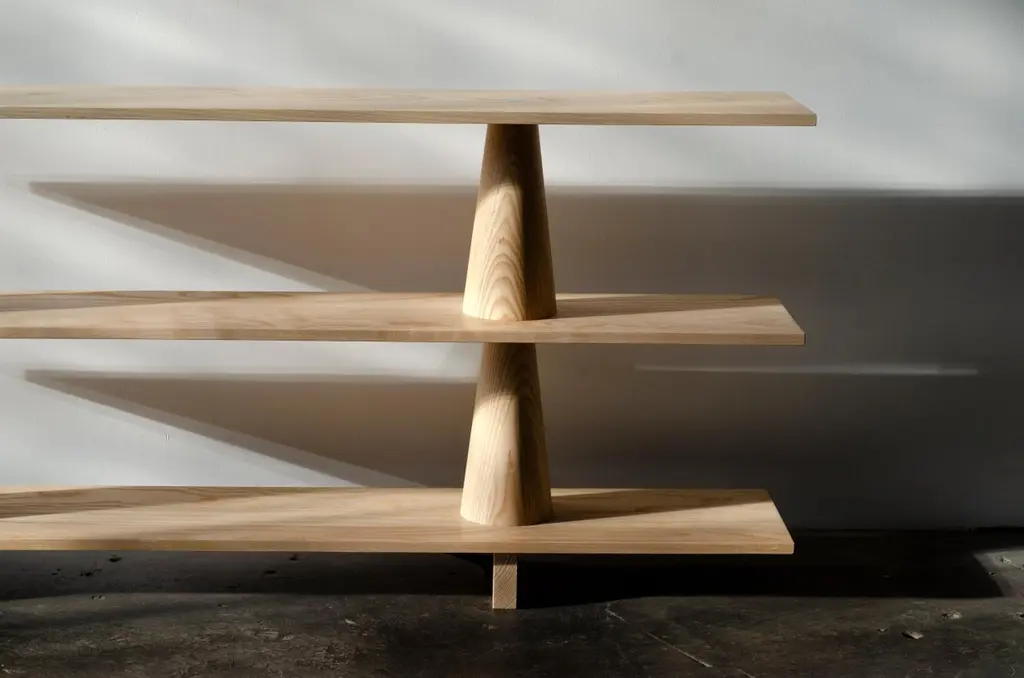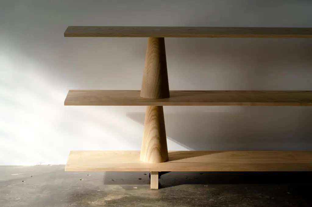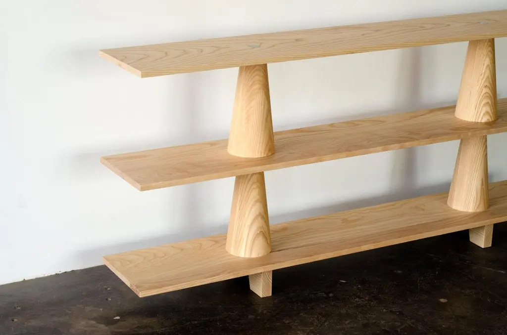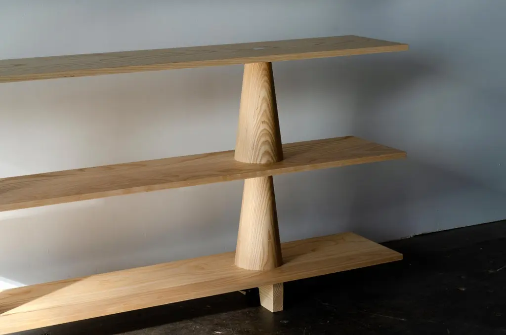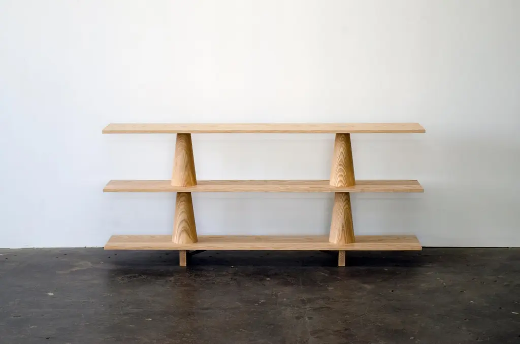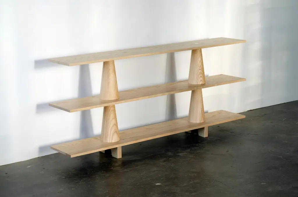 The “Pylon” profile comprises overhanging, interleaved shelves grounded by stacked, conical spacers. These solid elements add visual weight and totemic structure to the shelf system’s organizational logic. Assembling easily, the system is stacked onto steel bolts and clamped together with Cam levers.Available in two standard configurations, the tall 6-shelf model or a lower 3-shelf model, and infinite custom configurations.This listing is for solid ash. Customers can choose from ash (pictured), walnut, or white oak. Prices vary.All pieces feature a natural oil and wax finishMeasures: L 72" D 12" H 32".