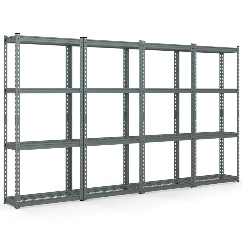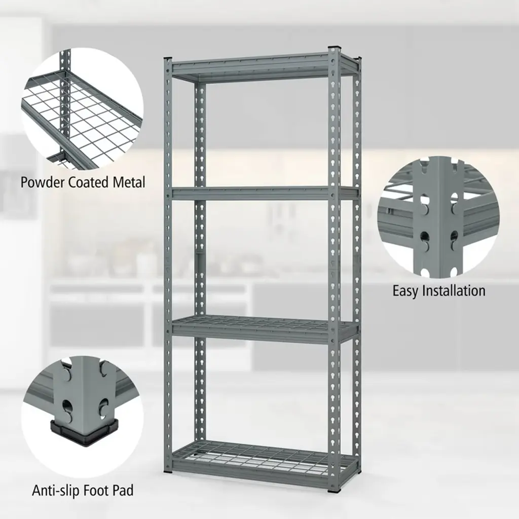 Experience the convenience and versatility of our four-layer storage shelf. With four spacious storage layers, this standing shelf unit is perfect for organizing your garage, living room, or kitchen. You can neatly accommodate your tool box, electric appliances, books, plants, bowls, and seasoning bottles in it. Moreover, the adjustable design of this shelf allows you to customize the height of each tier, making it suitable for items of different sizes. Additionally, it can be effortlessly divided into two smaller shelves, providing you with the flexibility to arrange and organize your belongings to your need. In addition, crafted with safety in mind, our metal wire shelf boasts a sturdy and stable structure with a high load capacity. Furthermore, made from premium-quality metal, this four/five-tier storage shelf is sturdy and reliable for long-term use. The powder-coated metal material adds strength and durability to the product, making it resistant to water and rust. Last but not least, the shelf requires only a hammer for assembly, making the whole process quick, effortless, and hassle-free.FeaturesFlexible DIY shelves for storage needs Four layers of ample storage space to accommodate a wide range of items Effortlessly personalize the arrangement and belongings with the adjustable shelf Ensure the safety and security of your items with the sturdy metal wire shelf Equipped with anti-slip foot pads and an anti-tipping device for enhanced safety measures Save valuable time and effort with hassle-free installationColor: Gray Material: Metal Overall Dimension: 27.5" x 12" x 60" (L x W x H) Load Capacity: 880 lbs Net Weight: 15.5/31/46.5/62 lbs Package includes: 1/2/3/4 x Storage shelf 1 x User Guide