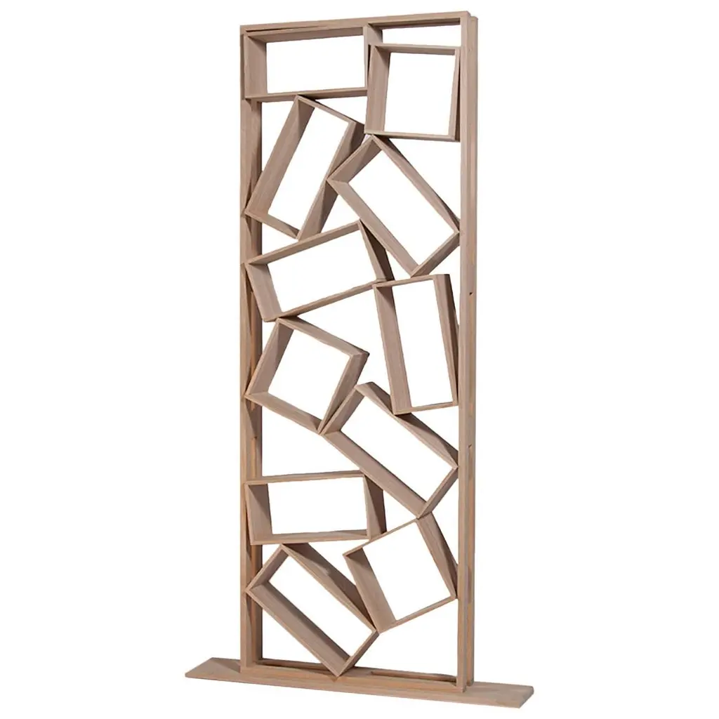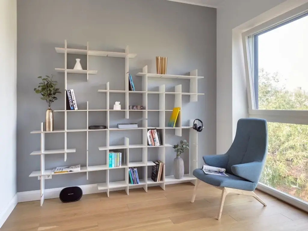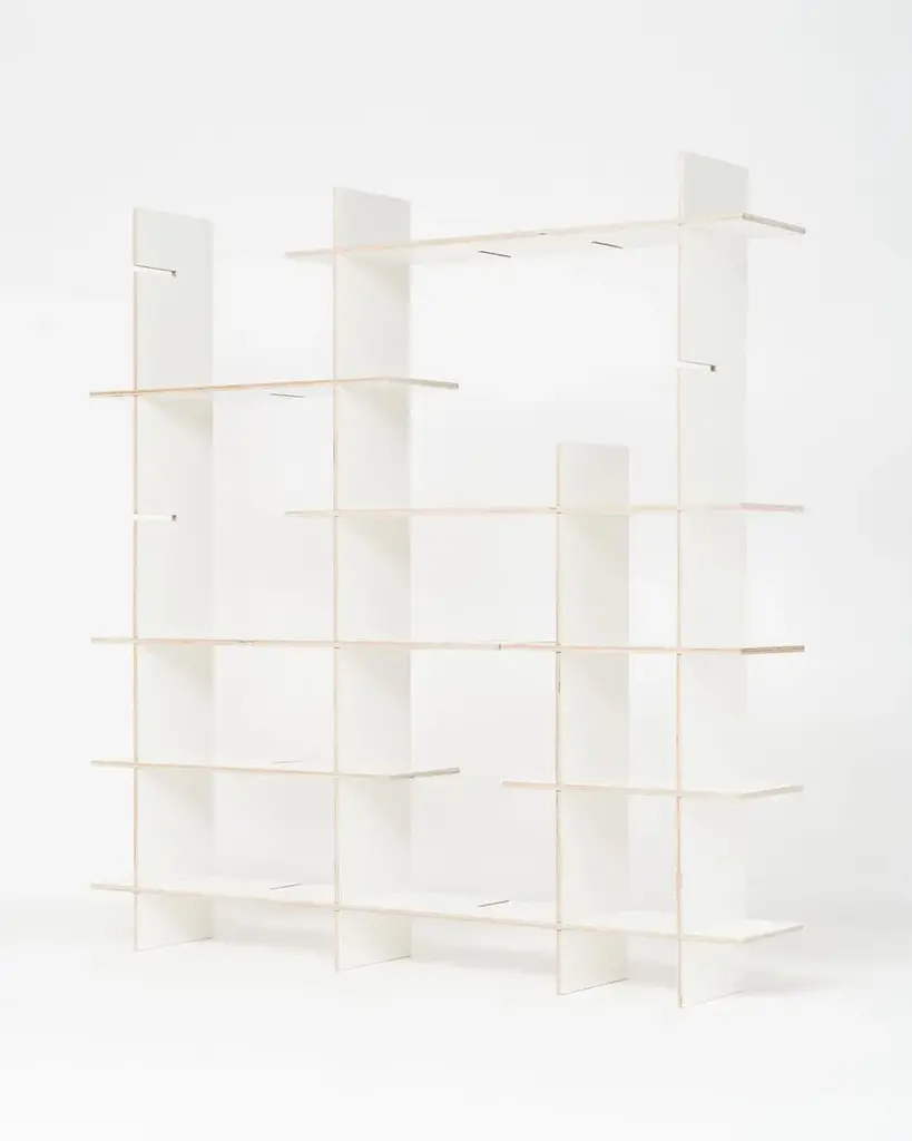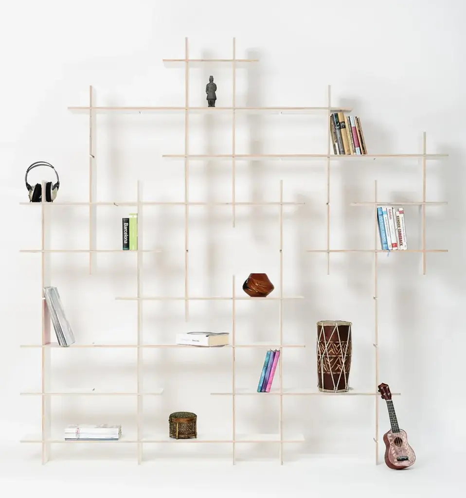 Alluringly playful and open-minded! Shelving that is ready to keep Your secrets. Everything is accessible, but only You know where everything is. With this puzzle-like shelving You will add dazzle to Your home and leave Your guests gasping for breath.Smaller set includes 4 pieces with six tenon (length 146 cm), 4 pieces with four tenon (97 cm), 2 pieces with three tenon (72 cm) and 2 pieces with two tenon (48 cm). So all together 12 pieces.Larger set includes 8 pieces with six tenon (length 146 cm), 8 pieces with four tenon (97 cm), 4 pieces with three tenon (72 cm) and 4 pieces with two tenon (48 cm). So all together 24 pieces.All details can be mixed together. The distance between two tenon is 25 cm.Made of 12 mm birch plywood, white film. It is also very environmental friendly shelf – for waste there is only very small piece of refuse. The shelf has to be connected to the wall with the fittings provided.Shelf Criss-Cross was nominated for Estonian design award Bruno 2018.