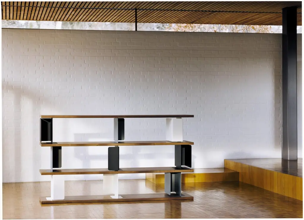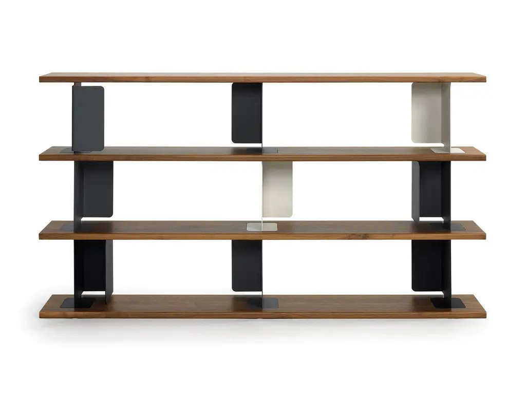 Furnishing is a creative game of possibilities. The shelving unit Paris by the London design team of Edward Barber and Jay Osgerby offers plenty of scope to indulge the urge to play. As the shelves are connected by clip elements which are neither screwed nor permanently fixed, the shelving unit can be regrouped any time with just a few turns of the hand. Thanks to the unusual design, Paris has no rear, only fronts and can thus also be placed standing freely in the center of a room as a room divider.Materials: American walnut veneer with variable elements in powder-coated steel. An extension set adds one level. Fine adjustable feet. Dimensions: W 200 cm, D 35 cm, H 109 cm.