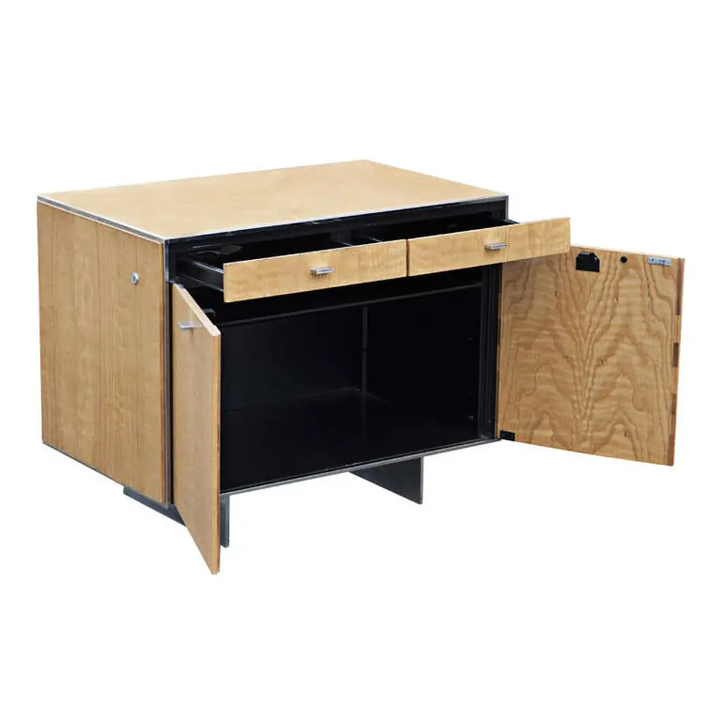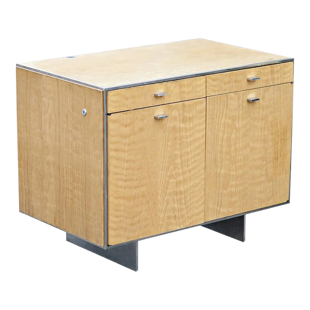 A small vintage oak credenza designed by Davis Allen and from the Davis Allen Collection for GF. Drawers include three files for easy storage of items. Oak with stainless legs and trim. For additional fees, may be customized in 4 different stain finishes: Oak, Ebony, Walnut and White.We also have matching credenzas, desks and shelving units.