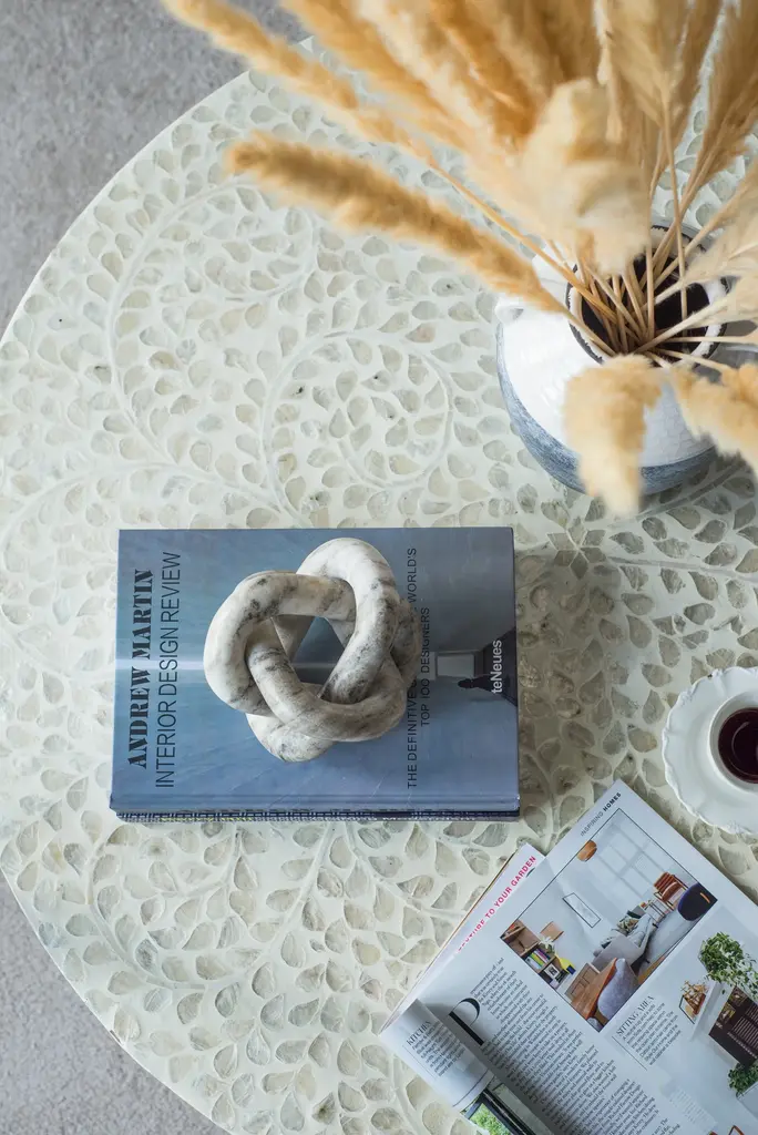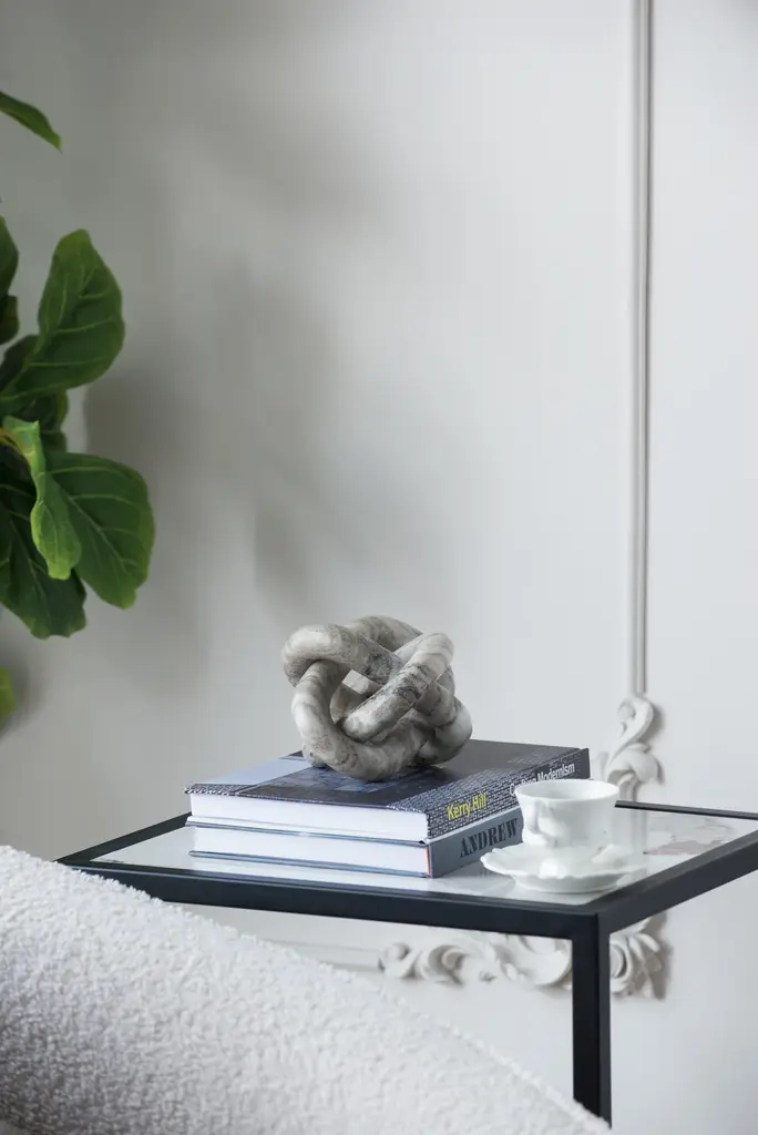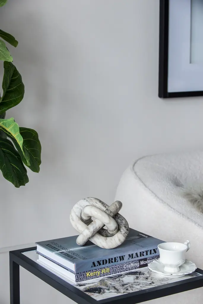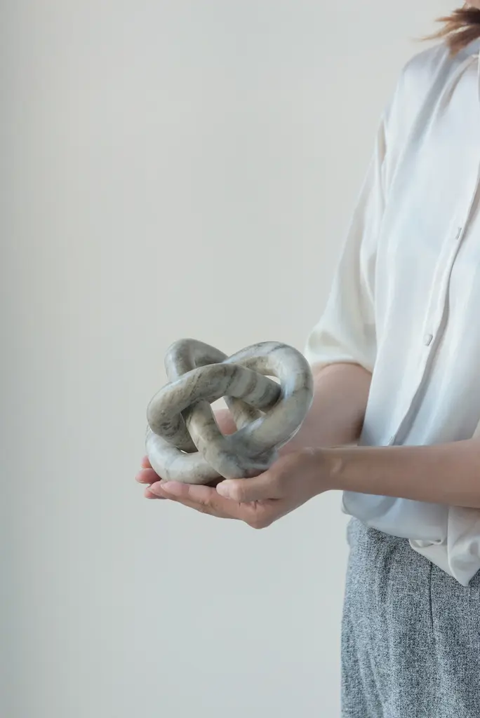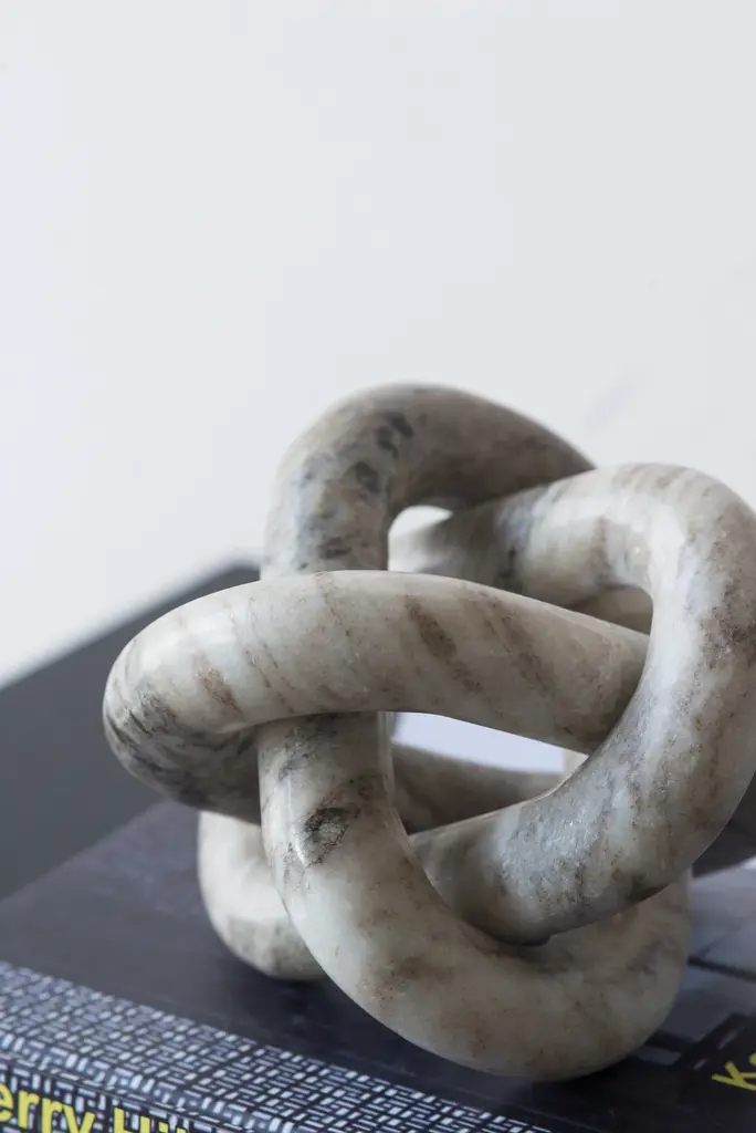 This abstract marble sculpture features an interconnecting design and a natural cream finish. Measuring at a cozy 6 x 6 x 6, this piece can easily slot onto your coffee table, mantel, fireplace or shelving unit. The minimalist design and neutral color allow the sculpture to complement a wide variety of interior styles, making for an accent which is durable and versatile. Measuring at 6 x 6 x 6, it can easily slot into any area of your home. Whether you place it in your living room, bedroom or dining room it would be the perfect accent for a bookshelf, table or fireplace arrangement.