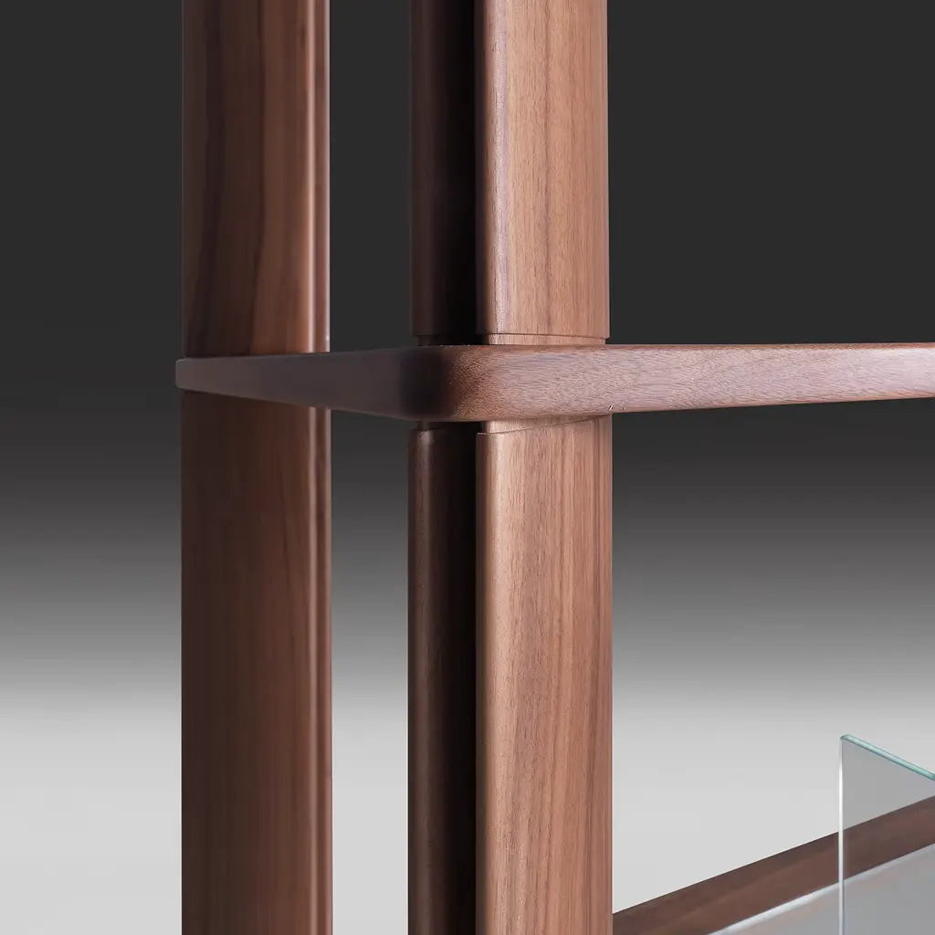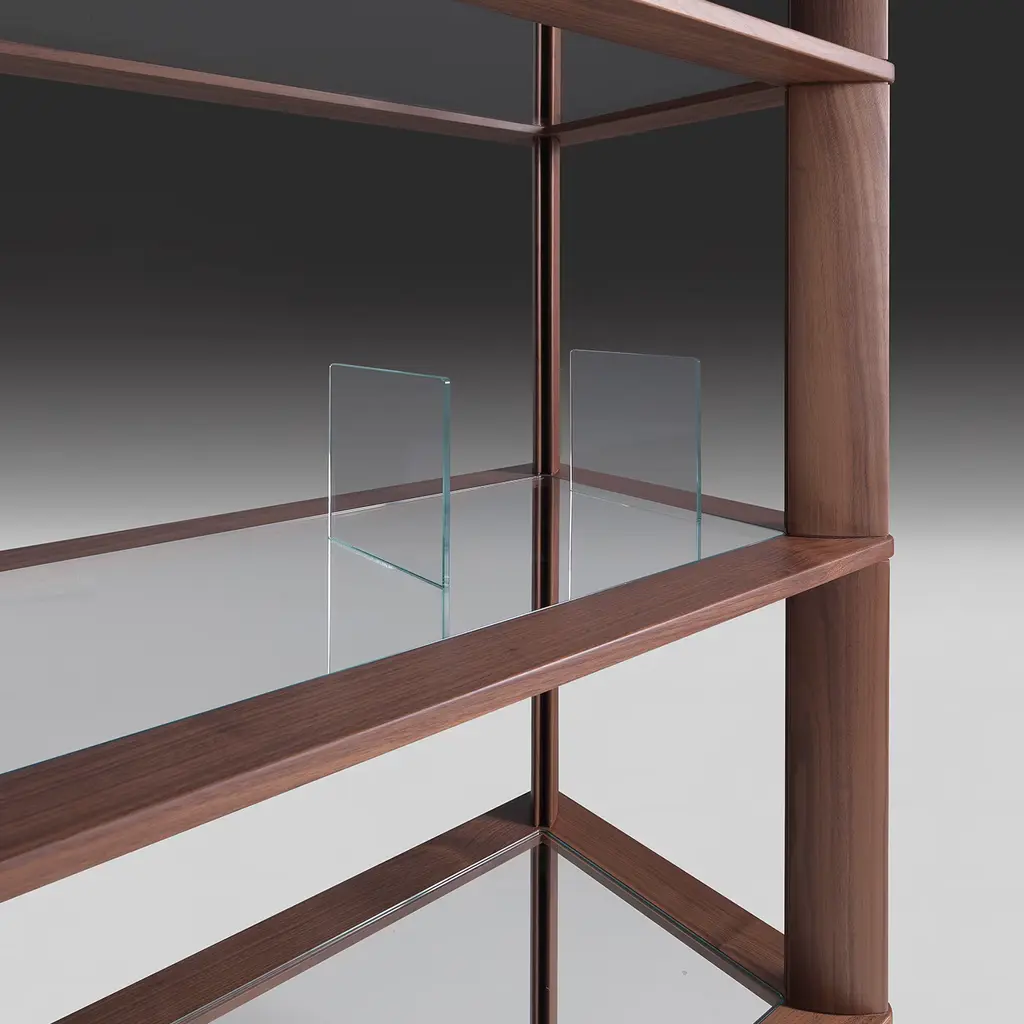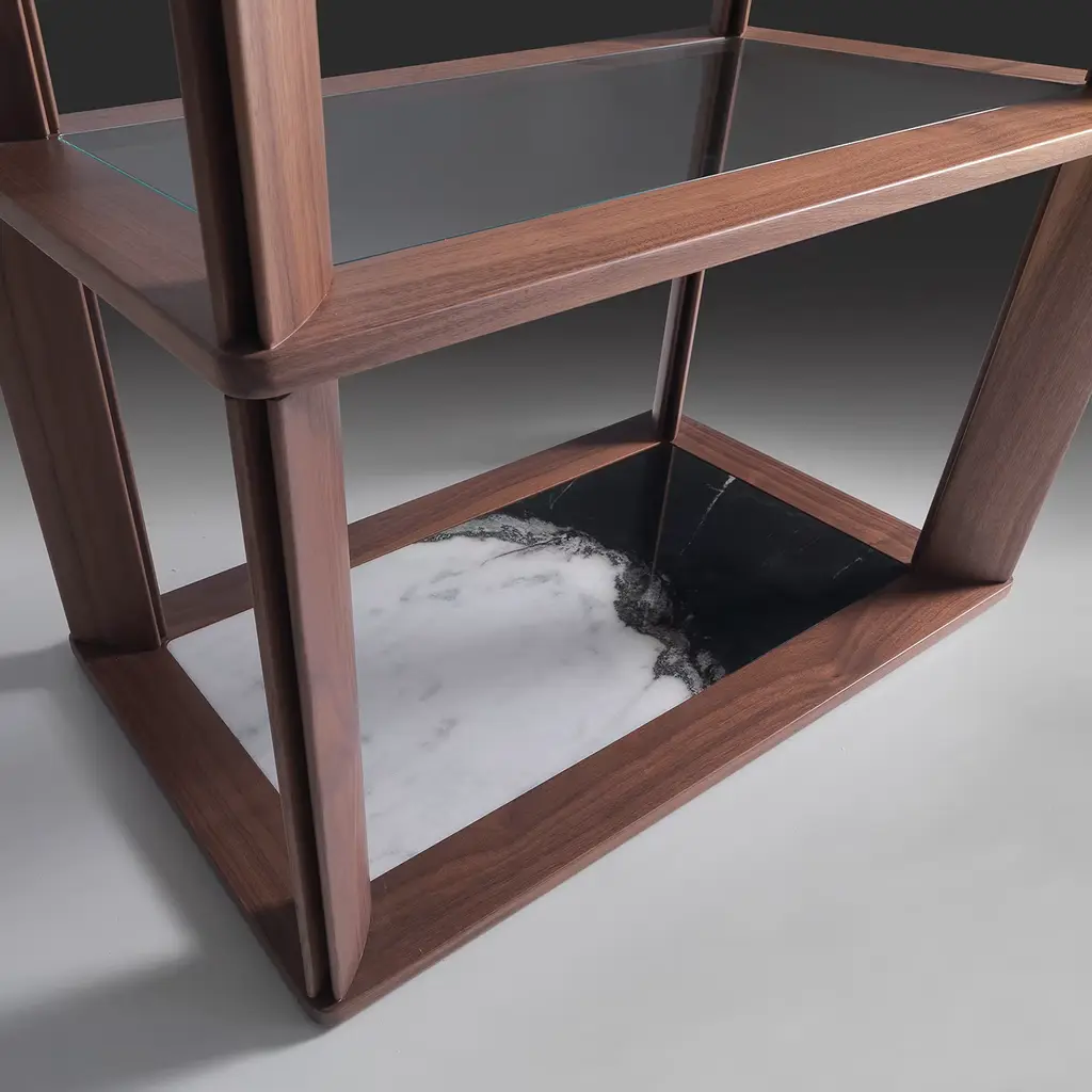 A timeless design, this shelving unit will make for an ideal complement to a clean contemporary-style interior. Handmade of Canaletto walnut, it features three glass shelves and a Dalmata marble bottom shelf. Please consult with the Concierge for further information and customization options.