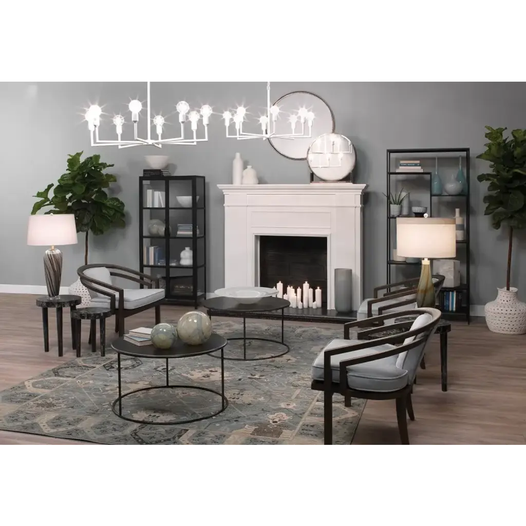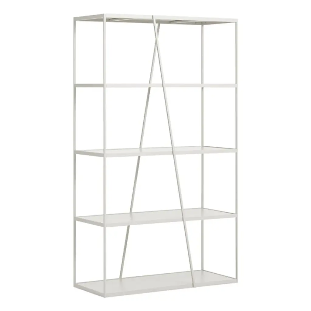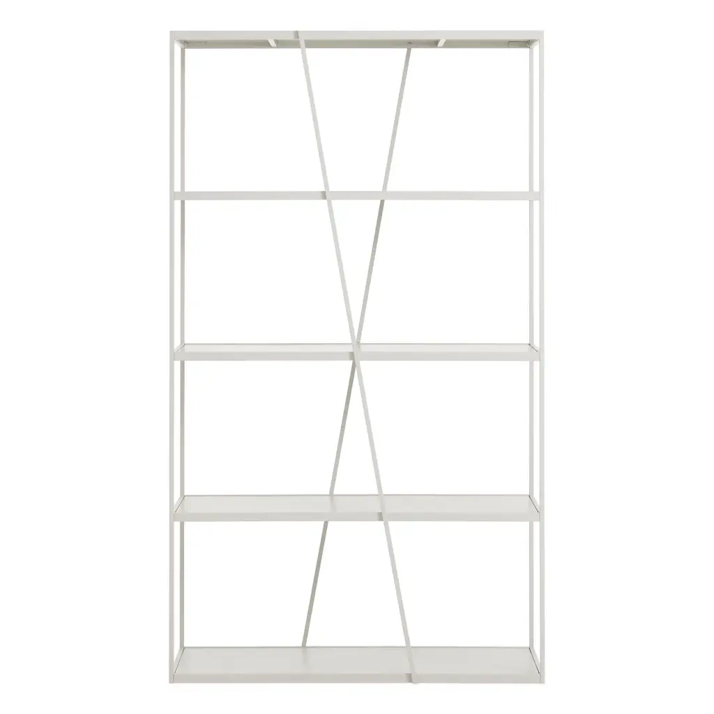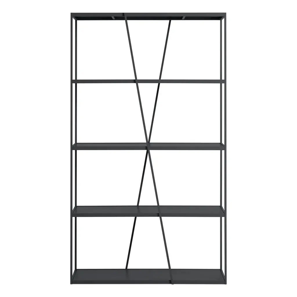 Black metal shelves and supports are asymmetrically arranged to create the perfect open-work etagere. Finished on all sides, this piece makes a great room divider. Use two of these shelving units side-by-side to create a larger piece that is the perfect reflection of itself and twice as large!