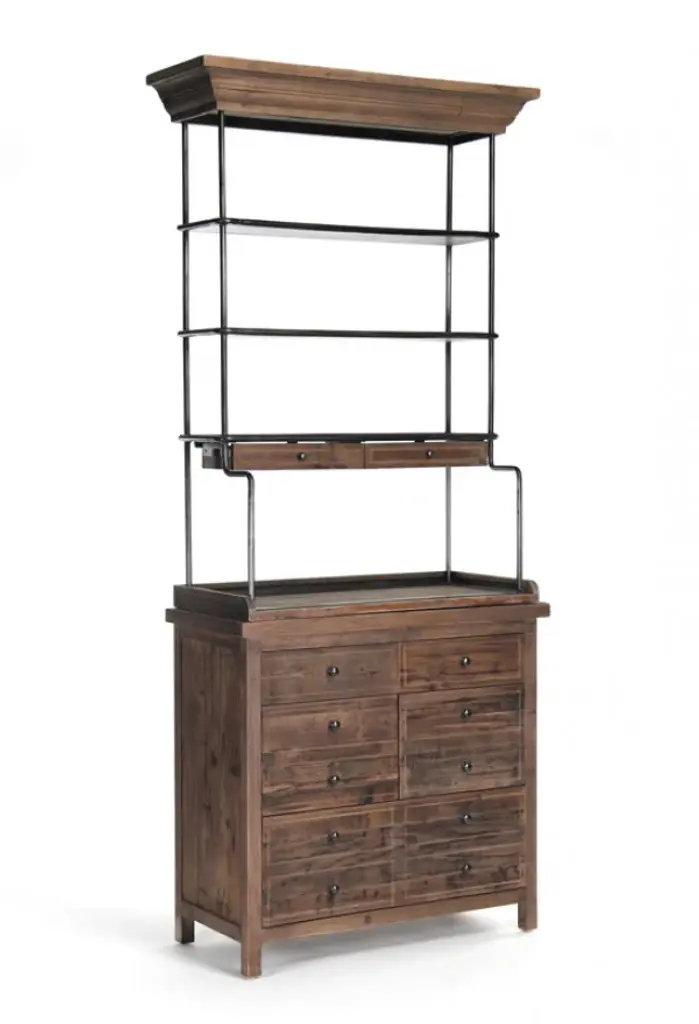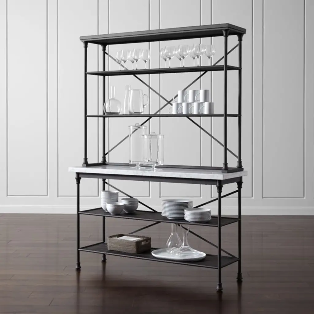 Elegant marble-top bakers rack with hutch translates French style into a timeless design that evokes the charm of an Old World pastry shop. Practical and beautiful, the rack's classically inspired metal base is streamlined for today.