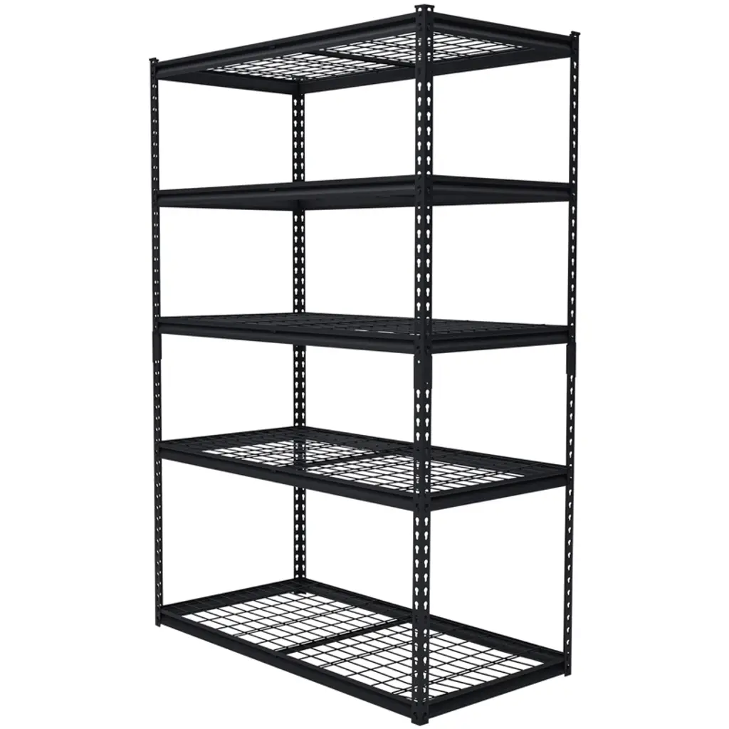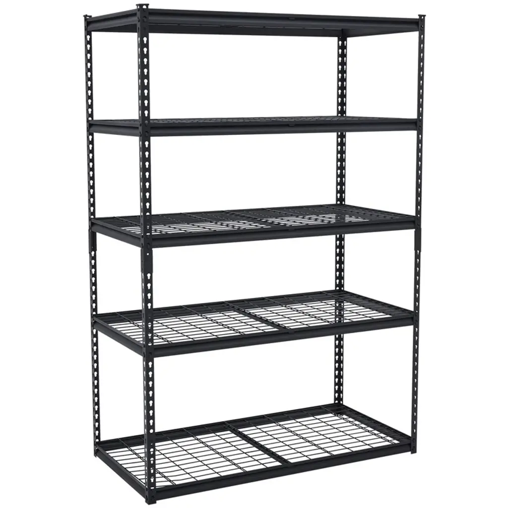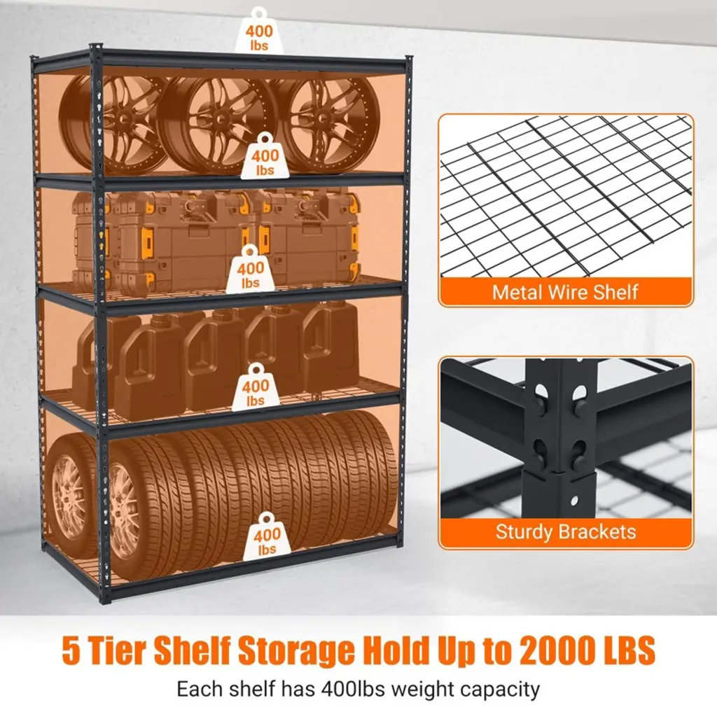 Perfect for garages, workshops, basements, and commercial spaces, these professional-grade shelves feature a durable design that withstands heavy use. The versatile configuration options make them suitable for organizing tools, equipment, storage containers, and household supplies while maintaining easy accessibility. Create an efficient storage system with these heavy-duty shelves that maximize space utilization while supporting substantial weight loads in any environment.Experience superior organization with our industrial-grade 5-tier garage shelving unit, designed to provide massive storage capacity and exceptional versatility for your garage, basement, pantry, or kitchen. Measuring 60 inches long, 24 inches wide, and 78 inches high, this heavy-duty shelving system delivers an impressive 2500-pound weight capacity, making it ideal for storing heavy tools, equipment, storage bins, and household supplies while maximizing your vertical space utilization.Constructed with commercial-grade reinforced steel frames and thick support beams, this shelving unit features robust welded joints and cross-bracing that ensure exceptional stability and durability. The adjustable shelf design allows each of the five tiers to be customized in height increments, providing flexible configuration options for items of various sizes from small containers to large equipment. The professional-grade powder coating provides superior resistance against rust, corrosion, and daily wear, maintaining appearance and functionality in demanding environments.The intuitive bolt-free assembly system enables quick and straightforward setup without requiring special tools or expertise. The shelves feature reinforced edges and anti-slip design that prevent items from sliding, while the open wire grid design allows for proper air circulation and visibility of stored contents. The unit's substantial 60-inch length provides ample space for multiple storage bins or large items, while the 24-inch depth accommodates most standard containers and equipment.