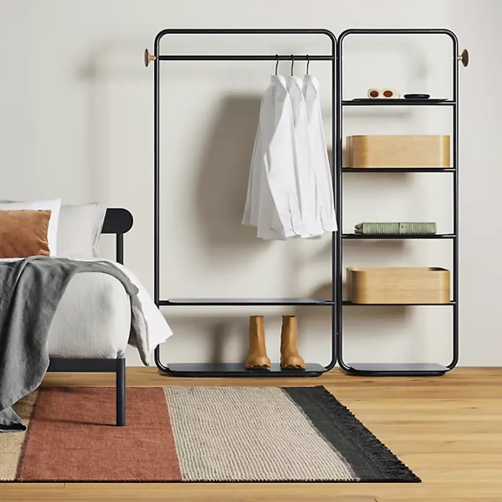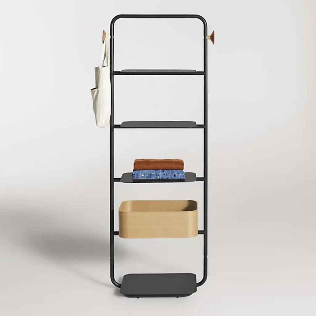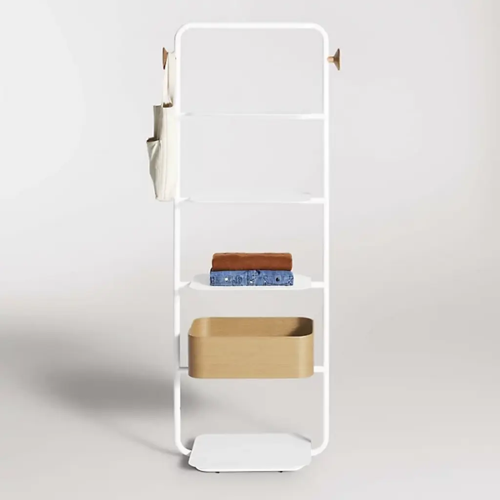 The Garden Party Shelving System from Blu Dot combines mid-century modern elegance and functional sophistication. Crafted from durable steel, this shelving system features multiple shelves and an open framework, providing ample storage for all your essentials. Thanks to adjustable glides, it easily levels for added stability. Pegs at both ends allow you to effortlessly hang your tote bags at the sides so that you can keep your consolidated necessities within arm’s reach before heading out for the day