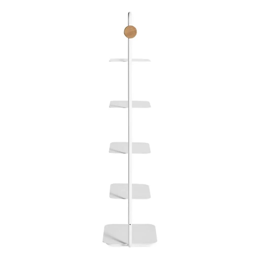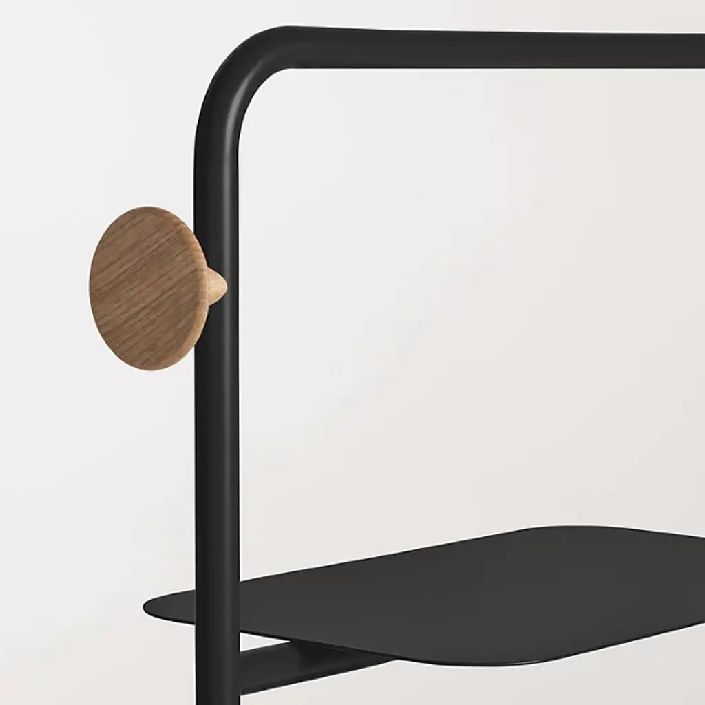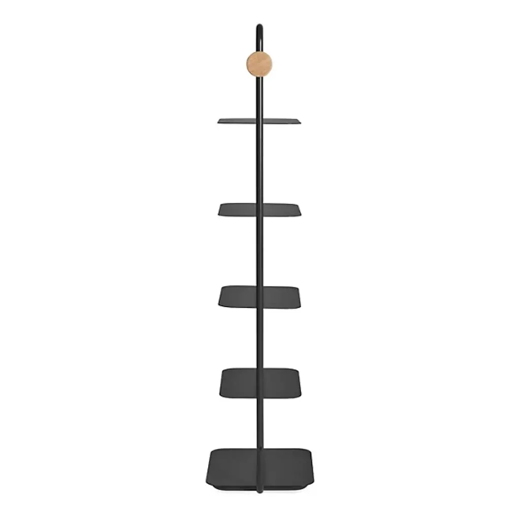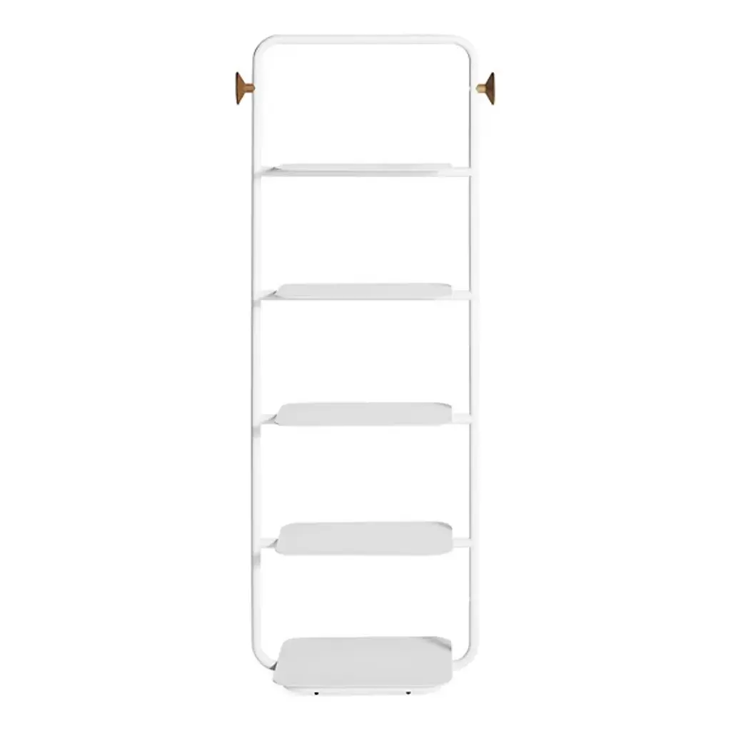 The Garden Party Shelving System from Blu Dot combines mid-century modern elegance and functional sophistication. Crafted from durable steel, this shelving system features multiple shelves and an open framework, providing ample storage for all your essentials. Thanks to adjustable glides, it easily levels for added stability. Pegs at both ends allow you to effortlessly hang your tote bags at the sides so that you can keep your consolidated necessities within arm’s reach before heading out for the day