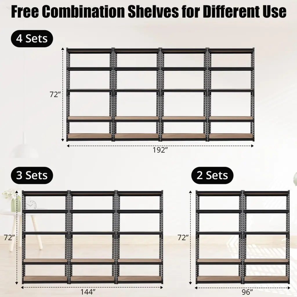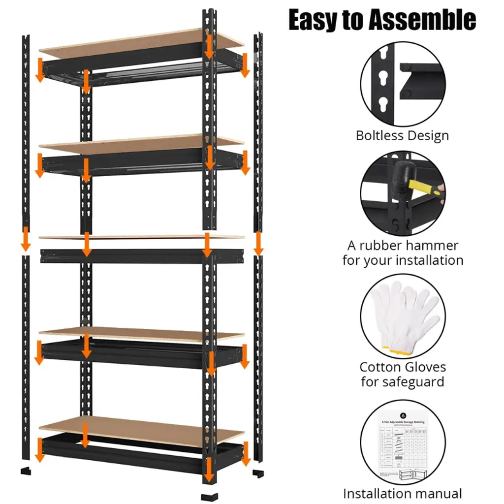 Heavy Duty Storage Shelves, 5-Tier Metal Garage Shelving Unit - Adjustable & Durable Utility RackProduct OverviewMaximize your storage space with these heavy-duty metal shelves, designed for garages, workshops, and commercial use. Featuring 5 adjustable tiers, a powder-coated finish, and easy assembly, this shelving unit provides versatile, sturdy storage for tools, supplies, and bulky items.Key Features? Industrial-Grade Metal Construction Made from durable steel for long-lasting strength Powder-coated finish resists rust, scratches, and wear ? Adjustable & Customizable Storage 5-tier shelving with height-adjustable levels (no fixed spacing) Supports heavy loads¡ªideal for tools, bins, and equipment ? Spacious & Organized Open-frame design for easy access to stored items Rectangular shape fits neatly against walls or in corners ? Quick & Tool-Free Assembly Simple bolt-free setup (no special tools required) Sturdy floor-standing design¡ªno mounting needed ? Multi-Purpose Use Perfect for garages, warehouses, kitchens, or basements Holds paint cans, power tools, storage bins, and more Specifications Material: Heavy-duty steel (powder-coated) Color: Black (standard) Mounting Type: Free-standing (floor mount) Number of Shelves: 5 (adjustable) Load Capacity: Heavy-duty (exact weight limit per shelf not specified) Assembly Required: Yes (tool-free design) Style: Modern, industrial Special Feature: Expandable (adjustable shelf heights) Recommended Use: Adults (garage, workshop, storage rooms) Why Choose These Shelves?? Ultra-Sturdy ¨C Supports heavy items without bending? Flexible Storage ¨C Adjust shelves for tall or bulky items? Easy to Clean ¨C Wipe-down metal surfaces stay dust-free? Space-Saving ¨C Vertical design maximizes floor spaceIdeal For: Garage organization (tools, car supplies) Warehouse & commercial storage Home utility rooms & basements Retail stockroom shelving