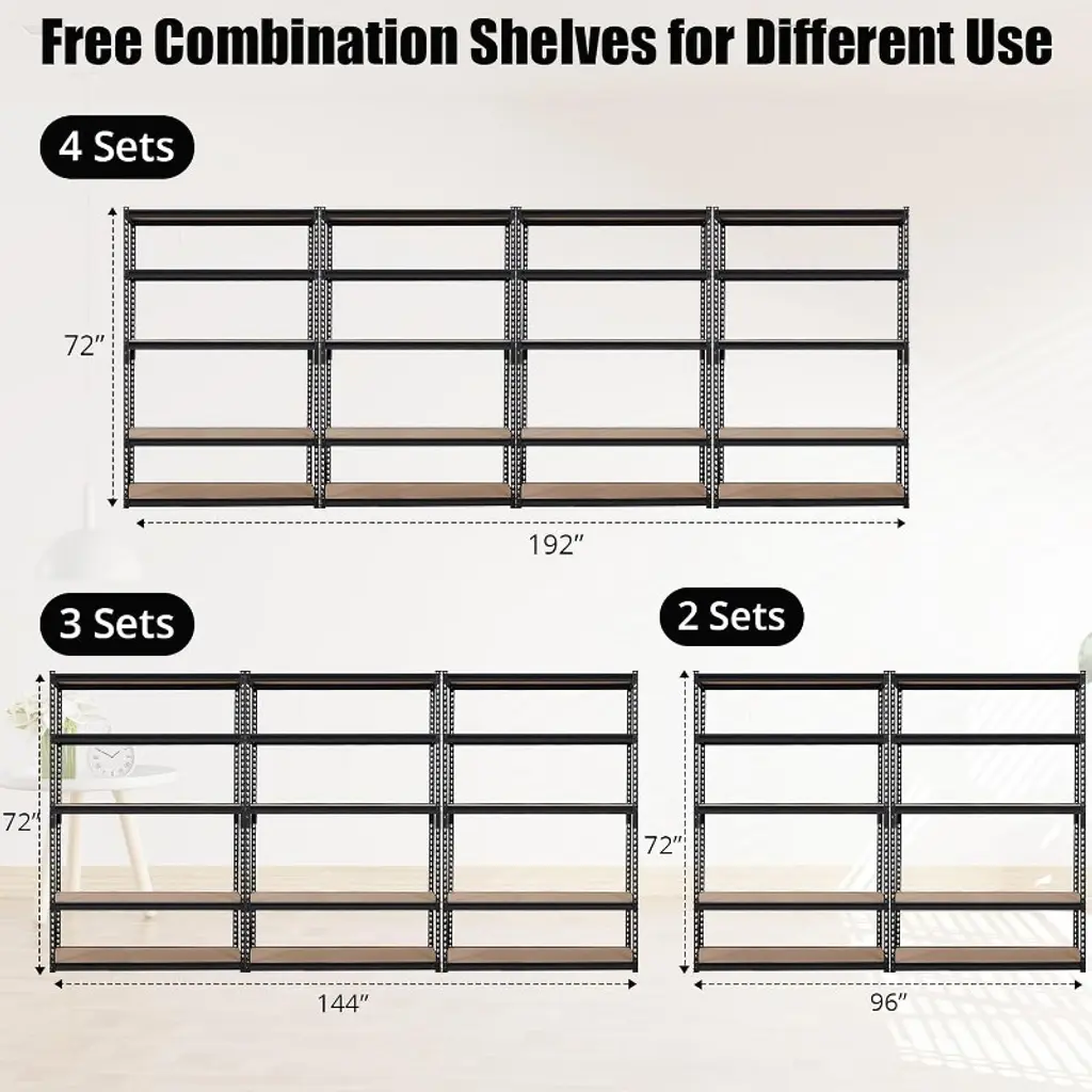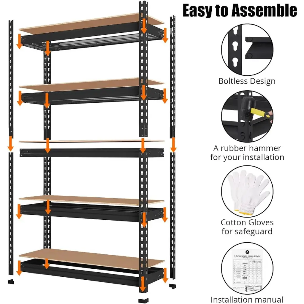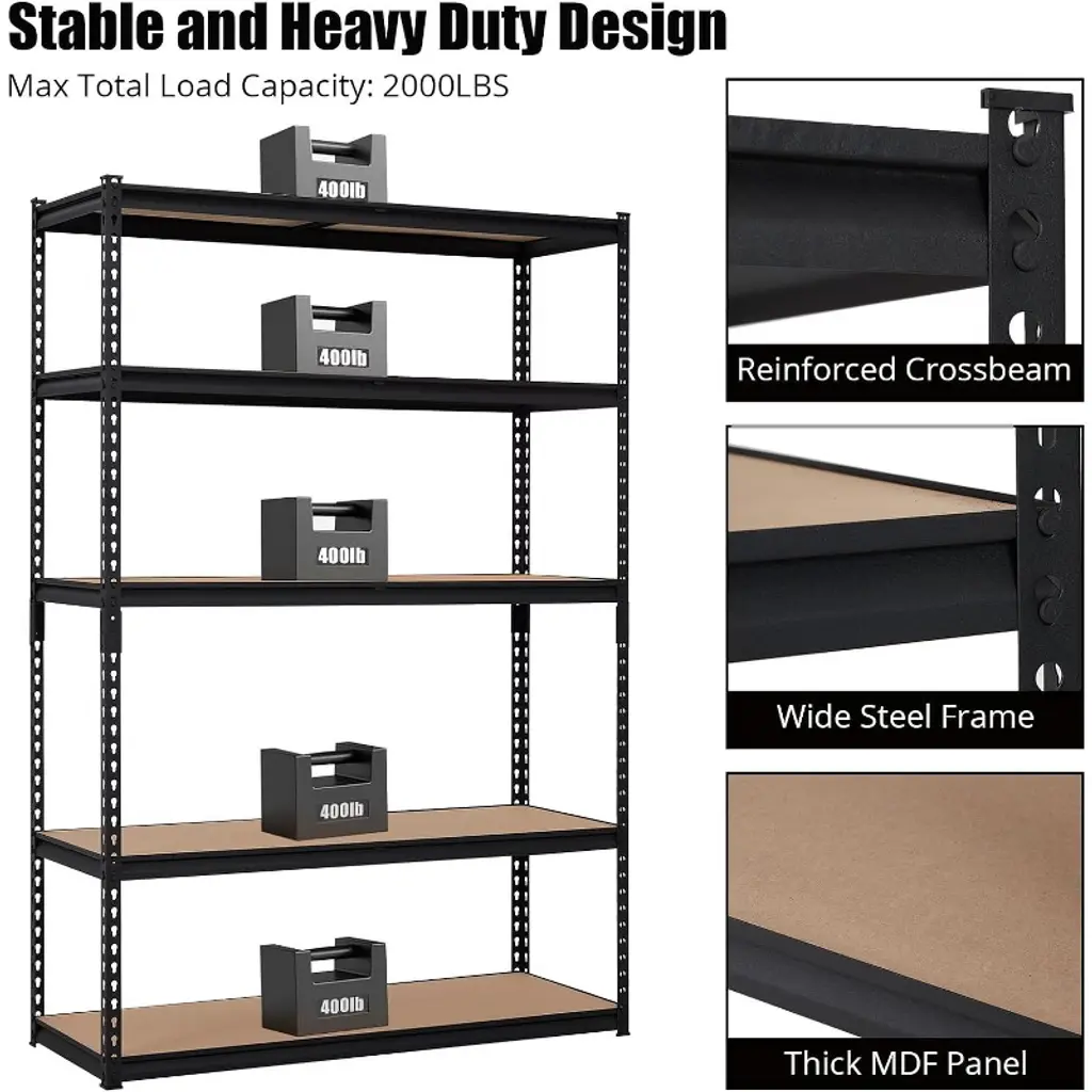This heavy-duty garage shelving unit boasts an impressive 2000lbs weight capacity, built to handle heavy tools, equipment, or bulk items. With 5 adjustable tiers, the black industrial metal shelves offer customizable storage—ideal for garages, warehouses, pantries, or kitchens. Sturdy and durable, the metal frame ensures stability, while the adjustable design adapts to varying item sizes. Sleek yet robust, it’s a reliable storage solution for organizing any space, from industrial warehouses to home pantries.