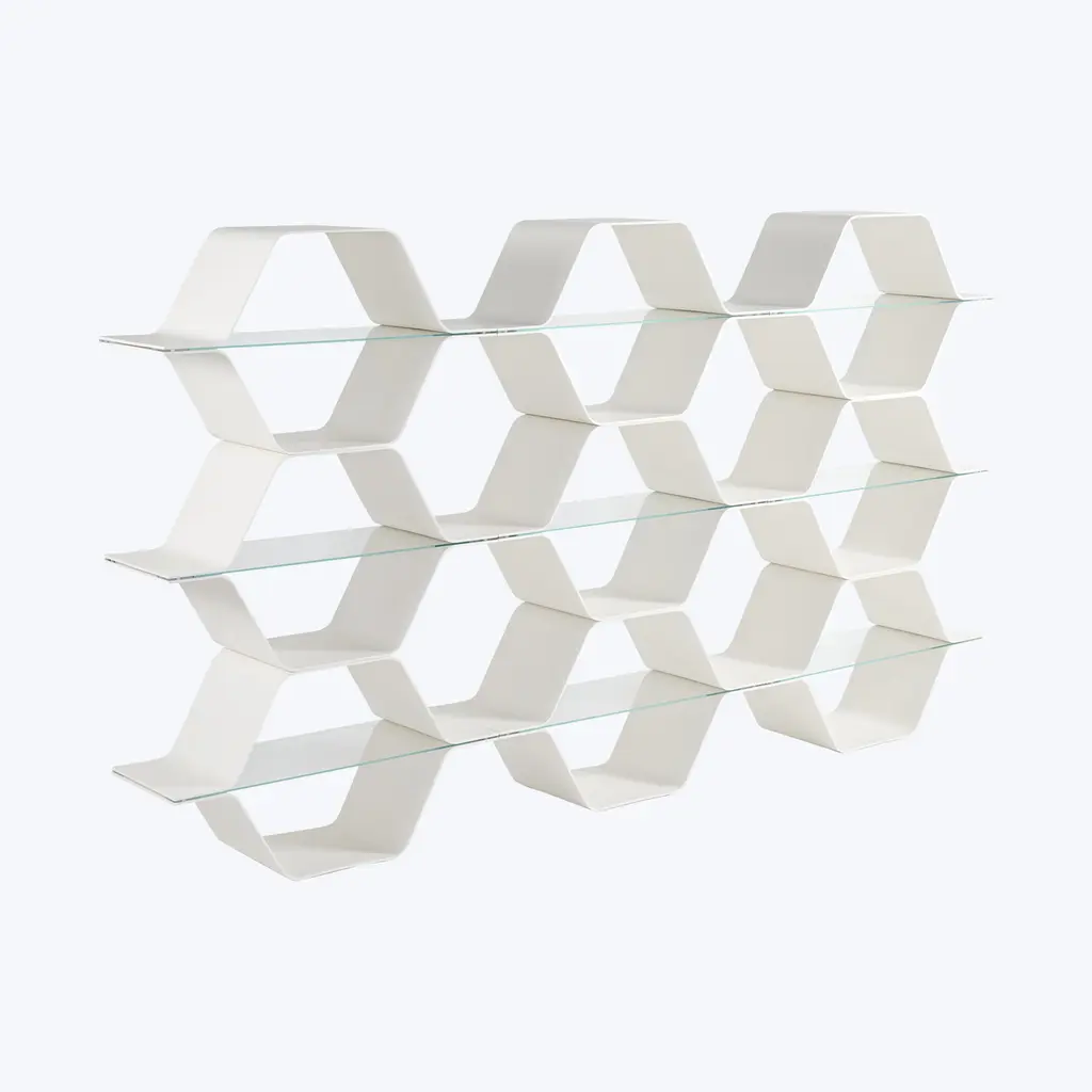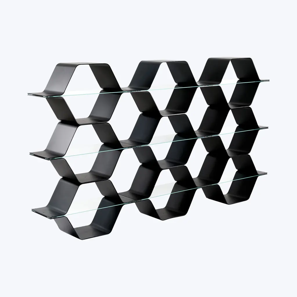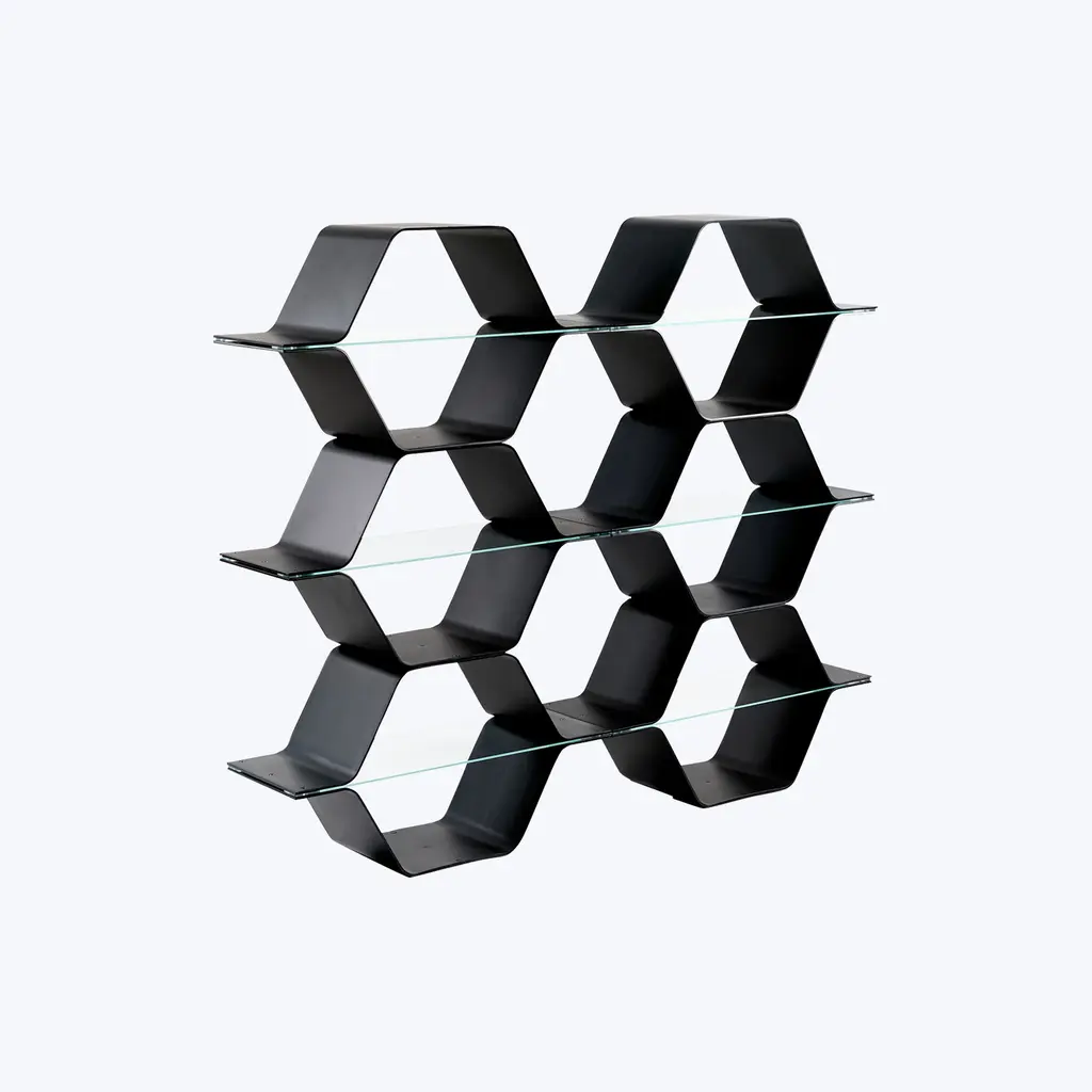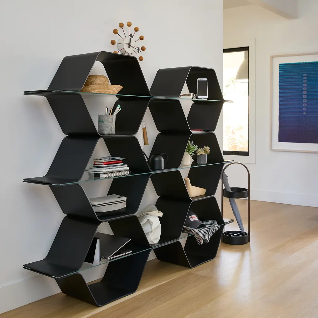 Discover the Honeycomb Modular Shelving by Heller. Originally designed in 1970 by Bill Curry, this dynamic shelving unit reflects the optimism of the California Space Age. Built for limitless expansion, the Honeycomb allows you to add more cells and create a configuration that suits your space. A striking, sculptural piece merging Spage Age innovation with sustainable design. Made in 100% recycled and compostable plastic. Available in black and white. Choose from single row, double row, and triple row configurations.