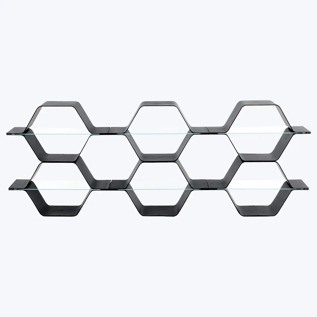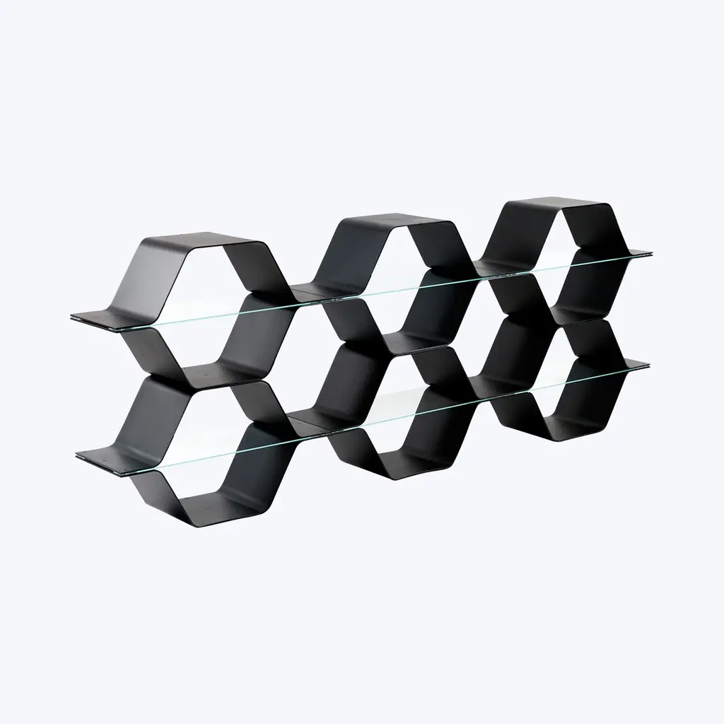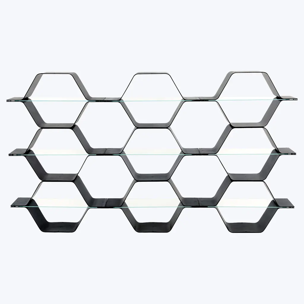 Discover the Honeycomb Modular Shelving by Heller. Originally designed in 1970 by Bill Curry, this dynamic shelving unit reflects the optimism of the California Space Age. Built for limitless expansion, the Honeycomb allows you to add more cells and create a configuration that suits your space. A striking, sculptural piece merging Spage Age innovation with sustainable design. Made in 100% recycled and compostable plastic. Available in black and white. Choose from single row, double row, and triple row configurations.