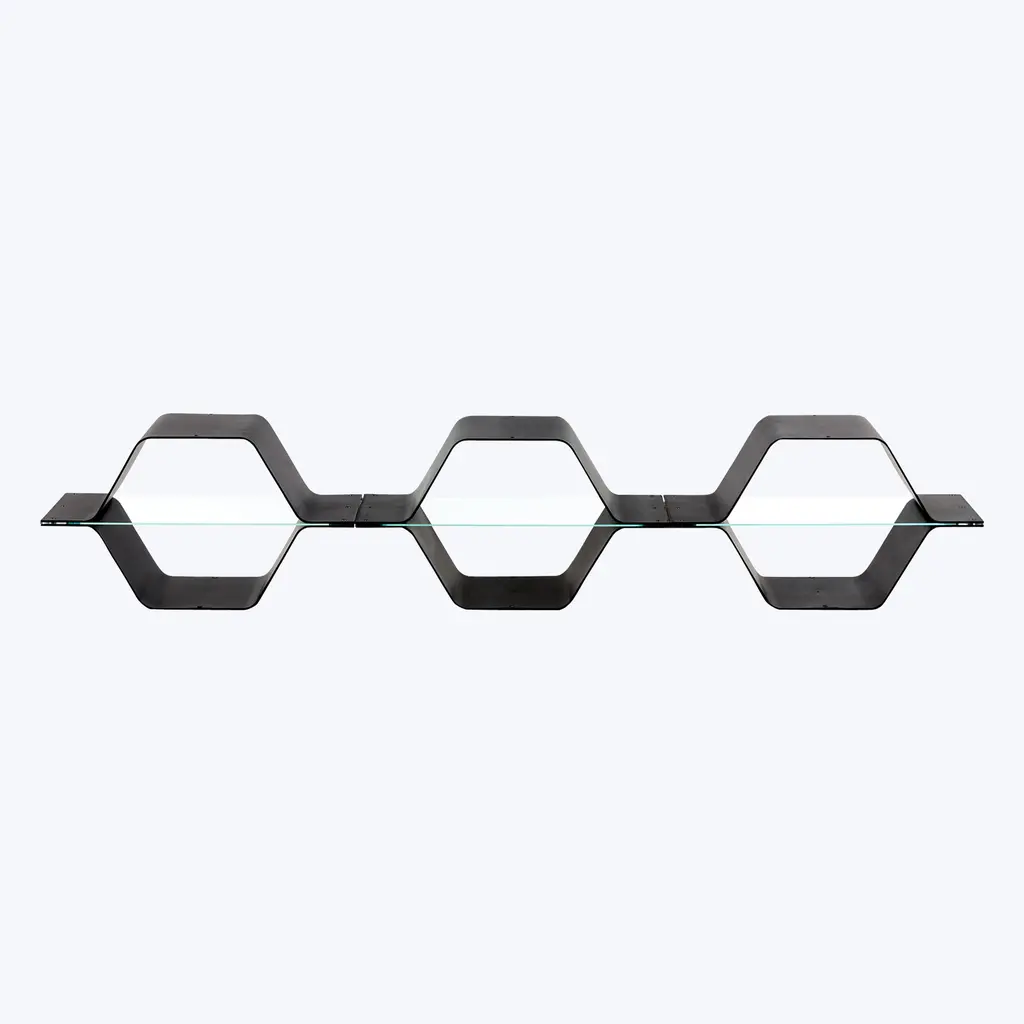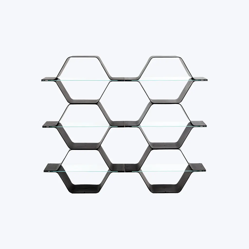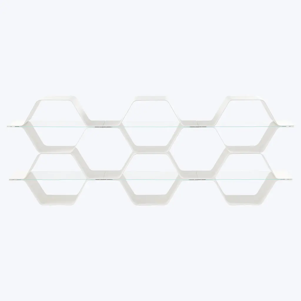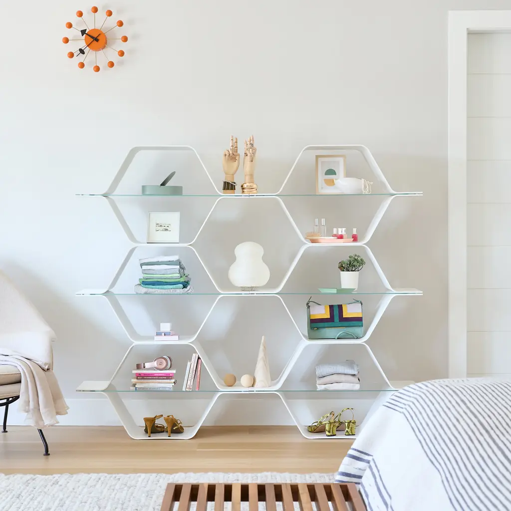Discover the Honeycomb Modular Shelving by Heller. Originally designed in 1970 by Bill Curry, this dynamic shelving unit reflects the optimism of the California Space Age. Built for limitless expansion, the Honeycomb allows you to add more cells and create a configuration that suits your space. A striking, sculptural piece merging Spage Age innovation with sustainable design. Made in 100% recycled and compostable plastic. Available in black and white. Choose from single row, double row, and triple row configurations.