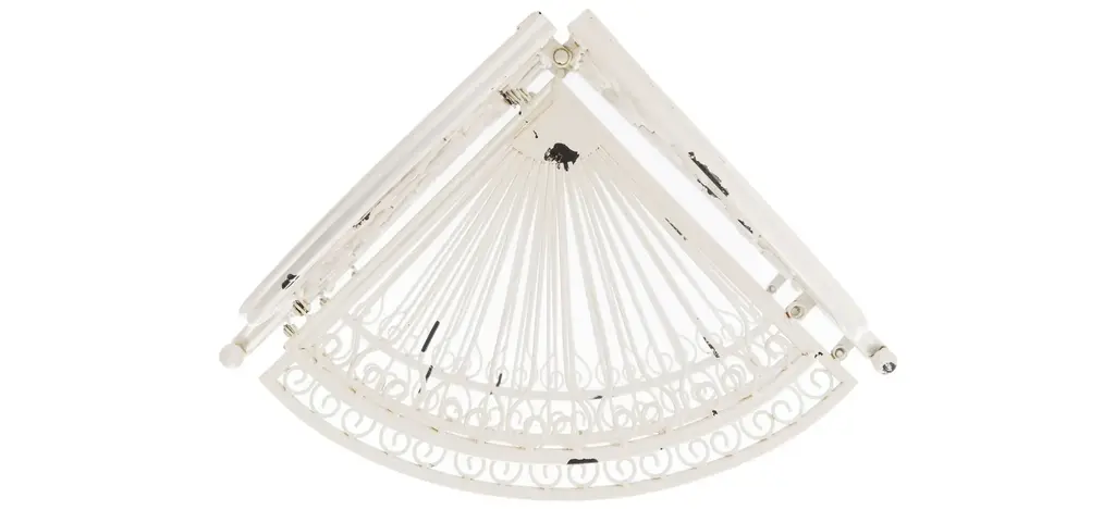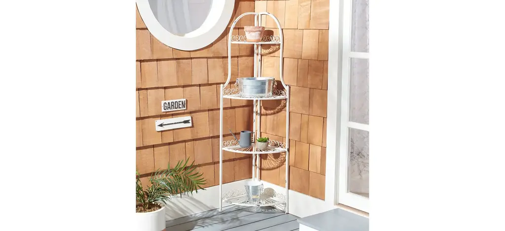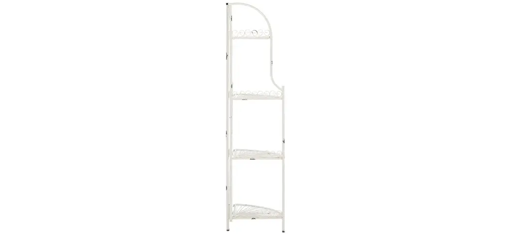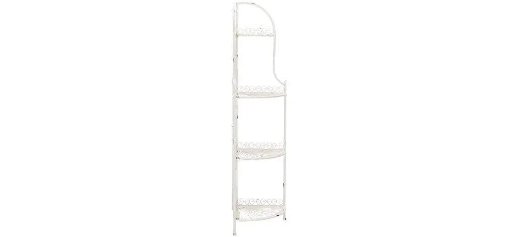 This Jovita outdoor corner shelf takes its inspiration from French patisseries, boasting four tiers with flourishing wrought iron details. An antique white finish gives Jovita the look of a well loved heirloom, while its wire shelves provide display or storage in any outdoor area.