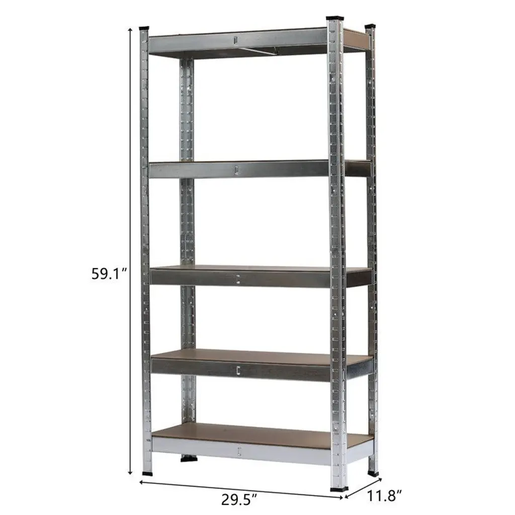 This high-quality storage shelf is constructed of metal plates. This 5-tier shelving unit can be used separately or combined with other shelves into a larger storage space to meet your various needs. Its boltless design allows it to be easily assembled and disassembled. This storage rack can be disassembled into a compact size for easy storing and transporting. It is an ideal storing and displaying solution in kitchens, garages, workshops, warehouses, and balconies.