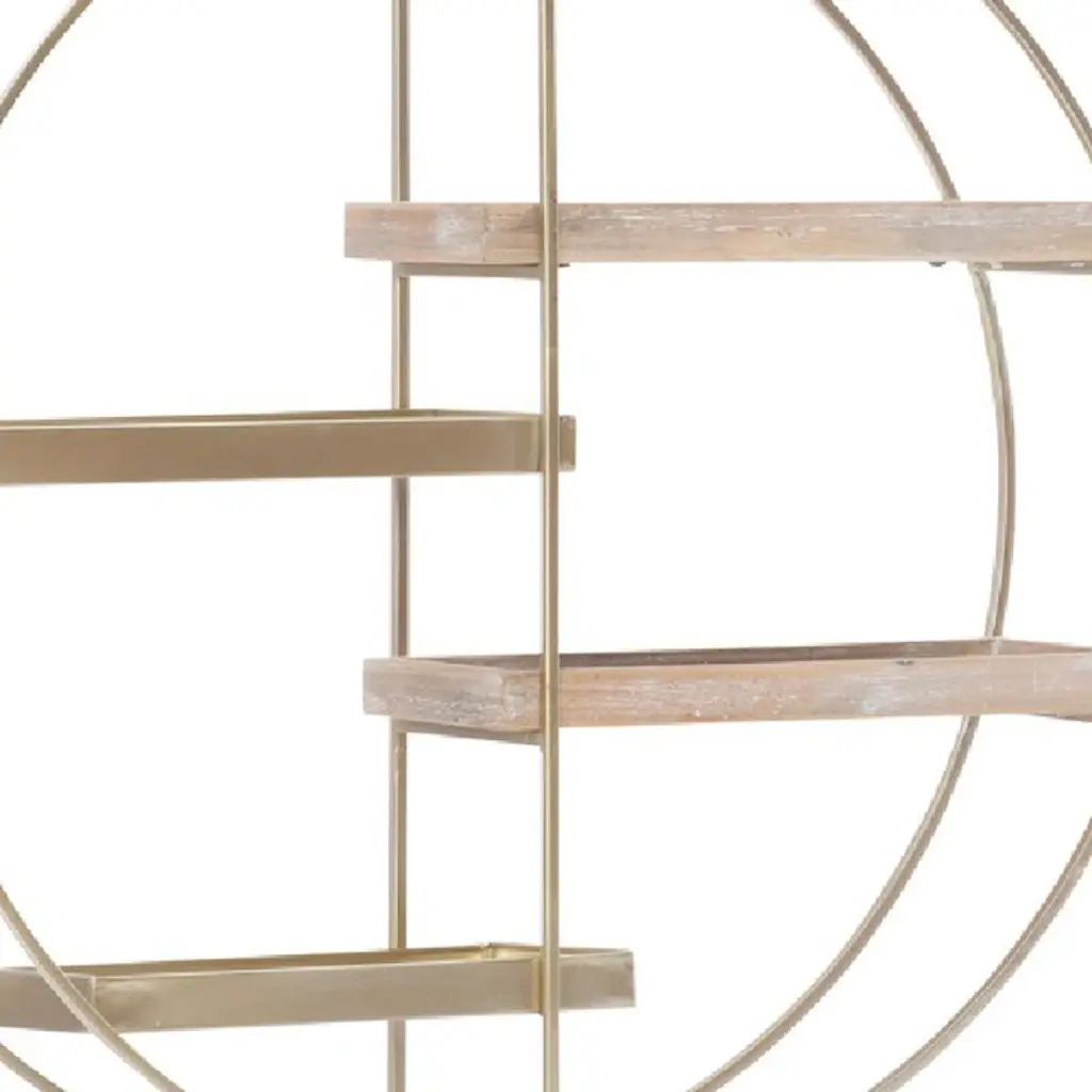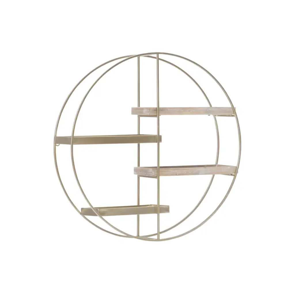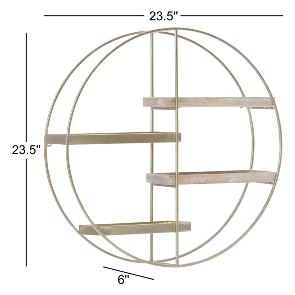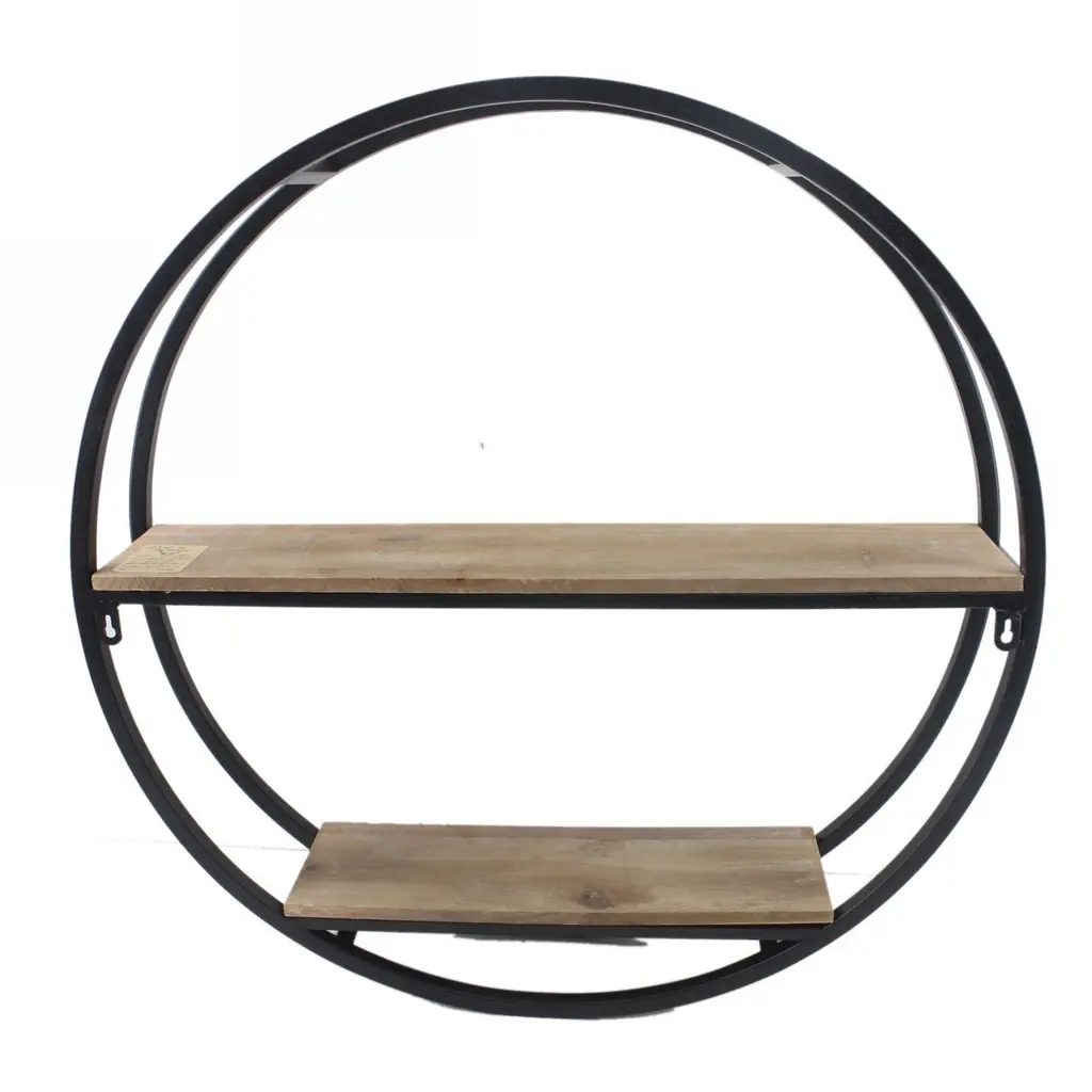 Show off sculptures and snapshots in a streamlined style with this circular wall shelf. A contemporary and industrial design, this shelving unit pairs a double round iron frame with 4 solid wood shelves for a touch of contrast. Whether hung in your living room, entryway, or bathroom, this unique piece acts as the perfect platform for displaying collected curios, perfumes, nail polish, hair accessories, and more. This handy wall shelf is an eye-catching focal point in any room.