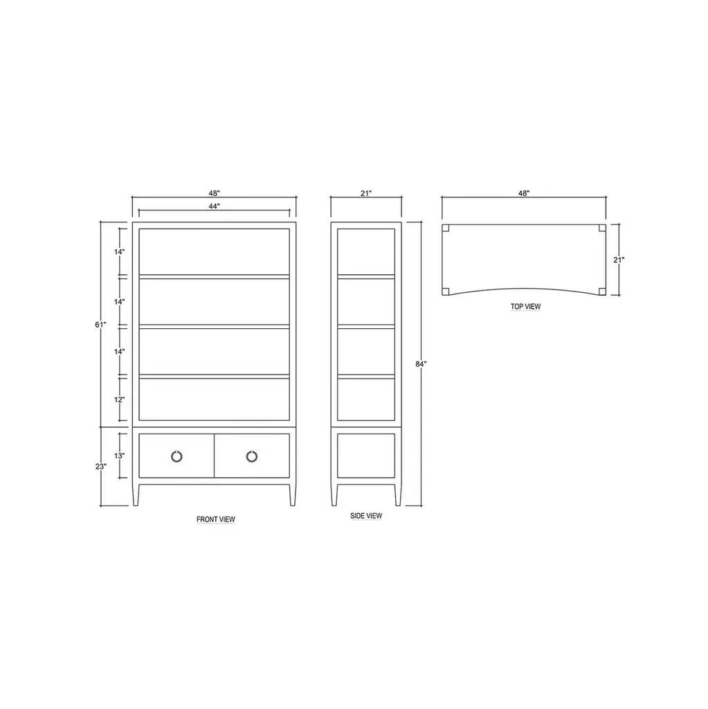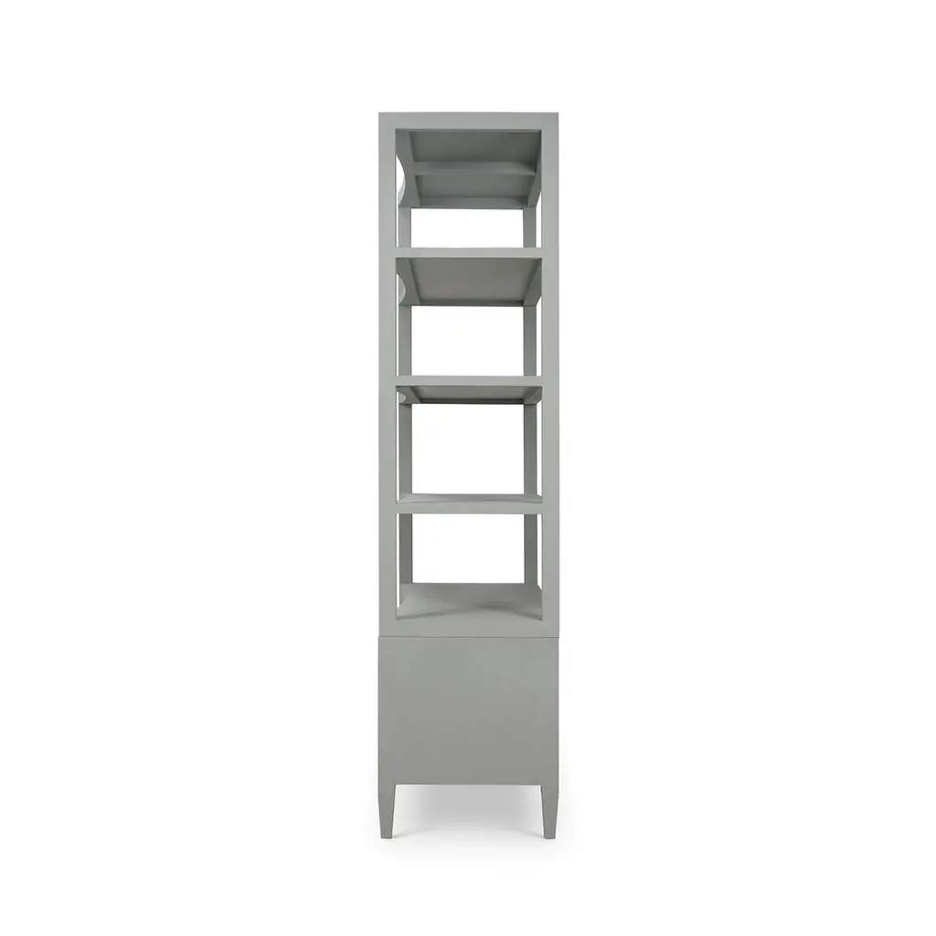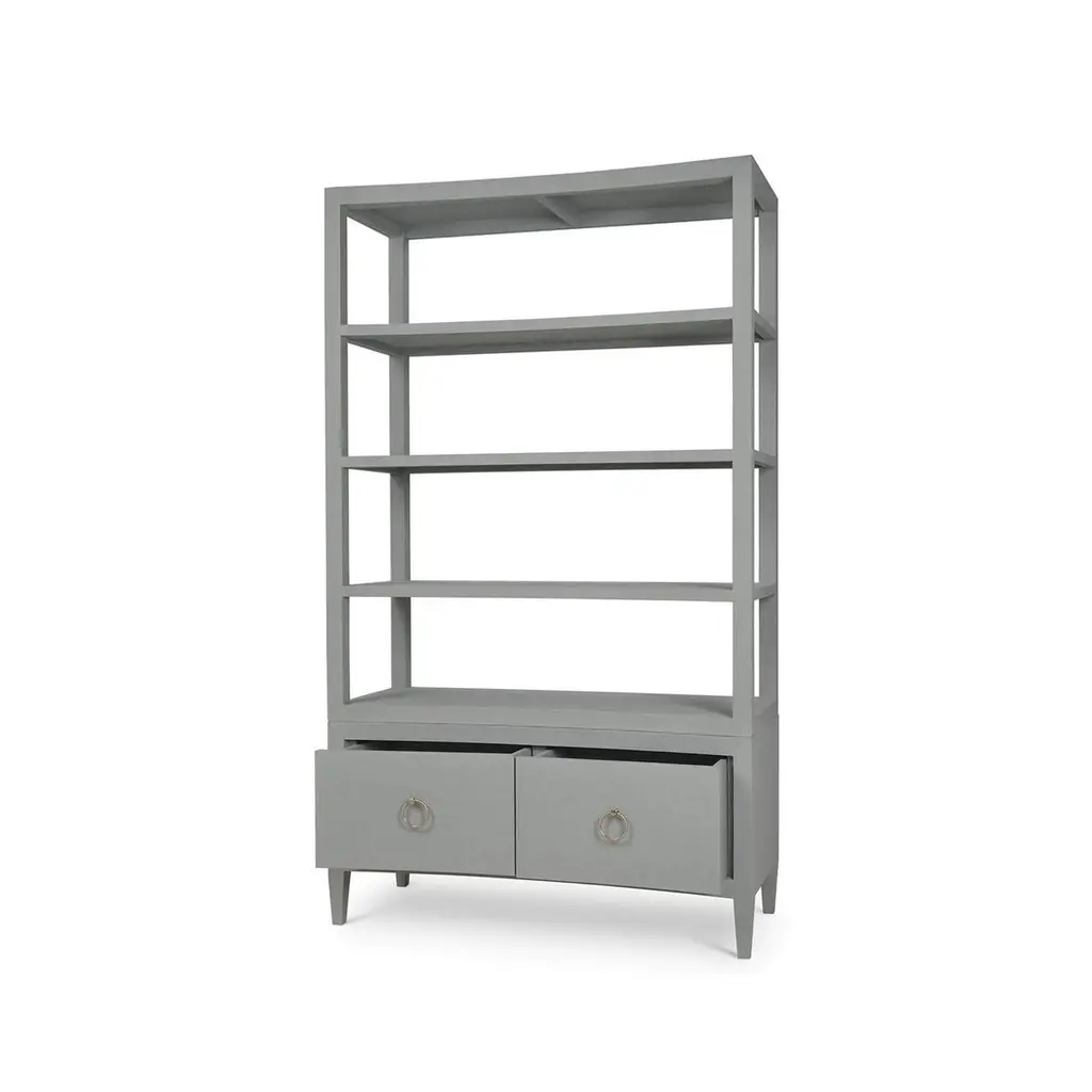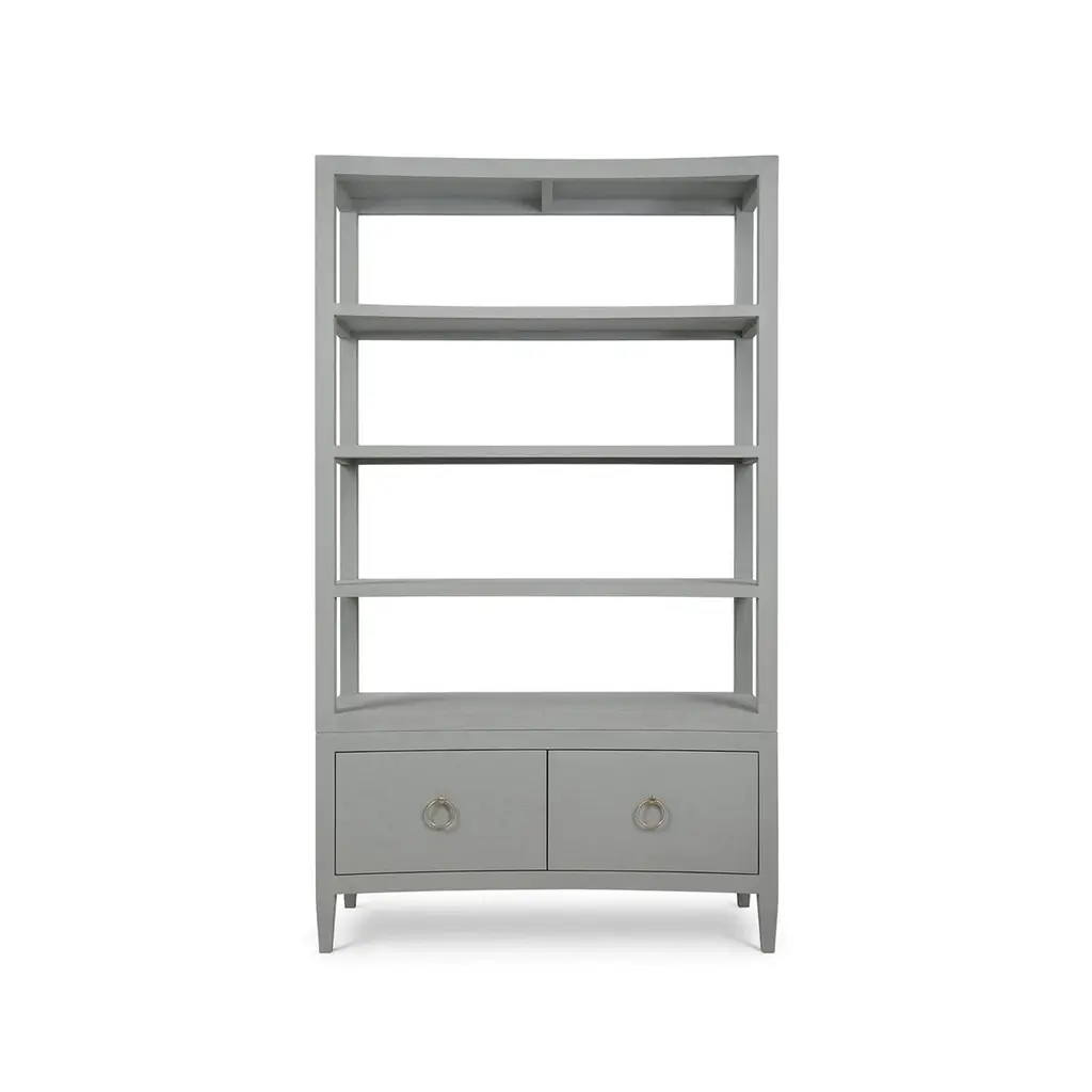 Wrapped in soft pale blue linen, this tall shelving unit features a subtly concave front that introduces movement and elegance to its minimalist profile. Four open shelves offer ample space for display, while two lower drawers with ring-pull hardware provide discreet storage.Perfectly suited for living rooms, home libraries, or stylish office settings, this étagère blends serene color with architectural form. The wrapped linen surface adds a tactile dimension, while the graceful curvature of the silhouette gives a nod to modern Asian-inspired design. Sophisticated yet approachable, it complements both monochromatic and richly layered interiors.Dimensions: 48" W x 21" D x 84" HCustom finish options are also available. Contact us to learn more.