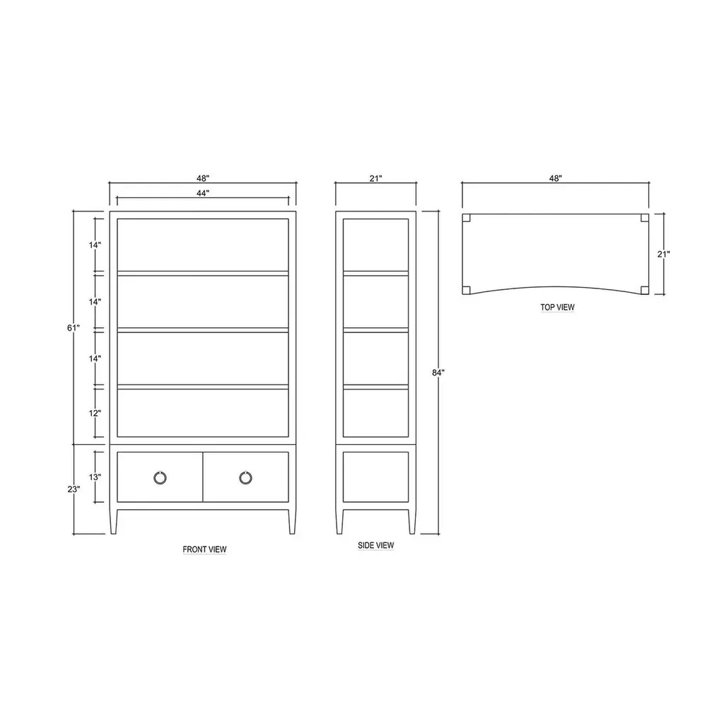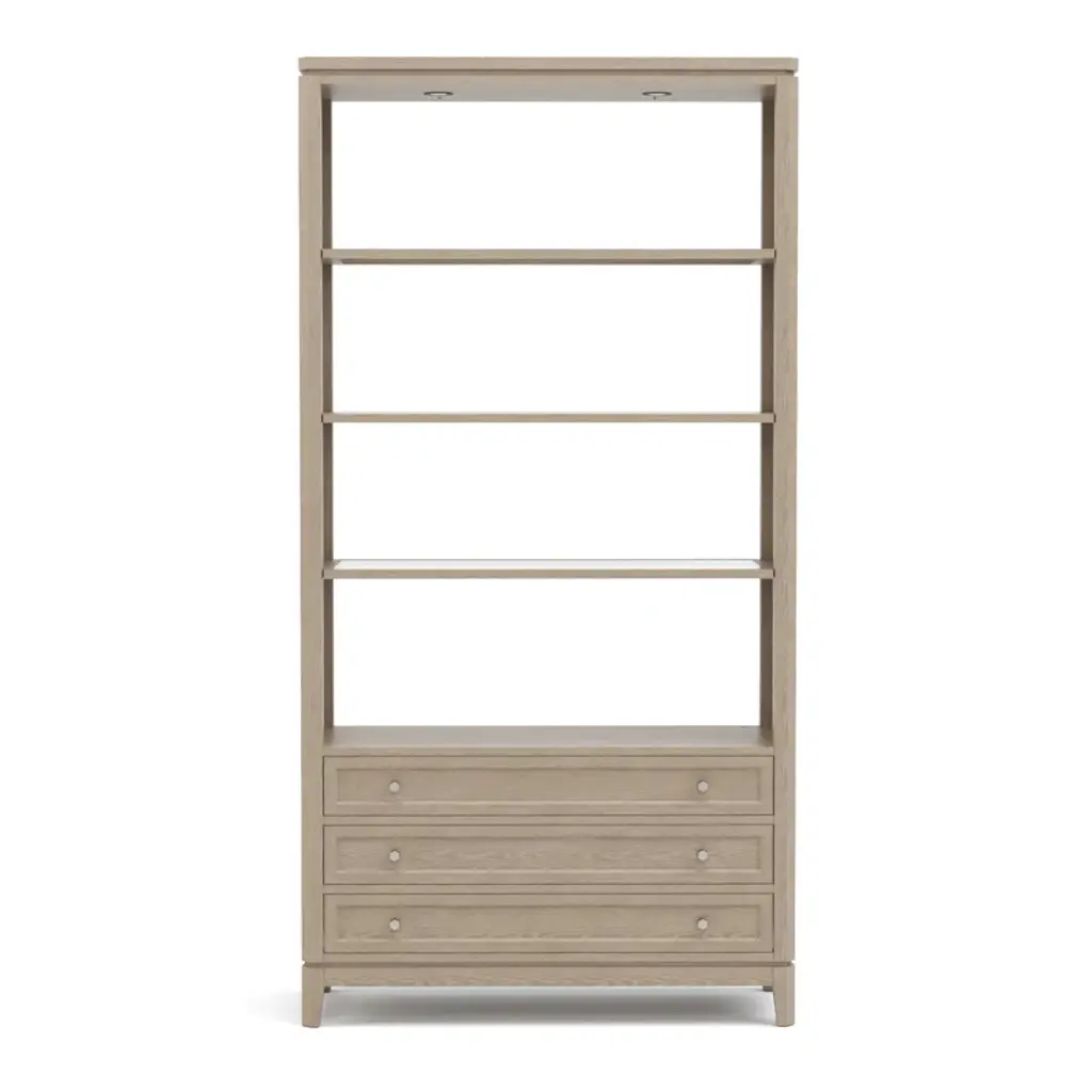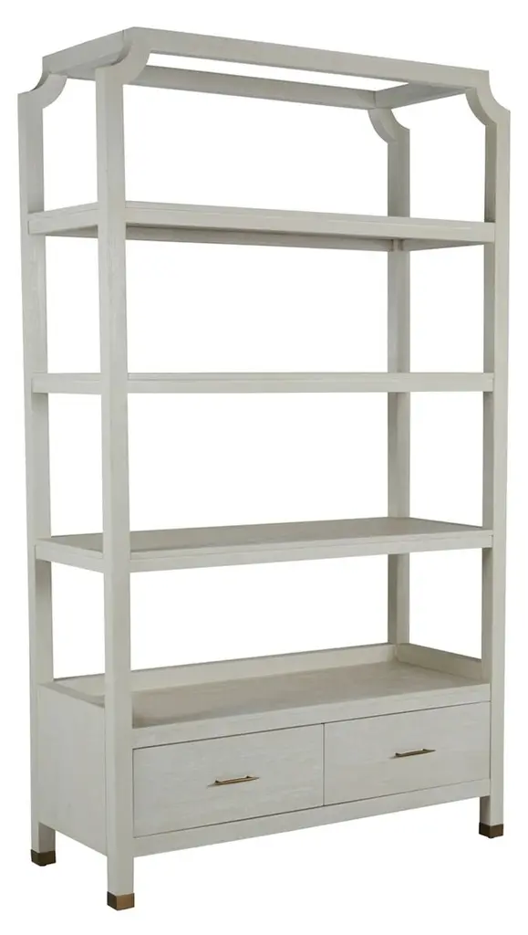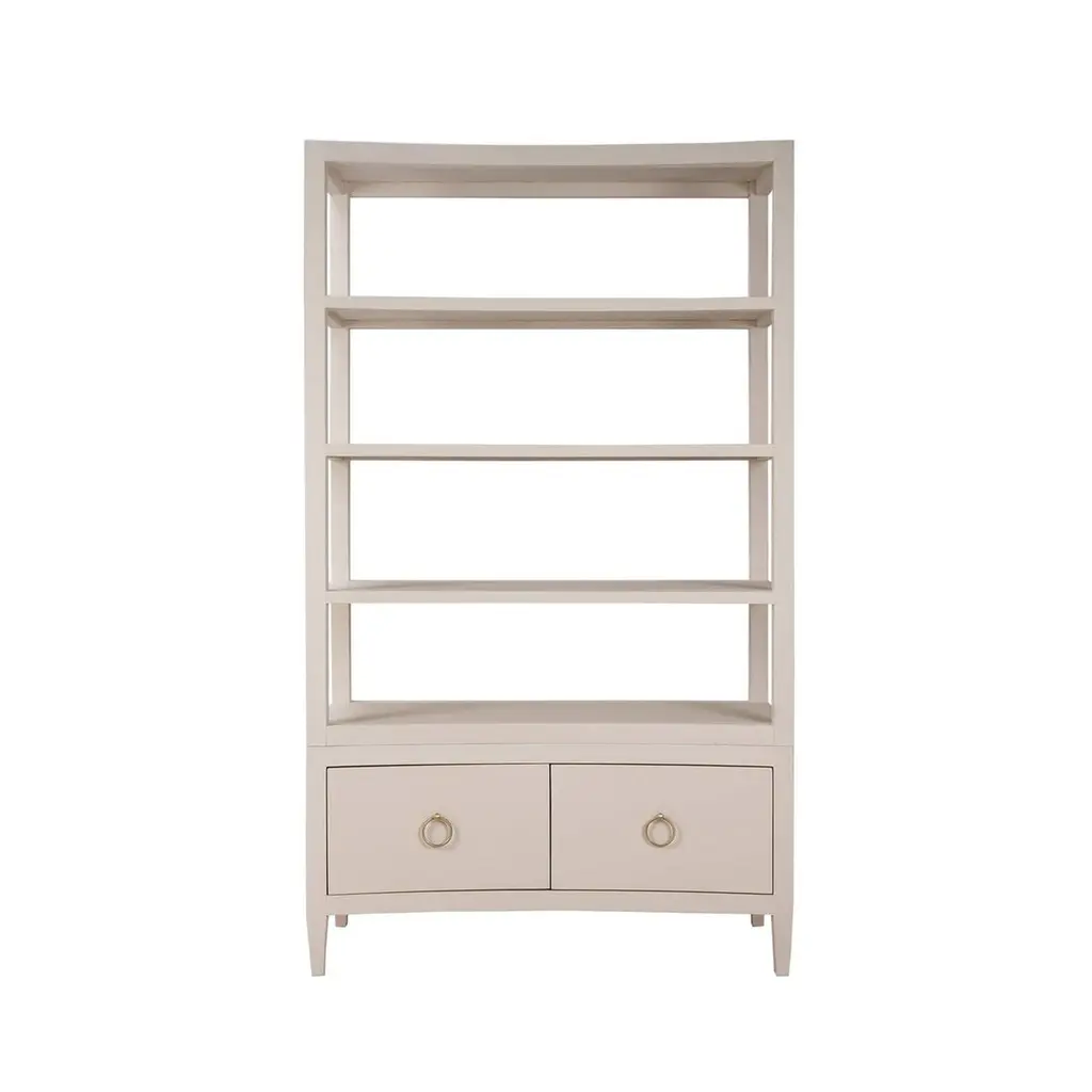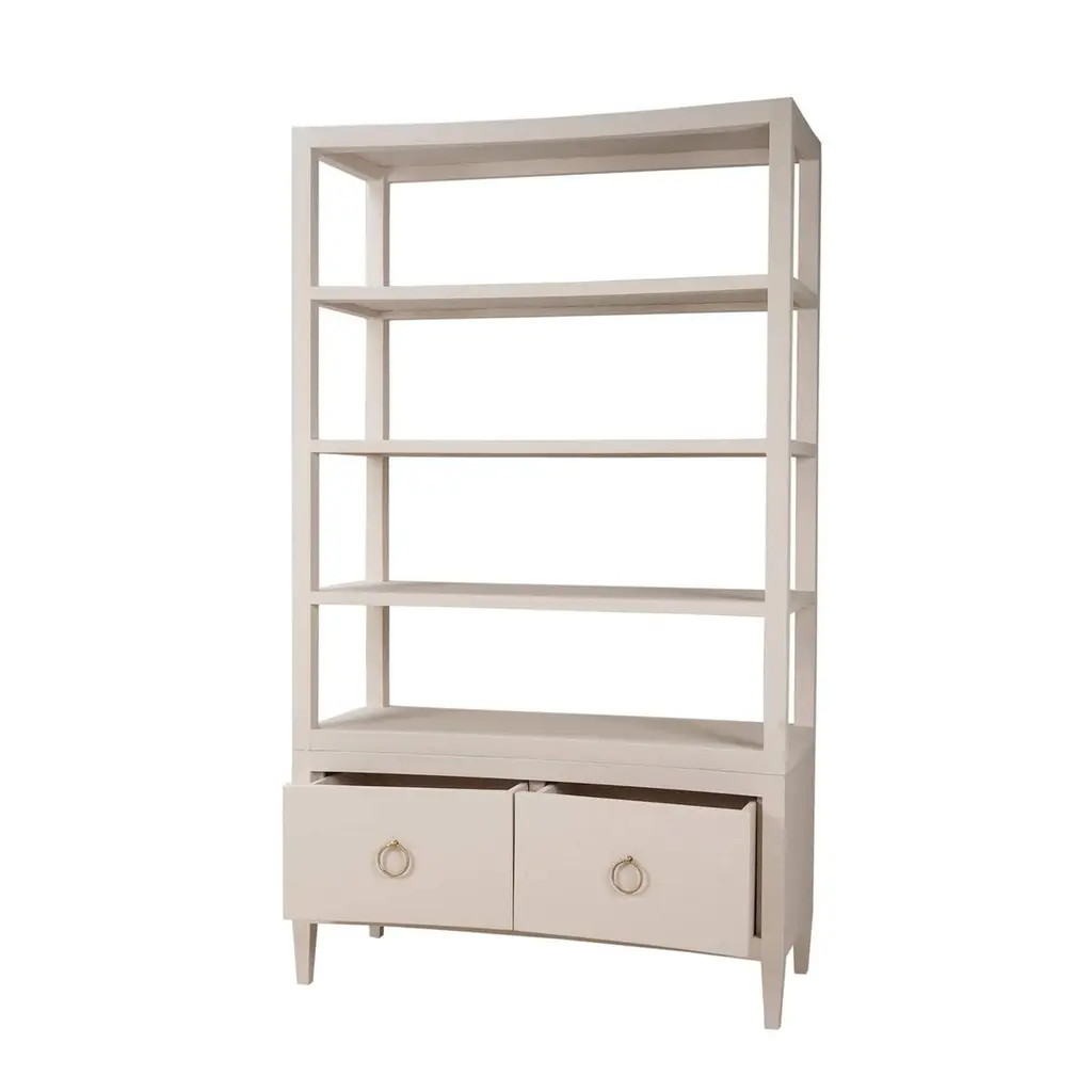 Wrapped in soft ivory putty color linen, this tall shelving unit features a subtly concave front that introduces movement and elegance to its minimalist profile. Four open shelves offer ample space for display, while two lower drawers with ring-pull hardware provide discreet storage.Perfectly suited for living rooms, home libraries, or stylish office settings, this étagère blends serene color with architectural form. The wrapped linen surface adds a tactile dimension, while the graceful curvature of the silhouette gives a nod to modern Asian-inspired design. Sophisticated yet approachable, it complements both monochromatic and richly layered interiors.Dimensions: 48" W x 21" D x 84" HCustom finish options are also available. Contact us to learn more.Lead time is 14 - 16 weeks.
