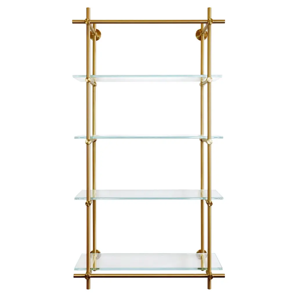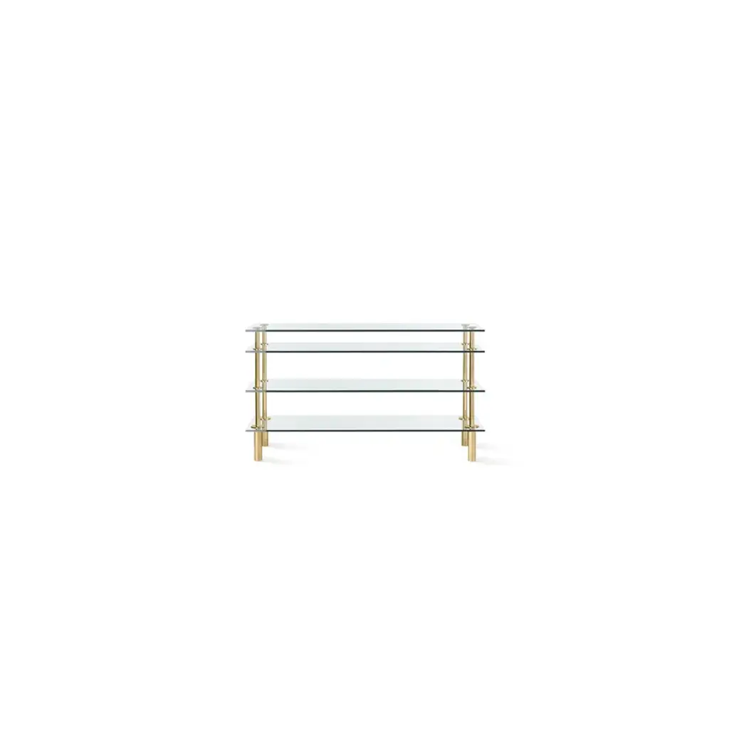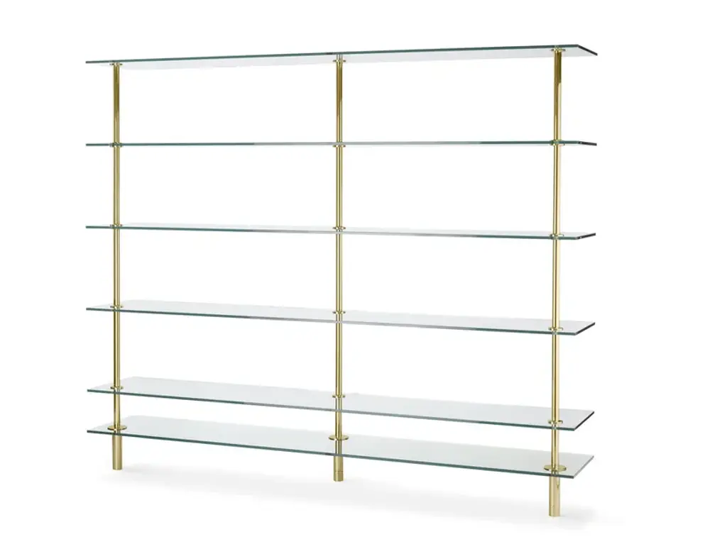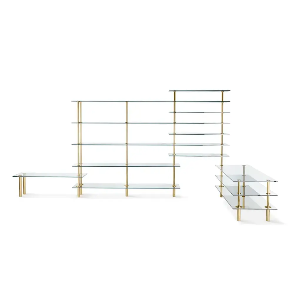 LEGS - Sectional bookcaseTop variants:Crystal or WoodStructure:- Burnished brass.The designer imagines a turning point in the use of such a precious finishes such as polished brass: from the idea of almost a unique object in its perfect craftsmanship, to the system to be built starting from the base.A column made of brass whose different diameters define base and capital, just as the columns of classic architecture.The column multiplies to infinity, is interrupted and then resumed to hold glass tops, wood or marble and configure even angular shelves, tables, small tables, displays and consoles.A landscape of almost infinite possibilities that designers and end users can chose from to organize the space both in domestic and contract situations, maintaining aesthetic uniformity in the name of a more refined elegance.
