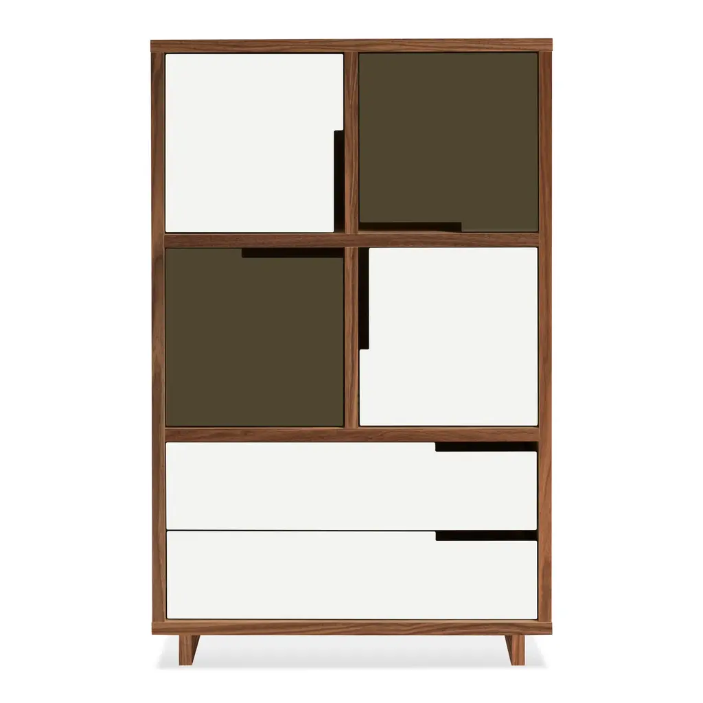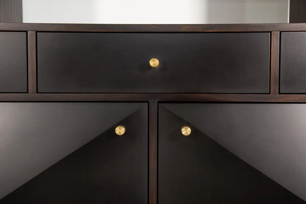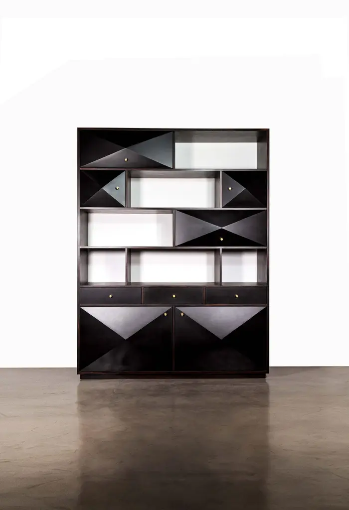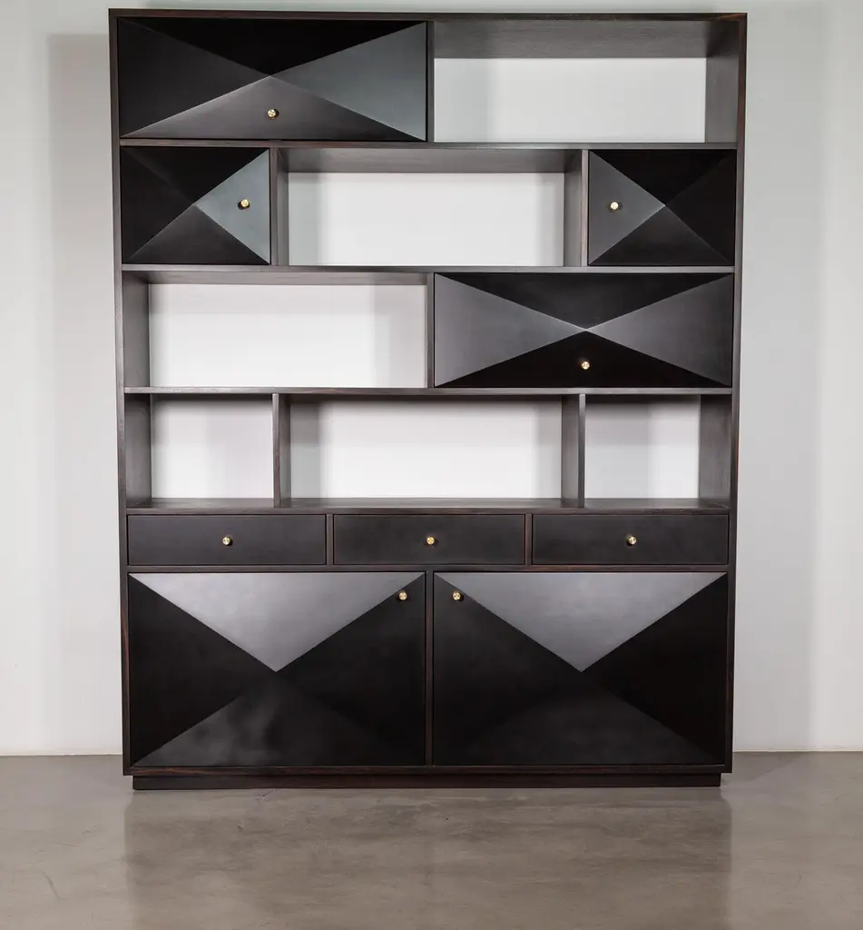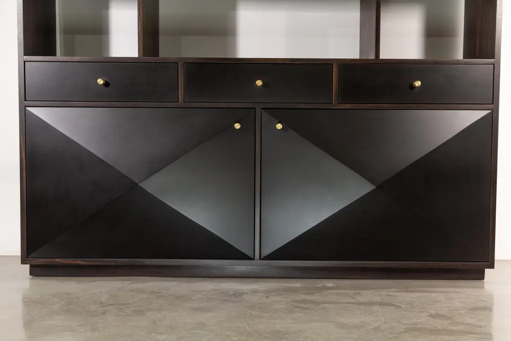 This stunning shelf unit is shown in a Macassar Ebony frame with ebonized doors and custom bronze hardware. It can be ordered as shown or in the wood, finish, size and door configuration that you desire.