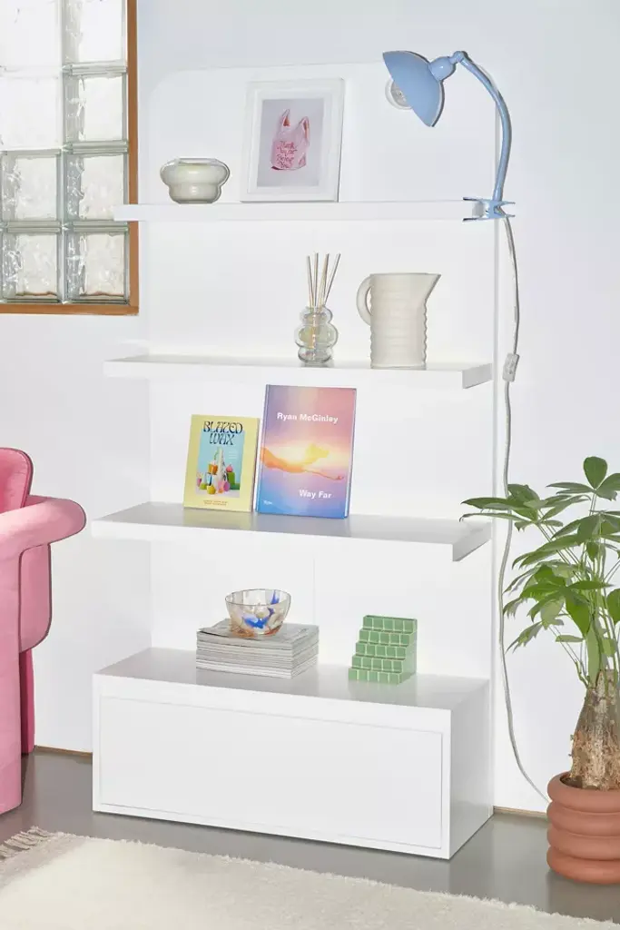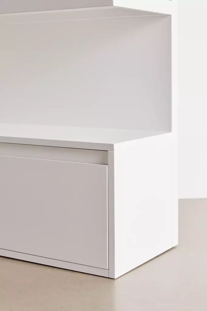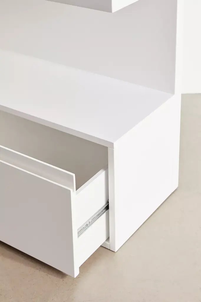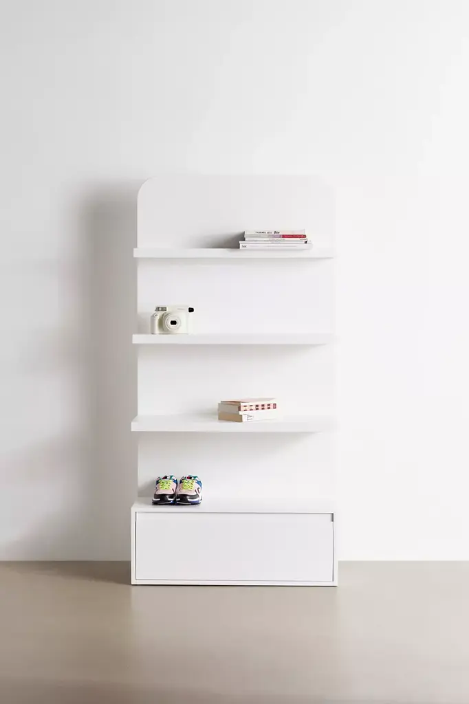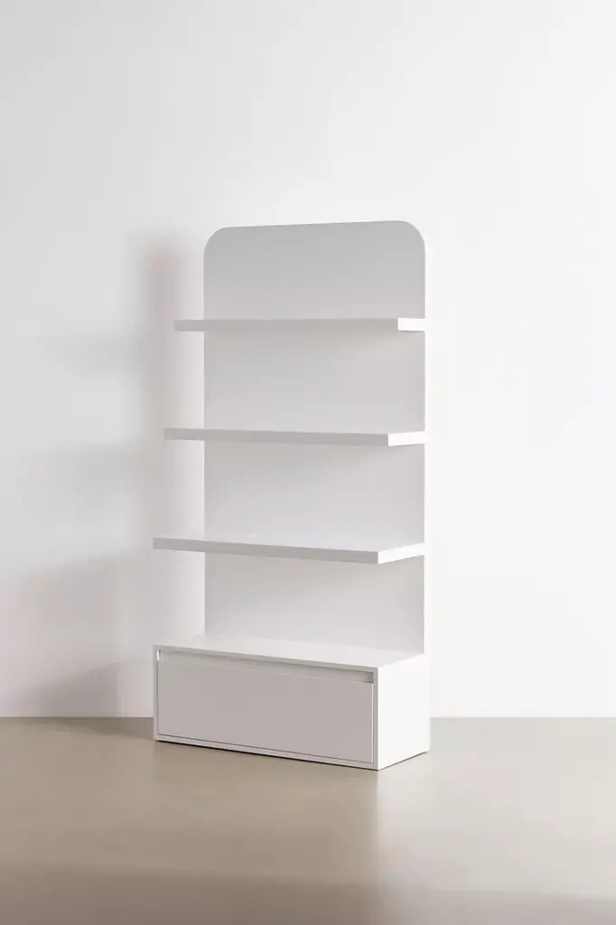 Curate your sleek display with this modernist storage shelf. Standing design with a lacquered finish features rounded edges and a trio of shelves with varied depth, set above a pull-out base drawer with metal glides. Perfect for showing off your favorite accessories, coffee table books, plants and art pieces. Assembly required. Available exclusively at Urban Outfitters.