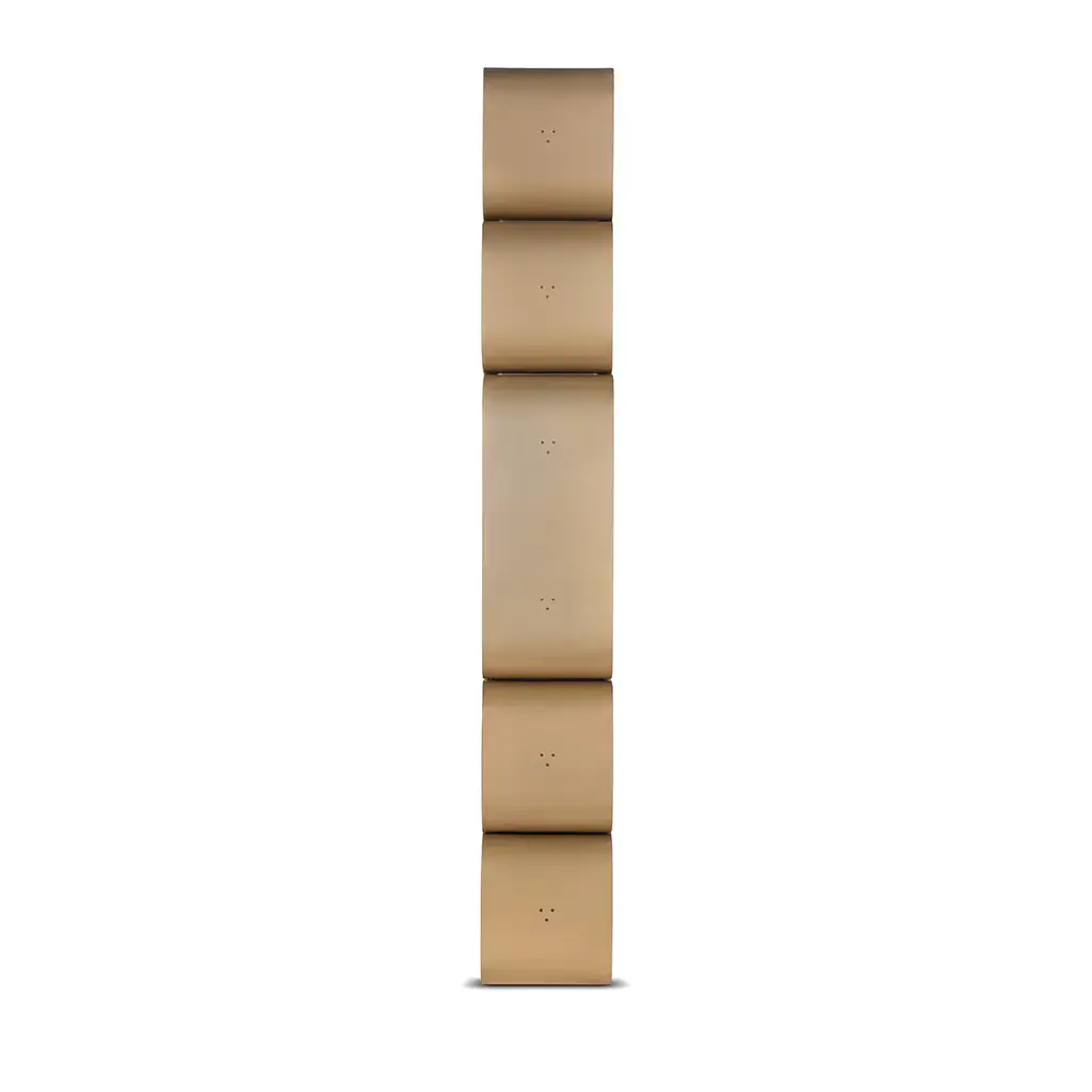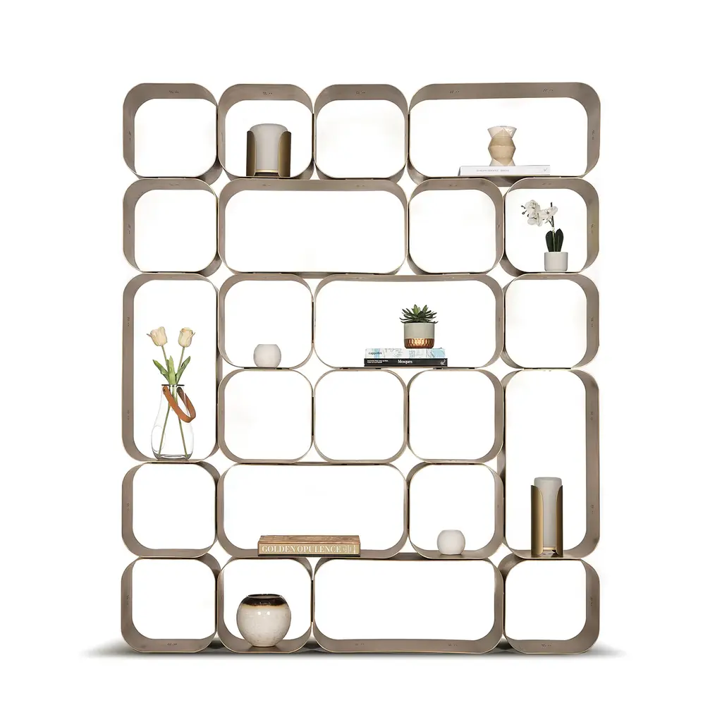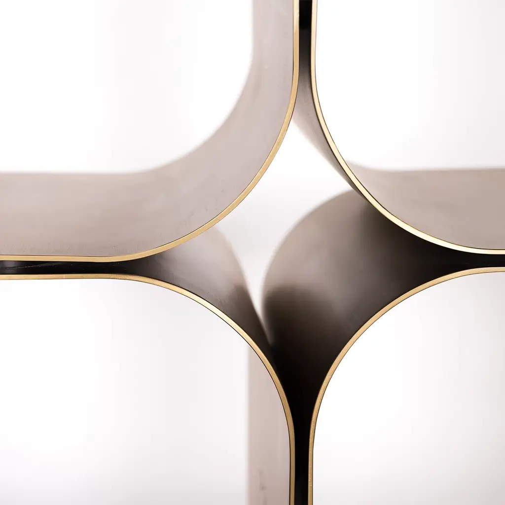 The maktaba wall unit was co-created by FROMM. X Shua’a Ali. Distinguished by its luxurious gold finish and crafted from durable steel, the Maktaba wall unit embodies the perfect fusion of aesthetics and functionality. This exquisite piece showcases a balanced composition of shelving units, offering an ideal storage solution tailored for contemporary living spaces. Maktaba is an elegant and practical addition that enhances both style and organization, sure to redefine any space.