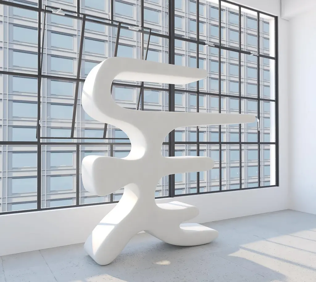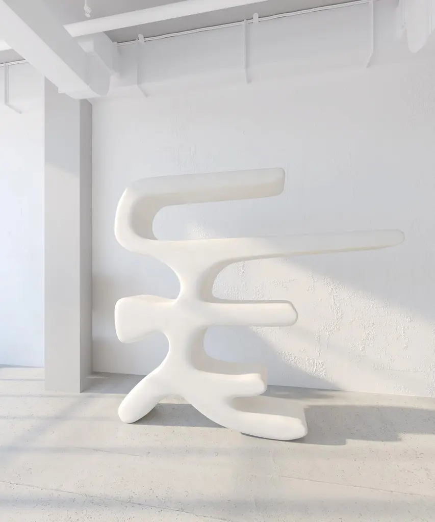 The extraordinary and playful Mirth Shelving/Room Divider is a harmonious blend of functionality and artistic expression. Crafted from concrete, finished to an impeccably high smooth polish, its sleek surface reflects an unparalleled level of craftsmanship. The biomorphic design, reminiscent of a Celtic rune, captivates with organic allure, seamlessly integrating into any space. This versatile piece not only divides rooms with an elegant flair but also serves as a whimsical shelving unit. The humorous energy infused into its form adds a delightful touch to a room, while making a strong statement. As a functional yet sculptural work of art, the Mirth redefines utilitarianism, bringing a unique blend of practicality and aesthetic charm to your living spaces. Definitely a statement piece!!!Dimensions: 71” wide x 12” deep x 66” highColor and size modifications are possible.