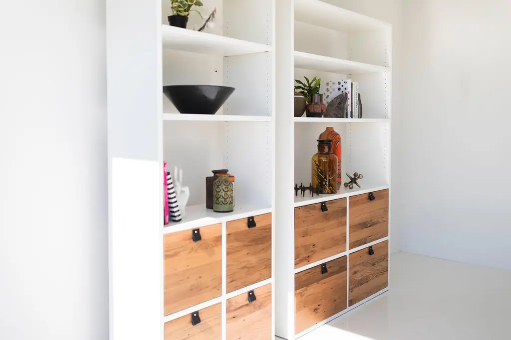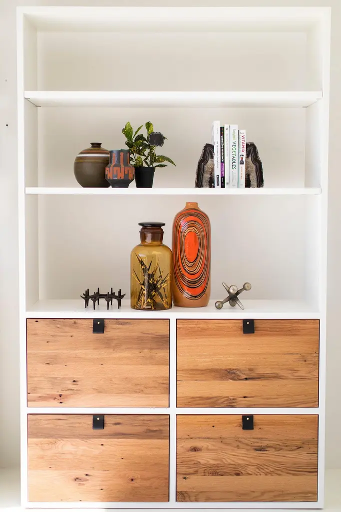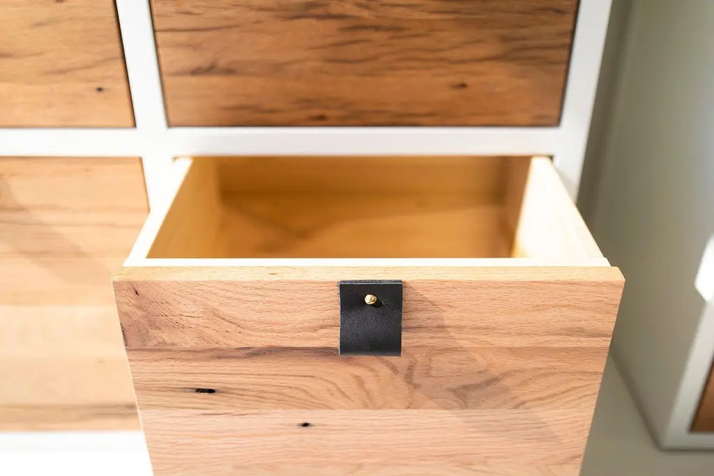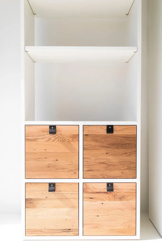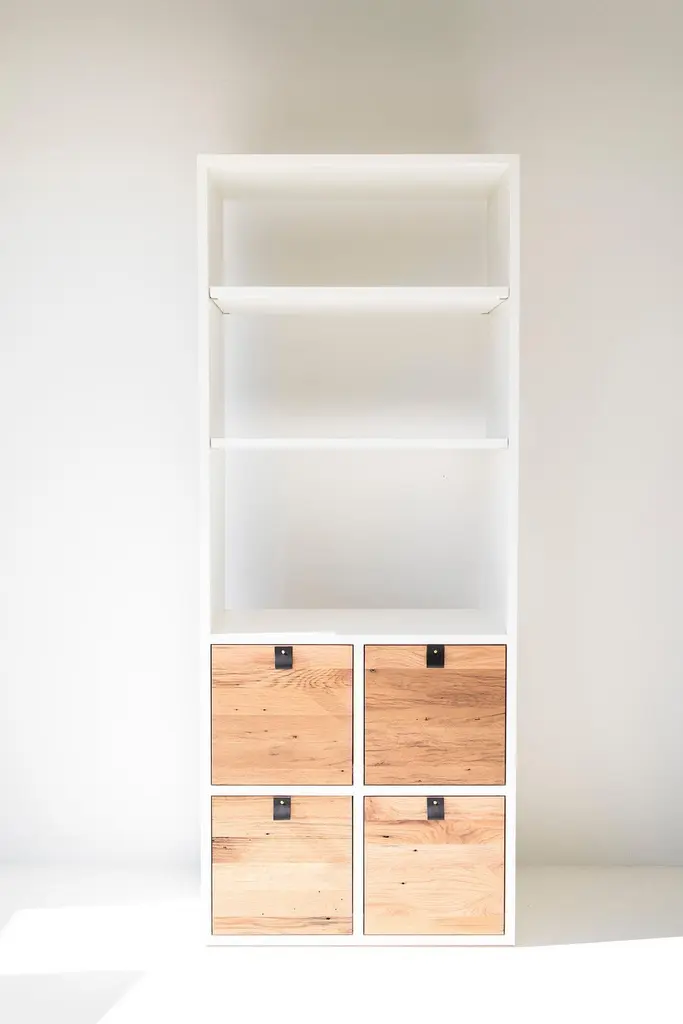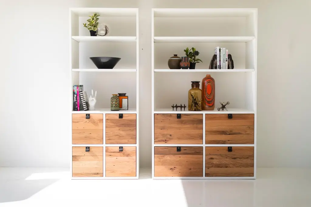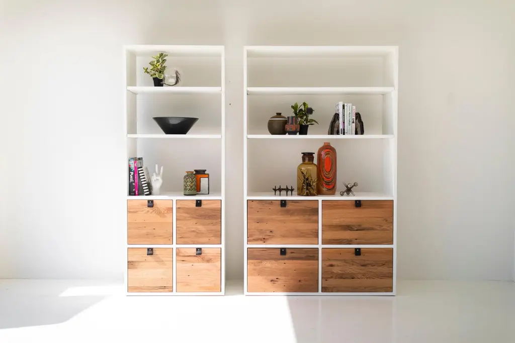Sorry, we are no longer offering reclaimed oak. If you like this design, please contact us for pricing on other wood species!This modern wall unit for Bertu Home is made to order and has the best of both worlds - open shelving and closed drawers. It's made in the heart of Ohio with locally sourced wood. Each shelving unit is hand-made with solid maple finished in a commercial grade matte lacquer. The drawers are dove-tailed with reclaimed oak fronts and black leather pulls. The drawers are designed with the perfect height to fit folders, binders, and files. We hope you love these as much as we do!Specs: Period/Model: New; Mid-Century Modern inspiredSpecs: Matte lacquered maple, reclaimed oakCustomizable: Yes! It's what we do:)Dimensions:H 80"W 34" (small) - 47" (large)D 15".