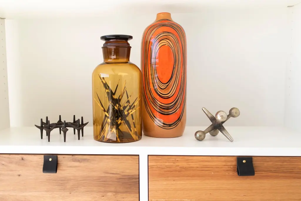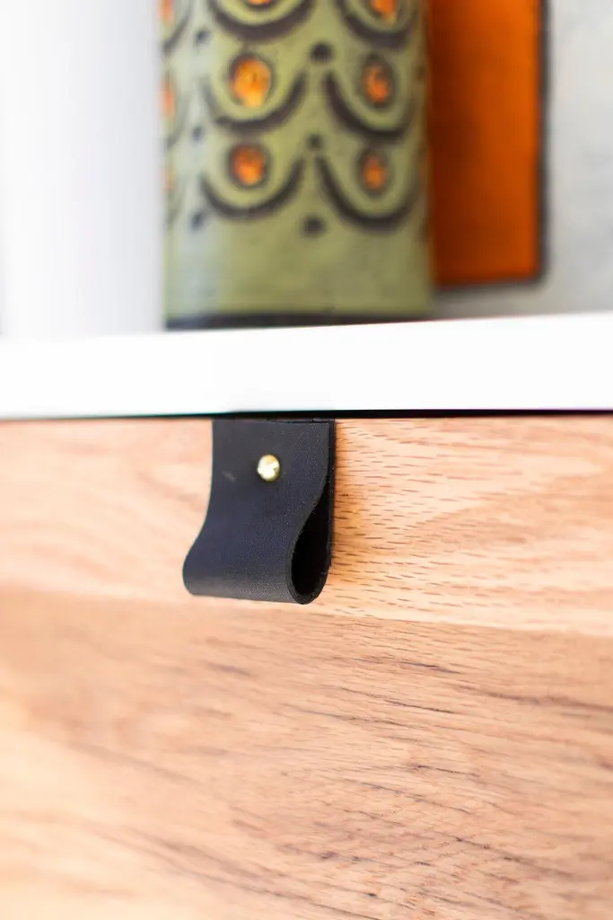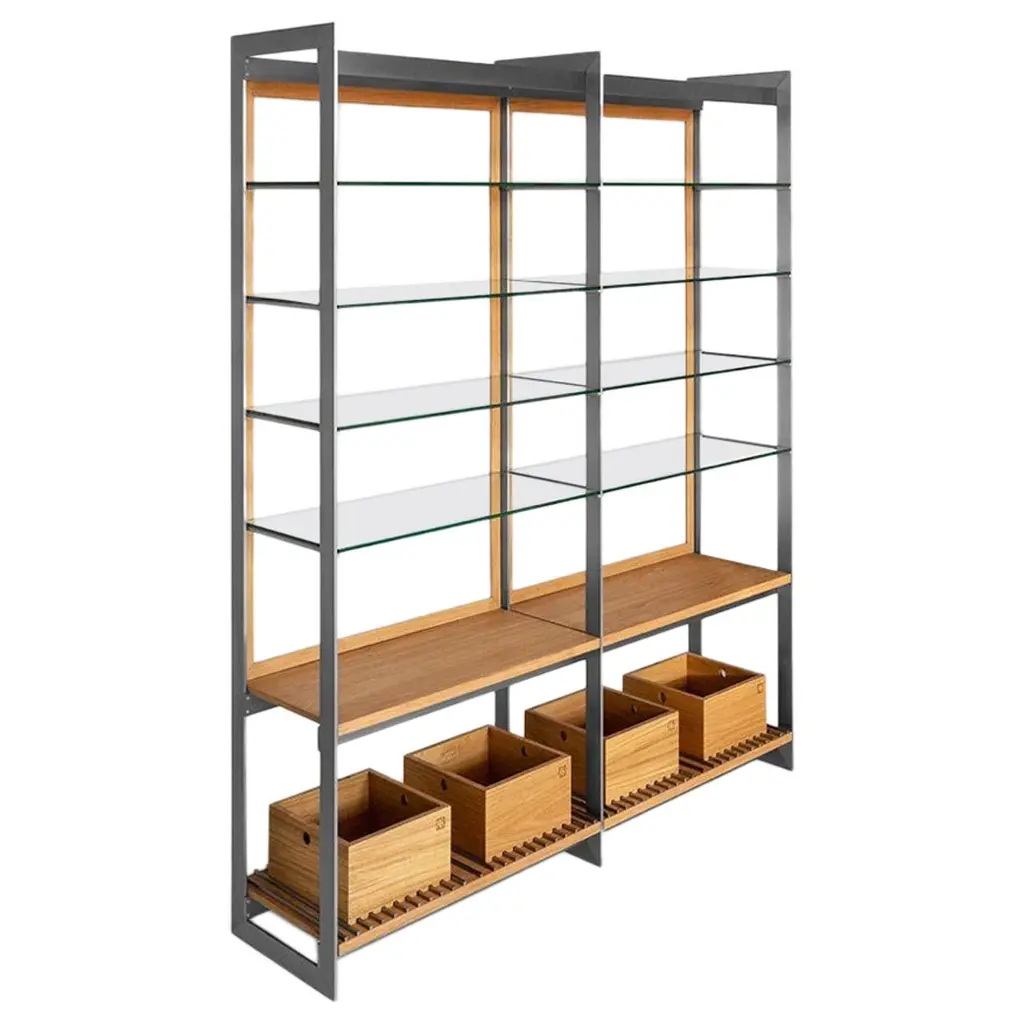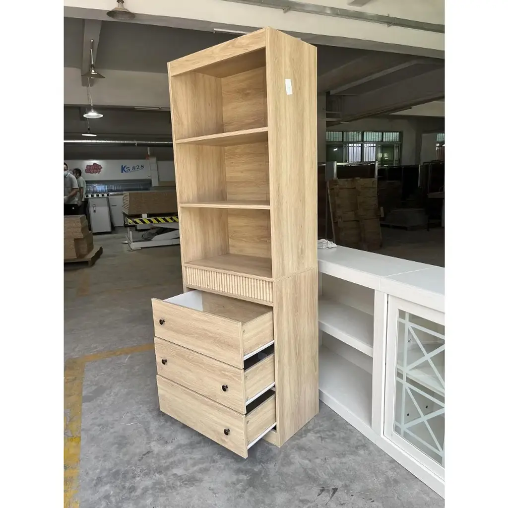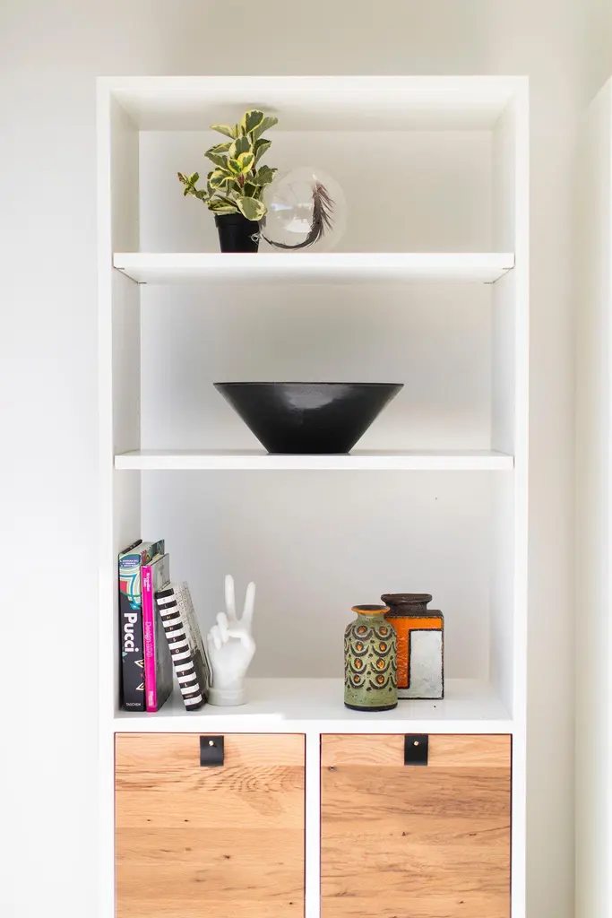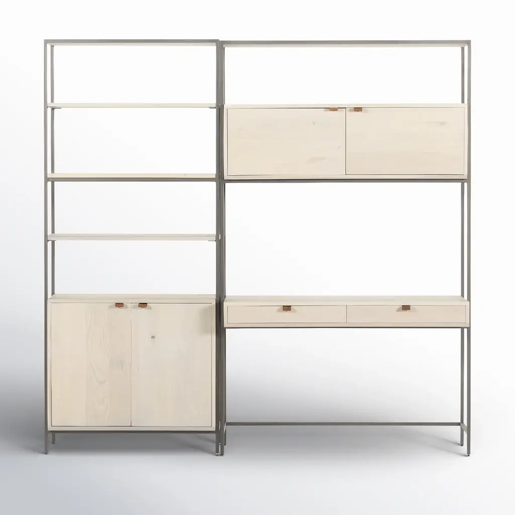 Sorry, we are no longer offering reclaimed oak. If you like this design, please contact us for pricing on other wood species!This modern wall unit for Bertu Home is made to order and has the best of both worlds - open shelving and closed drawers. It's made in the heart of Ohio with locally sourced wood. Each shelving unit is hand-made with solid maple finished in a commercial grade matte lacquer. The drawers are dove-tailed with reclaimed oak fronts and black leather pulls. The drawers are designed with the perfect height to fit folders, binders, and files. We hope you love these as much as we do!Specs: Period/Model: New; Mid-Century Modern inspiredSpecs: Matte lacquered maple, reclaimed oakCustomizable: Yes! It's what we do:)Dimensions:H 80"W 34" (small) - 47" (large)D 15".