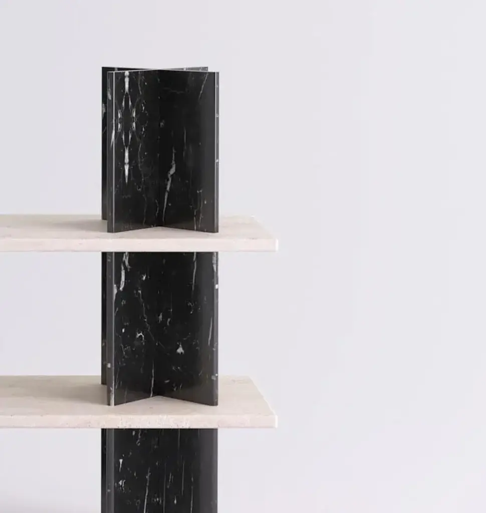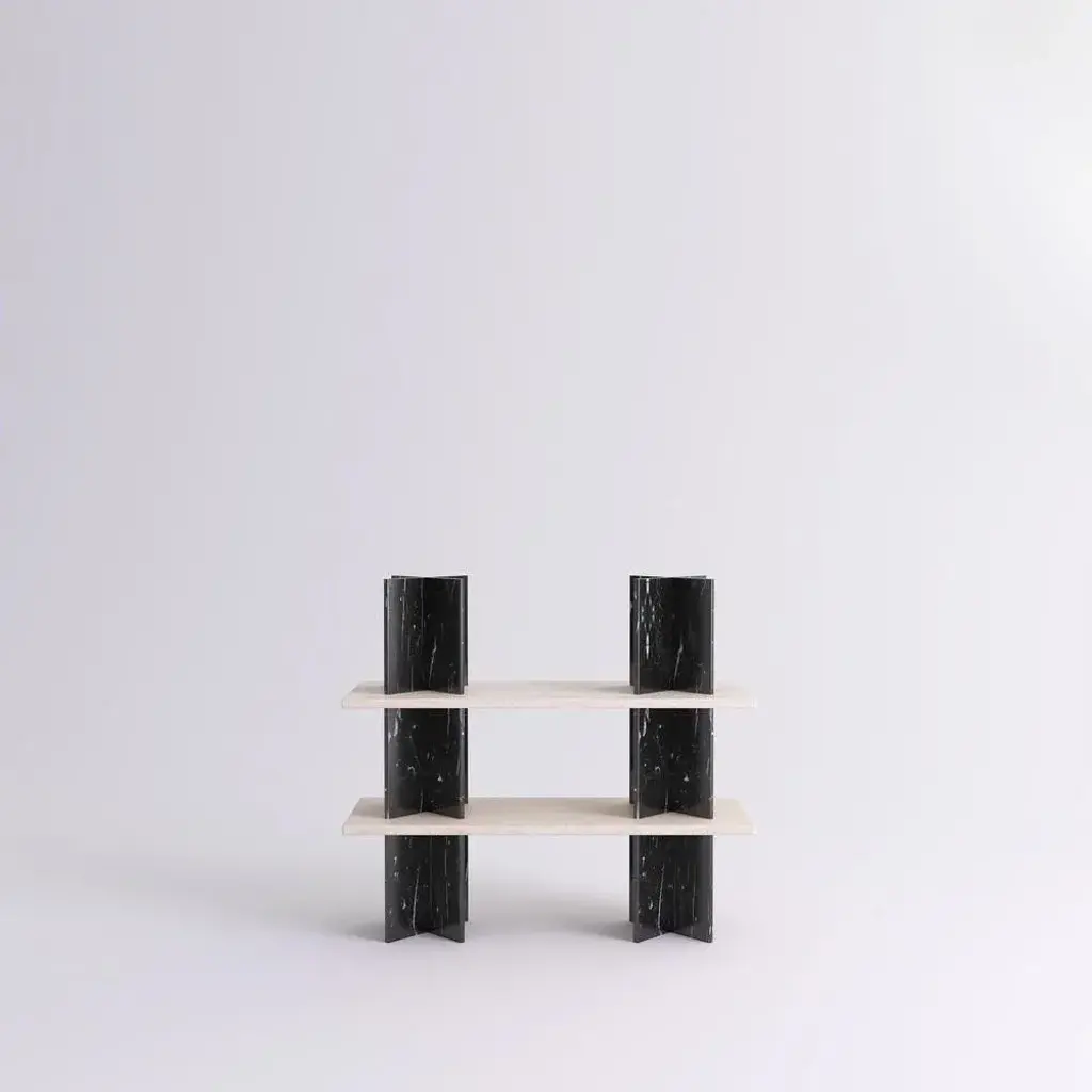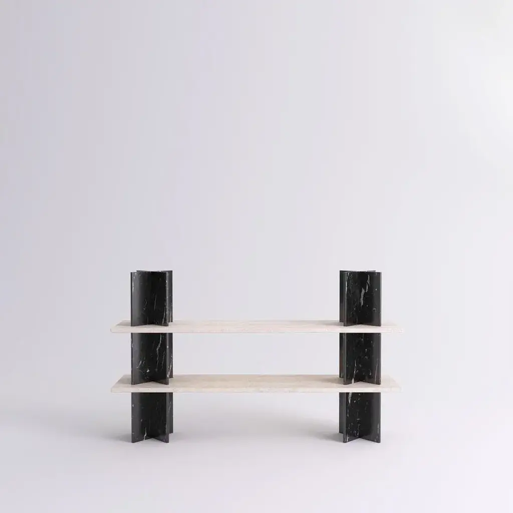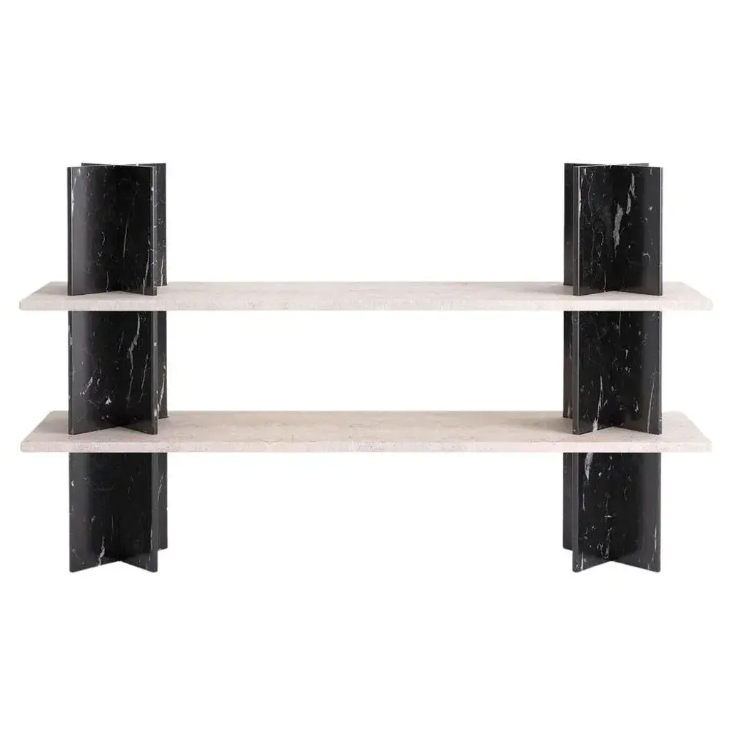 Monument shelves by mathieu girard & gauthier pouillart. Dimensions: l 195 x h 117. Materials: white travertine shelves - black marble (marquina) columns. Material available: birchwood, white marble, green marble, black marble, pele de tigre marble, travertine marble, dimensions available: h 197 x l 130 cm, h 117 x l 130 cm, h 197 x l130 cm, h 197 x l 195 cm. Monument is a collection of shelving units that combine wood and marble. This piece was imagined by mathieu girard et gauthier pouillart of atelier cocorico. The visual strength and stability of monument relies on an ingenious construction system that does not require any tool. The result is a brutalist, material centered piece with a strong sculptural presence. The two imposing “cross” columns that constitute the superstructure are the visual signature of the shelf, but also present and enhance beautiful objects or books. The monument system come in a large variety of dimensions and it is possible to make mono material shelfs or combine marble and wood. Mathieu girard ans gauthier pouillart are both graduated of the ecole bleue in paris in 2010 and 2011, a multidisciplinary training about the fields of design. They founded cocorico paris at the end of 2011. This design agency appreciates contemporary challenges, and develops unique stories for several companies in many fileds of action, like hospitality, offices, coworking, restaurant or shopping facilities. This piece is attributed to the mentioned designer/maker. It has no attribution mark and no official proof of authenticity, however it is well documented in design history. I take full responsibility for any authenticity issues arising from misattribution