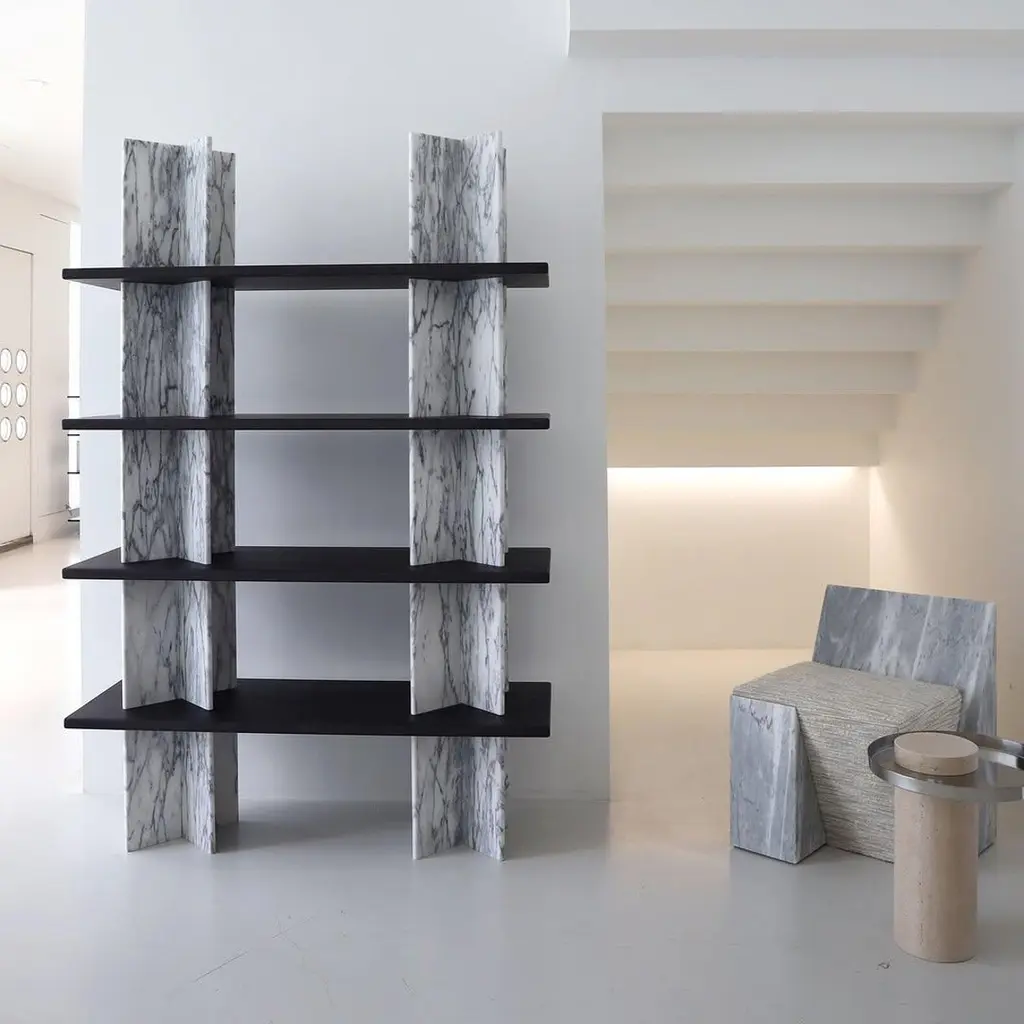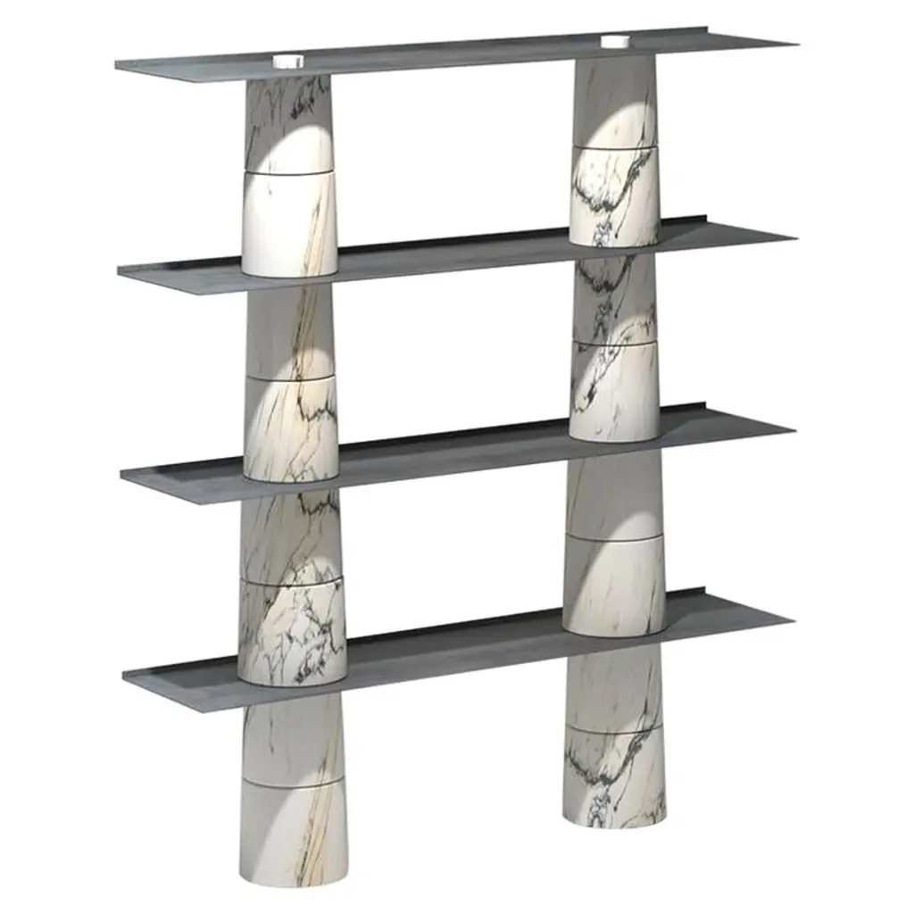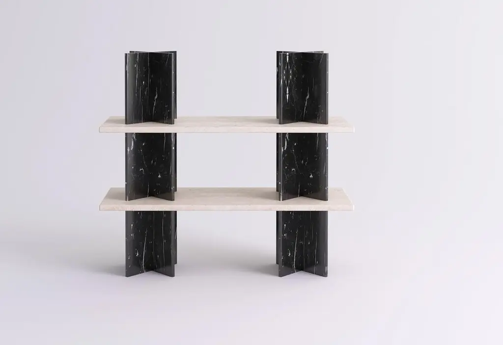 Monument Shelves In Black Marquina by Mathieu Girard & Gauthier PouillartDimensions: L 130 x H 117Materials: White travertine shelves - black marble (marquina) columnsMaterial available: Birchwood, white marble, green marble, black marble, Pele de tigre marble, travertine marble, Dimensions available: H 197 x L 130 cm, H 117 x L 130 cm, H 197 x L130 cm, H 197 x L 195 cm Monument is a collection of shelving units that combine wood and marble. This piece was imagined by Mathieu Girard et Gauthier Pouillart of Atelier Cocorico. The visual strength and stability of Monument relies on an ingenious construction system that does not require any tool. The result is a brutalist, material centered piece with a strong sculptural presence.The two imposing “cross” columns that constitute the superstructure are the visual signature of the shelf, but also present and enhance beautiful objects or books.The monument system come in a large variety of dimensions and it is possible to make mono material shelfs or combine marble and wood. Mathieu Girard ans Gauthier Pouillart are both graduated of the Ecole Bleue in Paris in 2010 and 2011, a multidisciplinary training about the fields of design.They founded Cocorico Paris at the end of 2011. This design agency appreciates contemporary challenges, and develops unique stories for several companies in many fileds of action, like hospitality, offices, coworking, restaurant or shopping facilities.