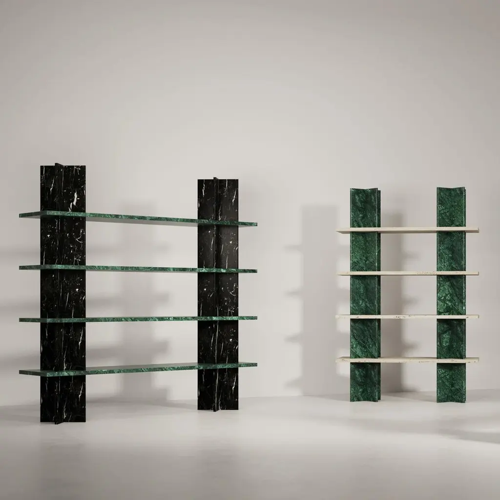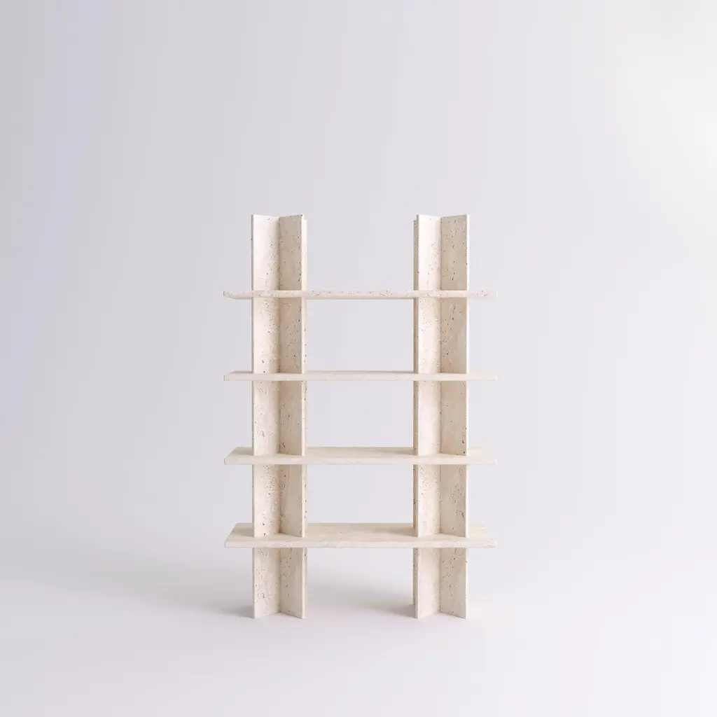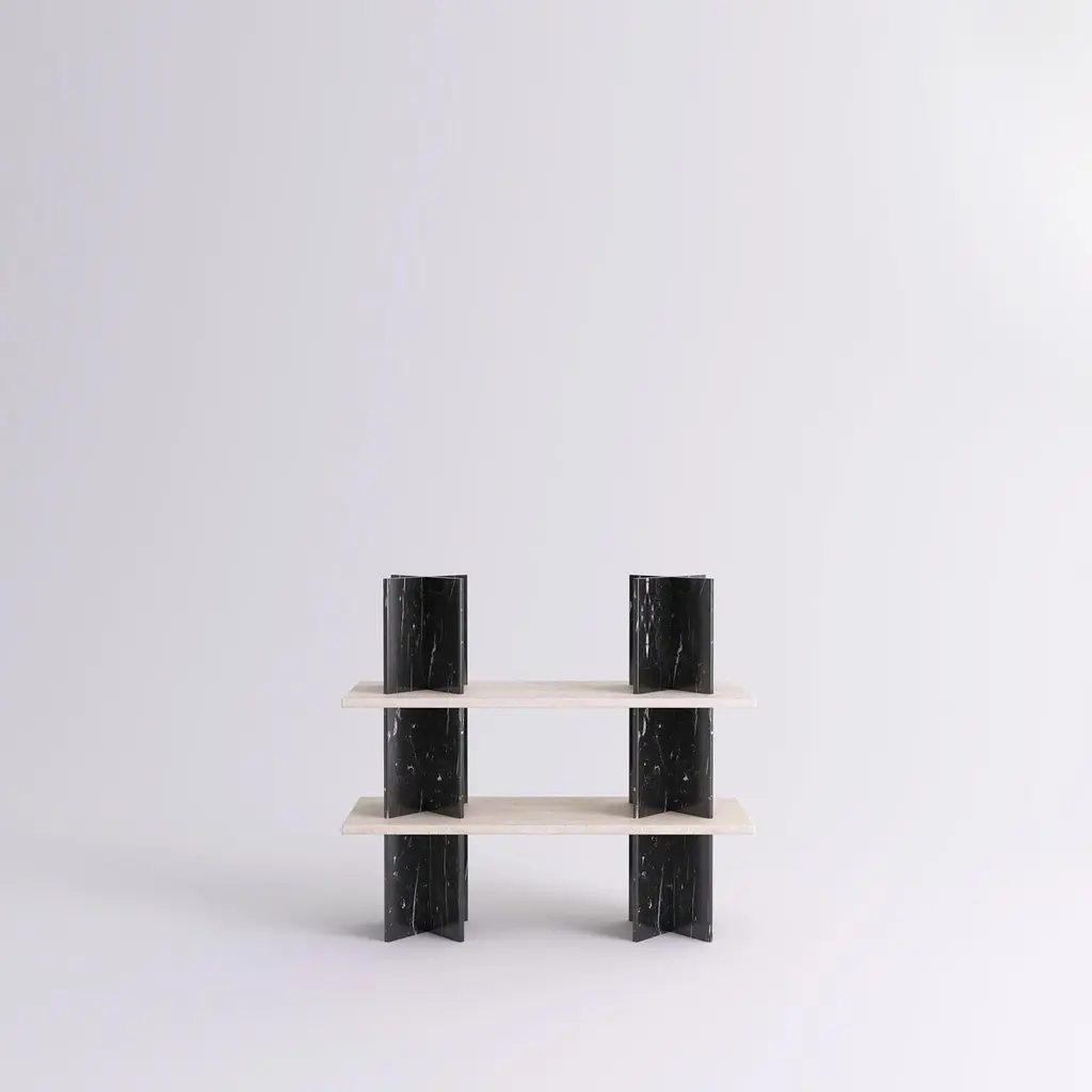 Monument Shelves in White Travertine by Mathieu Girard & Gauthier PouillartDimensions: L 130 x H 117Materials: white travertine shelves and columns Material available: Birchwood, white marble, green marble, black marble, Pele de tigre marble, Travertine marble, Dimensions available: H 197 x L 130 cm, H 117 x L 130 cm, H 197 x L130 cm, H 197 x L 195 cm Monument is a collection of shelving units that combine wood and marble. This piece was imagined by Mathieu Girard et Gauthier Pouillart of Atelier Cocorico. The visual strength and stability of Monument relies on an ingenious construction system that does not require any tool. The result is a brutalist, material centered piece with a strong sculptural presence.The two imposing “cross” columns that constitute the superstructure are the visual signature of the shelf, but also present and enhance beautiful objects or books.The monument system come in a large variety of dimensions and it is possible to make mono material shelfs or combine marble and wood. Mathieu Girard ans Gauthier Pouillart are both graduated of the Ecole Bleue in Paris in 2010 and 2011, a multidisciplinary training about the fields of design.They founded Cocorico Paris at the end of 2011. This design agency appreciates contemporary challenges, and develops unique stories for several companies in many fileds of action, like hospitality, offices, coworking, restaurant or shopping facilities.