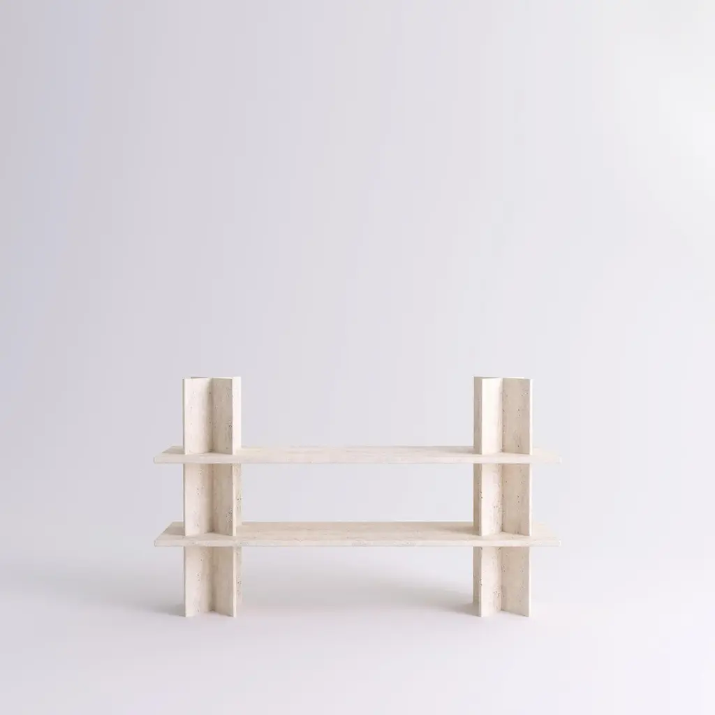 Monument Shelves in White Travertine by Mathieu Girard & Gauthier PouillartDimensions: L 195 x H 117. x D 45 cmMaterials: White travertine shelves and columns.Material available: Birchwood, white marble, green marble, black marble, Pele de tigre marble, Travertine marble, Dimensions available: H 197 x L 130 cm, H 117 x L 130 cm, H 197 x L130 cm, H 197 x L 195 cm. Monument is a collection of shelving units that combine wood and marble. This piece was imagined by Mathieu Girard et Gauthier Pouillart of Atelier Cocorico. The visual strength and stability of Monument relies on an ingenious construction system that does not require any tool. The result is a brutalist, material centered piece with a strong sculptural presence.The two imposing “cross” columns that constitute the superstructure are the visual signature of the shelf, but also present and enhance beautiful objects or books.The monument system come in a large variety of dimensions and it is possible to make mono material shelfs or combine marble and wood. Mathieu Girard ans Gauthier Pouillart are both graduated of the Ecole Bleue in Paris in 2010 and 2011, a multidisciplinary training about the fields of design.They founded Cocorico Paris at the end of 2011. This design agency appreciates contemporary challenges, and develops unique stories for several companies in many fileds of action, like hospitality, offices, coworking, restaurant or shopping facilities.