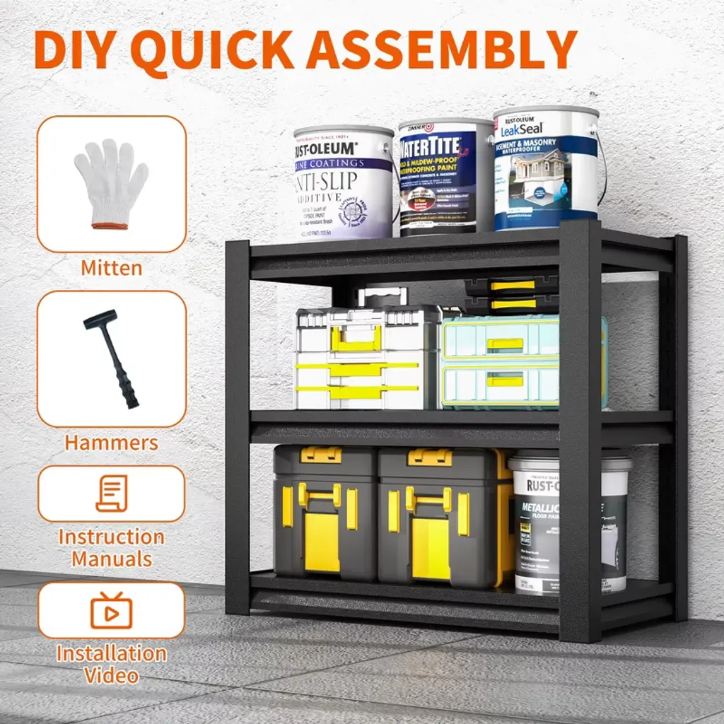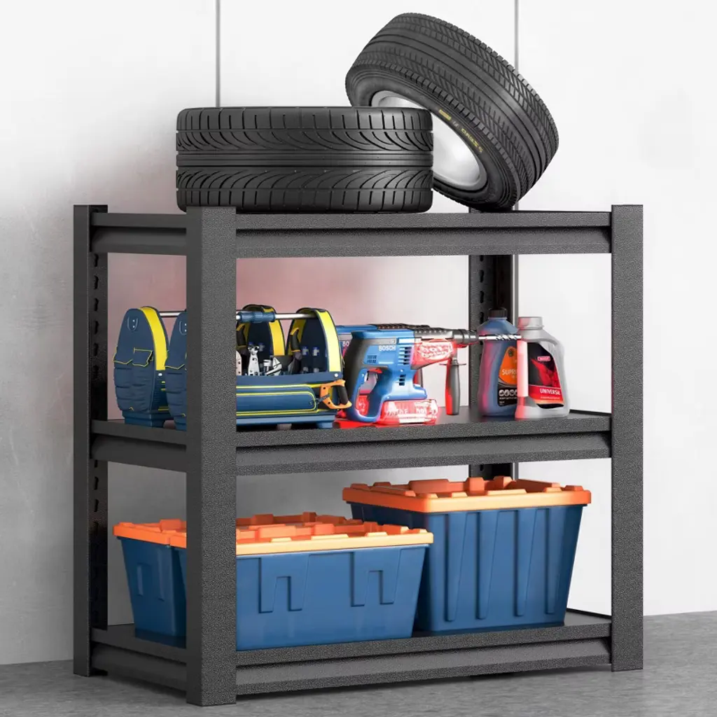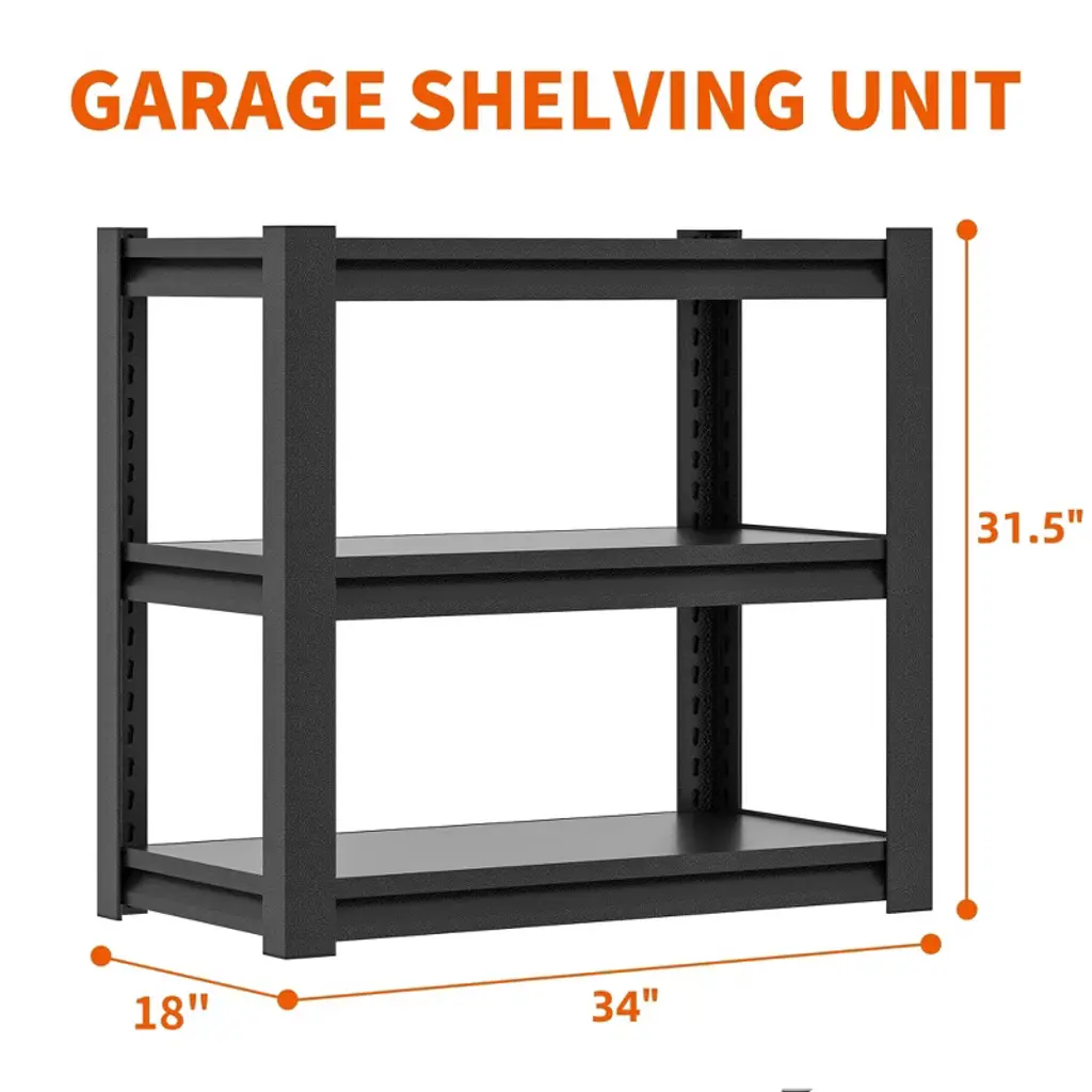 This 3-tier garage shelving unit delivers robust storage in a space-efficient design. The steel unit (18"D x 34"W x 31.5"H) supports 1200lbs total, with each shelf holding 400lbs—ideal for oil drums, tires, or heavy toolboxes. Double-layer metal shelves and reinforced support beams prevent bending, while the phosphated powder coating resists rust, scratches, and moisture. An adjustable interlocking system lets you customize shelf height to fit various items, and rounded edges enhance safety. Assembly takes just 15 minutes with the included hammer and gloves—no tools required. Shipped with a 1-year warranty, this shelving unit transforms cluttered garages, basements, or workshops into organized spaces.