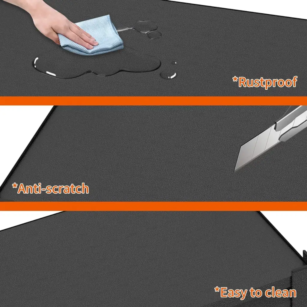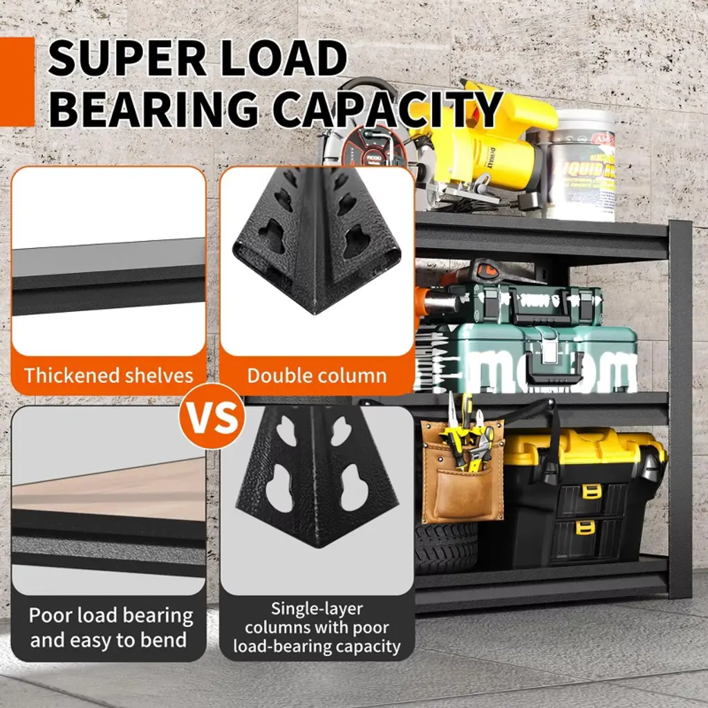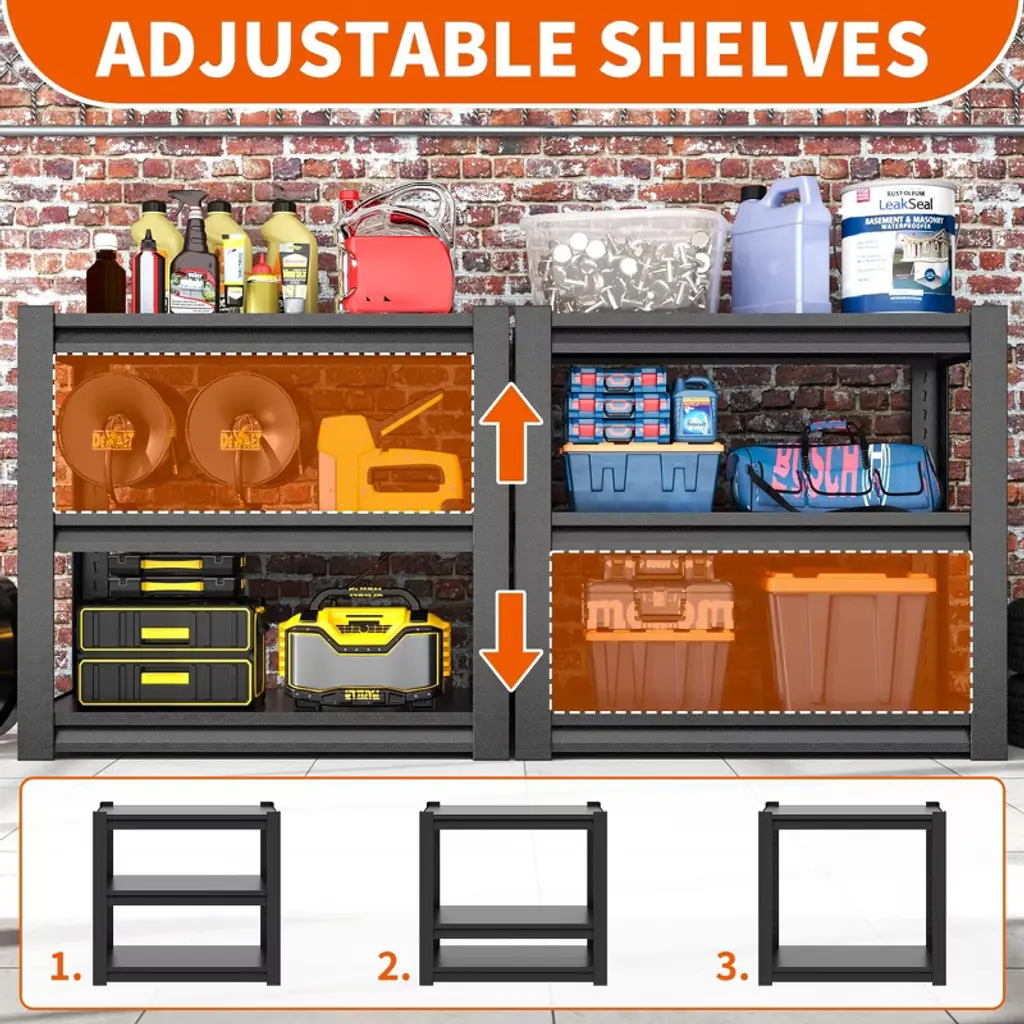 This 3-tier garage shelving unit delivers robust storage in a space-efficient design. The steel unit (18"D x 34"W x 31.5"H) supports 1200lbs total, with each shelf holding 400lbs—ideal for oil drums, tires, or heavy toolboxes. Double-layer metal shelves and reinforced support beams prevent bending, while the phosphated powder coating resists rust, scratches, and moisture. An adjustable interlocking system lets you customize shelf height to fit various items, and rounded edges enhance safety. Assembly takes just 15 minutes with the included hammer and gloves—no tools required. Shipped with a 1-year warranty, this shelving unit transforms cluttered garages, basements, or workshops into organized spaces.